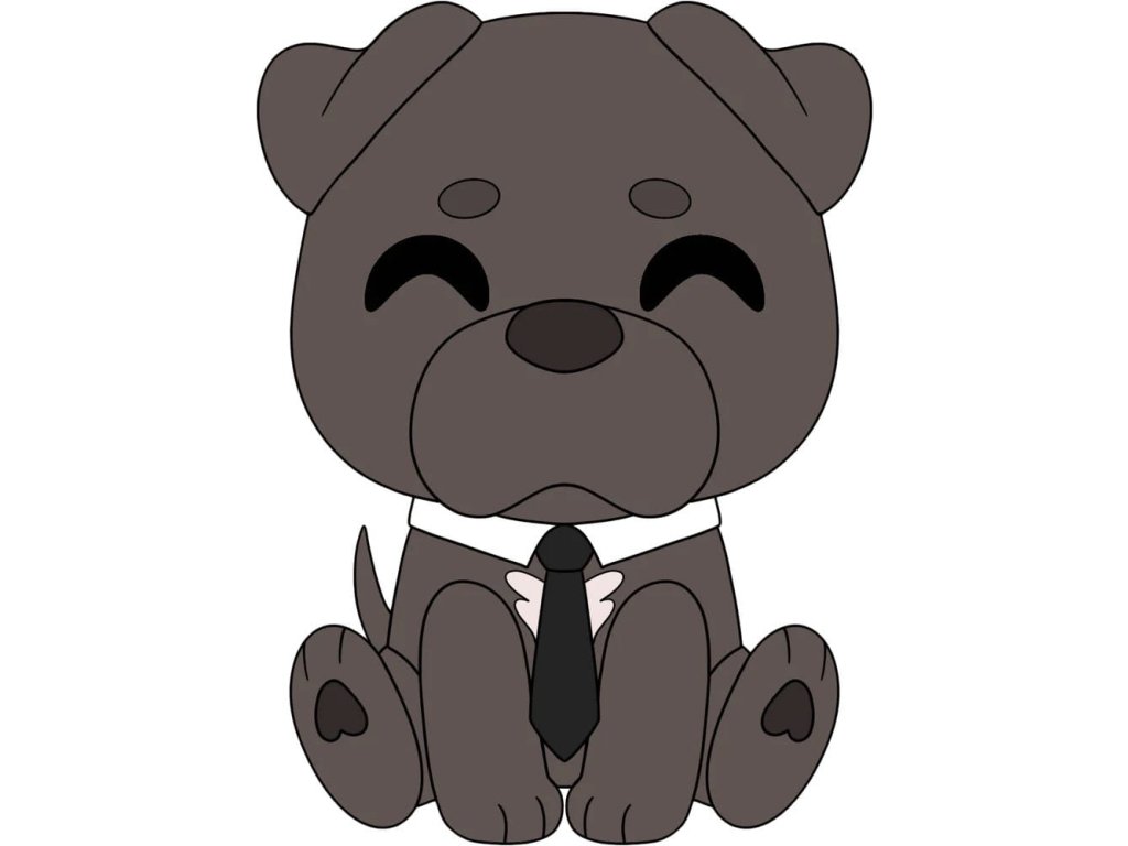 Je vysoký 22 cm, má nejroztomilejší uši, které mu plandají na šedohnědé hlavě, a široký čenich s dokonalým oválným čumákem, takže se na vás dívá s tím nejroztomilejším výrazem ve tváři! Nosí bílý oblek a dlouhou černou kravatu, která mu visí přes označení na hrudi, sedí se dvěma zadníma nohama vykopnutýma dopředu, aby odhalil nejroztomilejší polštářky tlapek ve tvaru srdce, zatímco spokojeně vrtí dlouhým ocáskem!