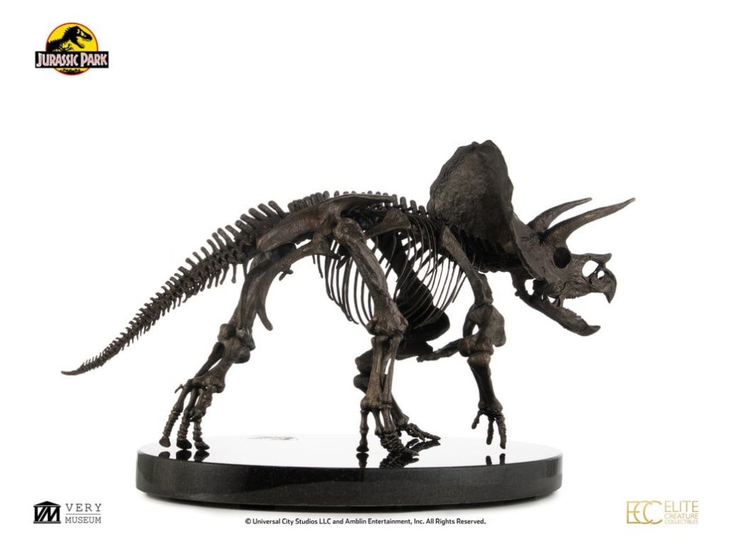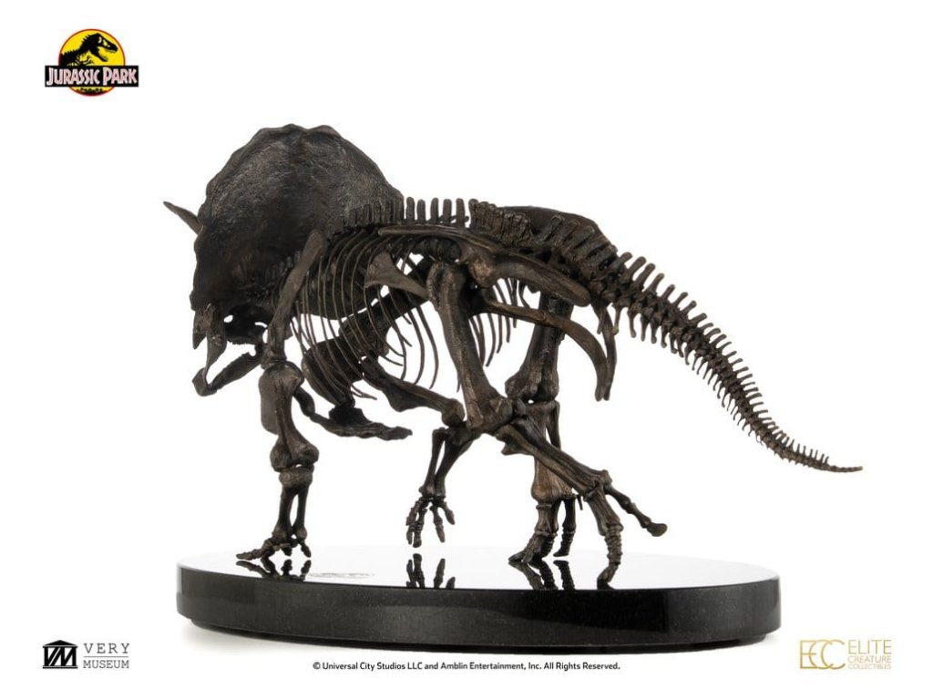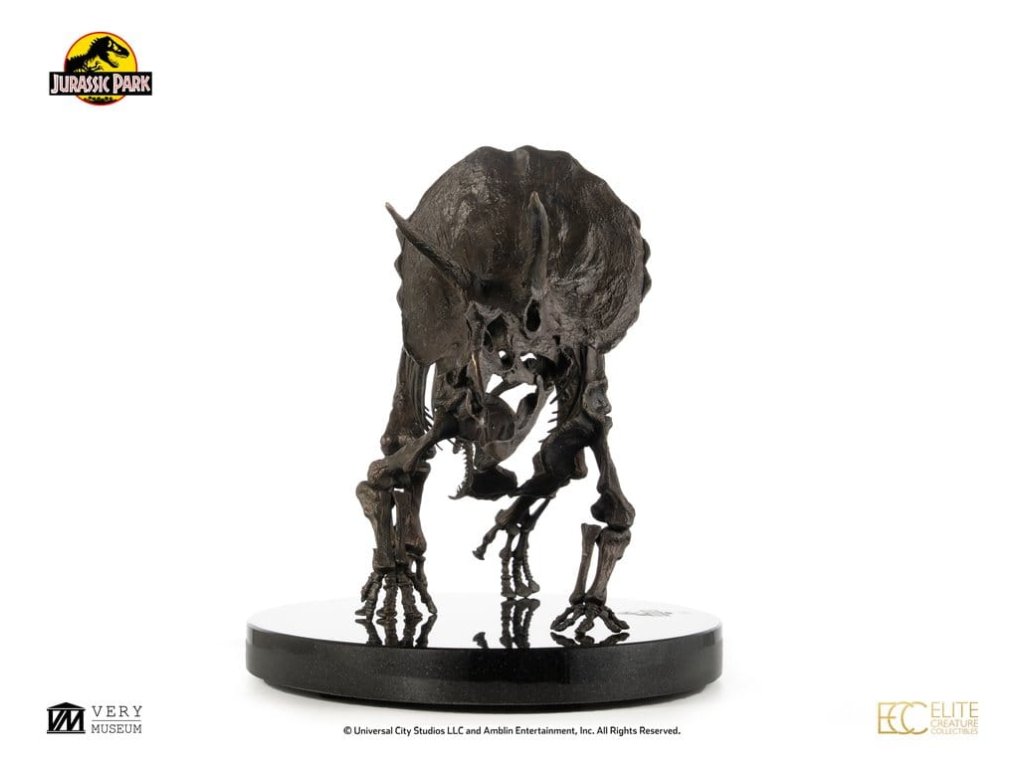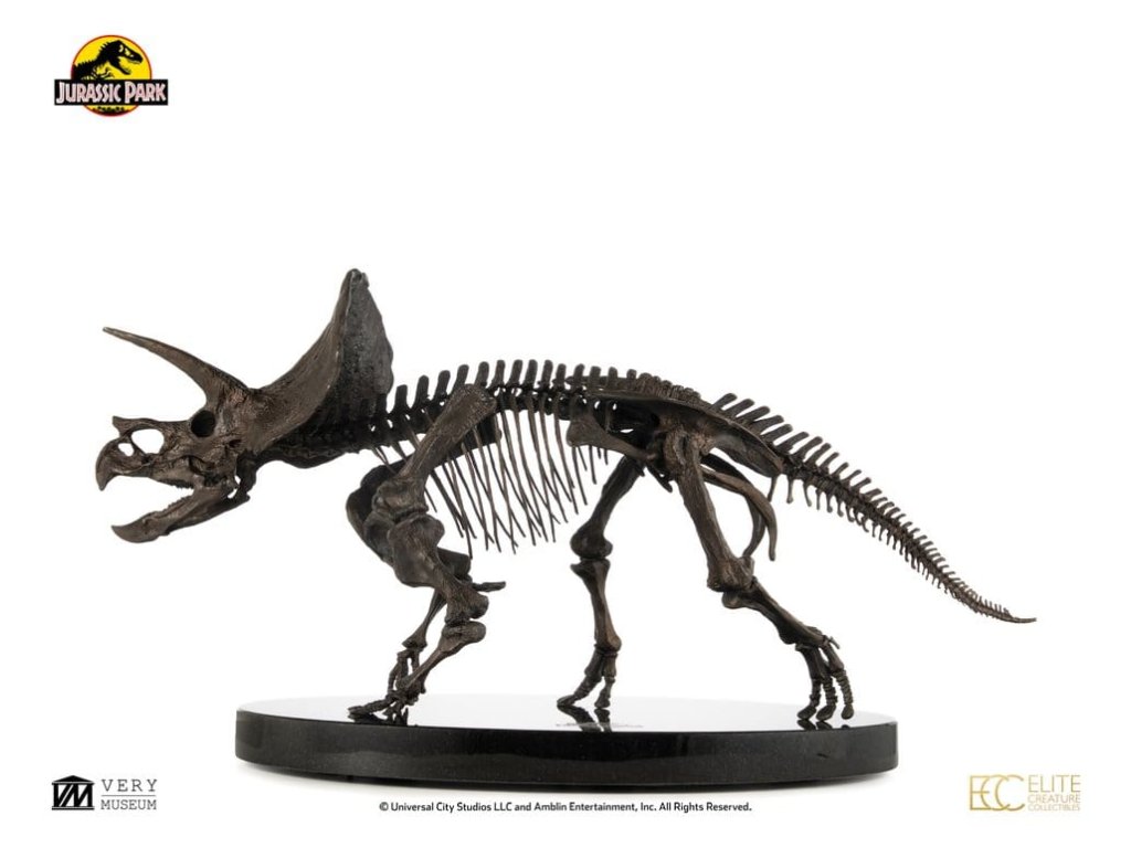 Triceratops je vyhynulý rod býložravého dinosaura z podčeledi chasmosaurini z čeledi rohatých dinosaurů ceratopsidů, který žil v Severní Americe v období pozdní křídy. Je také jedním ze čtyř dinosaurů, kteří se objevili ve všech filmech Jurský svět. Mezi nejvýznamnější objevené fosilie dinosaurů patří právě fosilie Triceratopse, který se v Jurských filmech objevuje jen krátce, avšak jeho výstup je vždy pamětihodný.Elite Creature Collectibles s hrdostí představuje Triceratops Fossil Skeleton v měřítku 1:12 ve bronzovém provedení. Uznávaný umělec Bitan z ILM, který měl možnost pracovat s fosilními sbírkami muzeí, věrně zrekonstruoval kostru triceratopa, přičemž nejen vycházel z reálných fosilních referencí, ale také přesně kopíroval anatomický design viděný na filmovém plátně.Tento úchvatný kus je pečlivě zpracován z výtvarného bronzu s patinou ve vzoru fosilii a je namontován na elegantním mramorovém podstavci. Specifikace: - Výška cca 33 cm - Šířka cca 60 cm - Hloubka cca 29 cm - Výtvarný bronz s mramorovým podstavcem - Součástí je Certifikát o autentičnosti podepsaný Bitanem - Výrobek na objednávku - LIMITOVANÁ EDICE: Počet kusů je celosvětově omezen na 30. Orientační datum vydání: listopad 2026