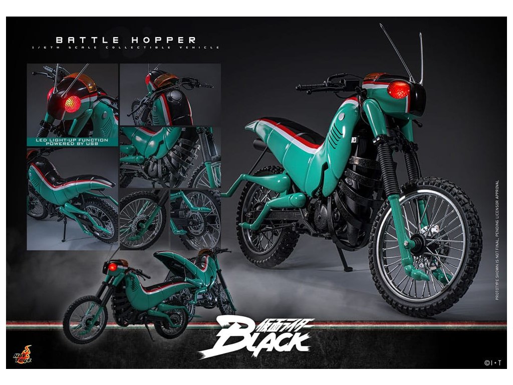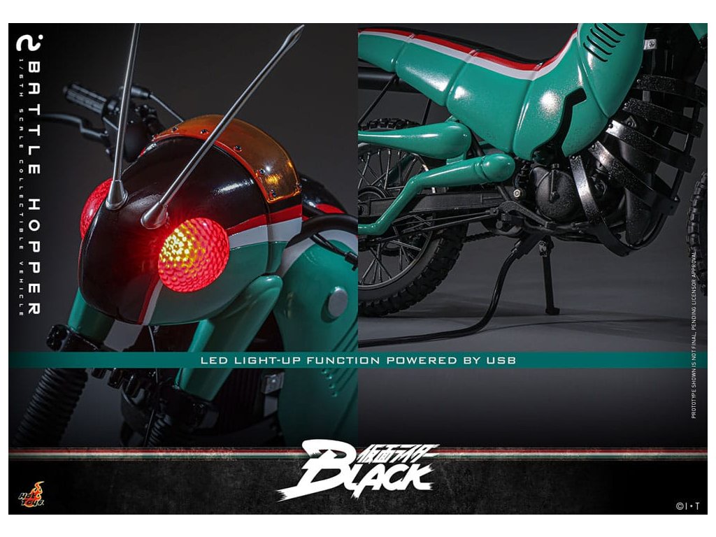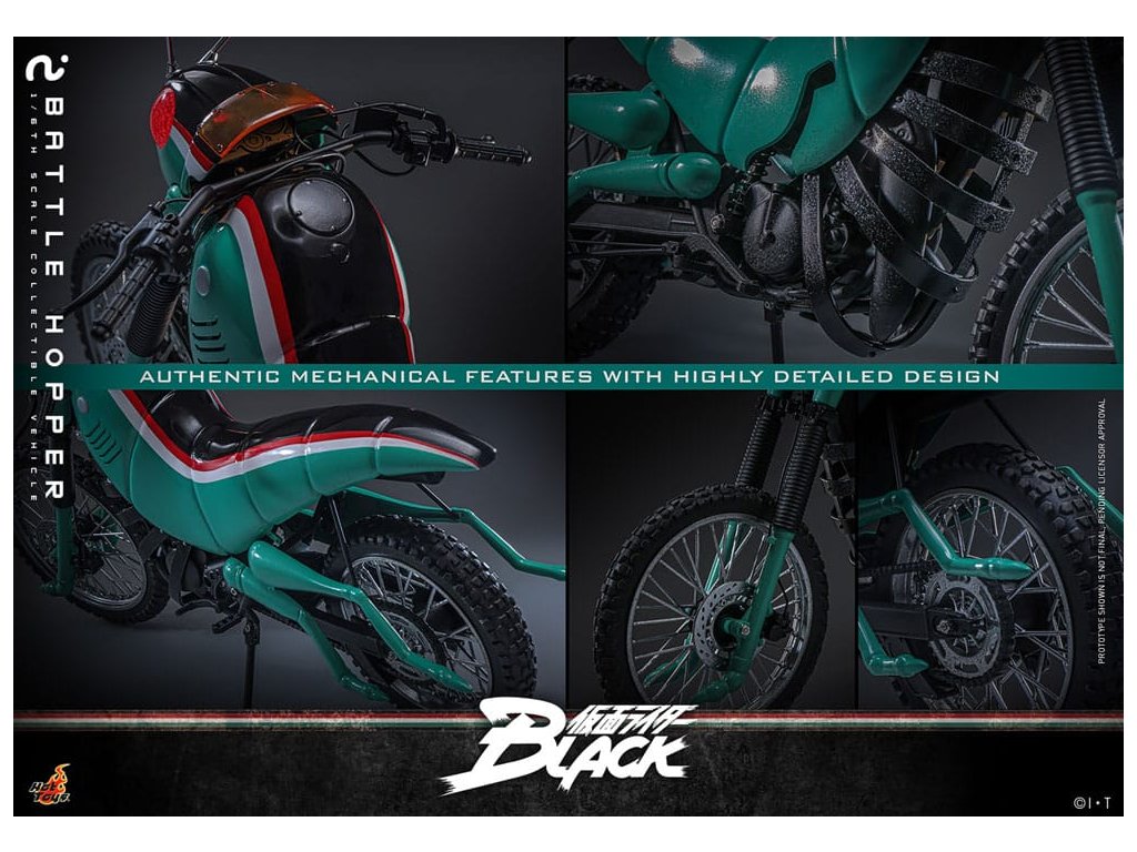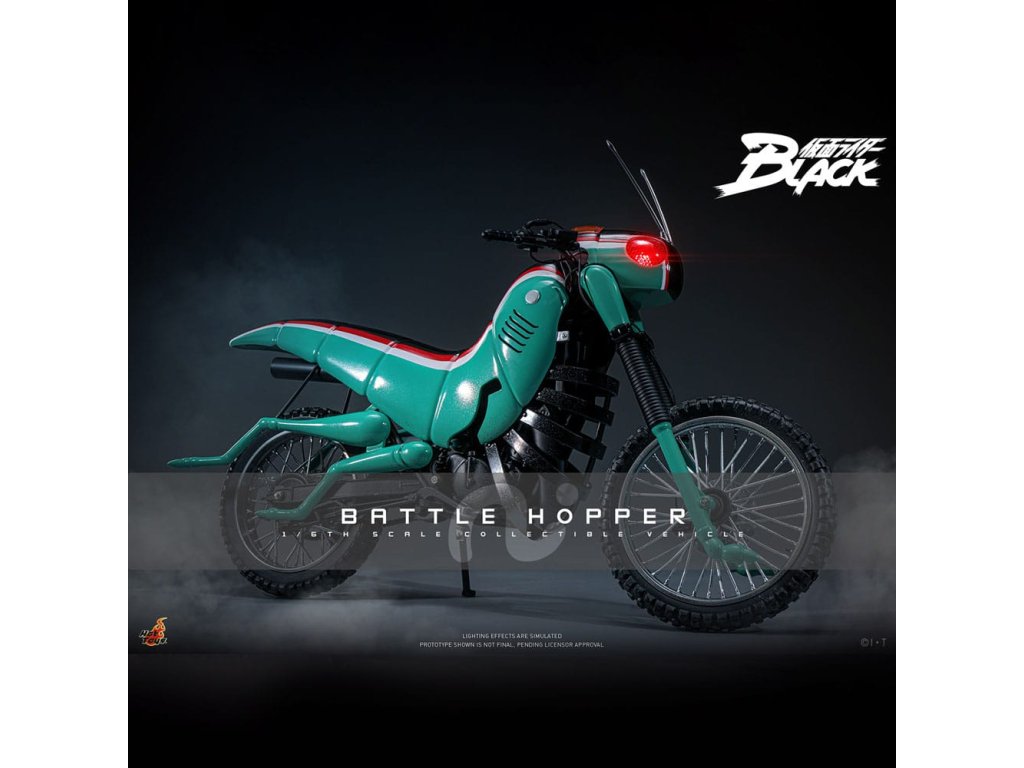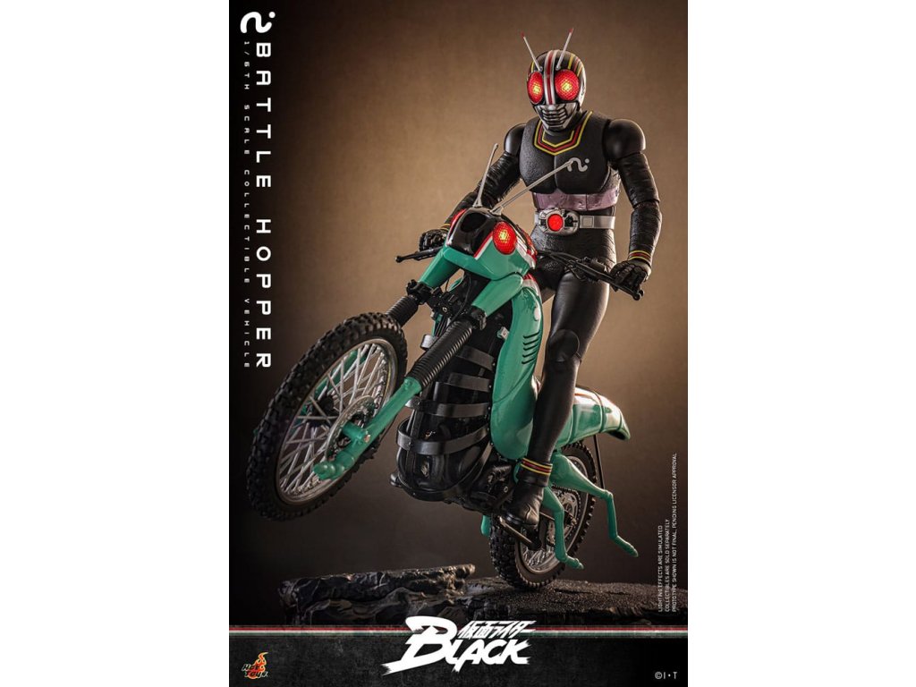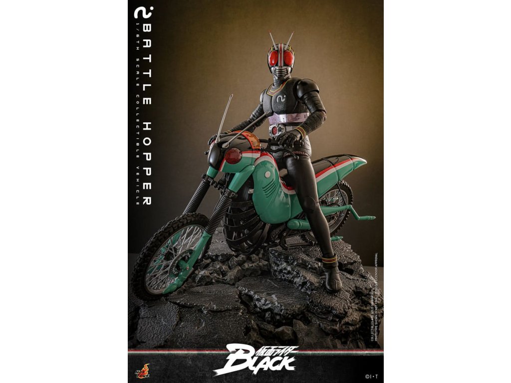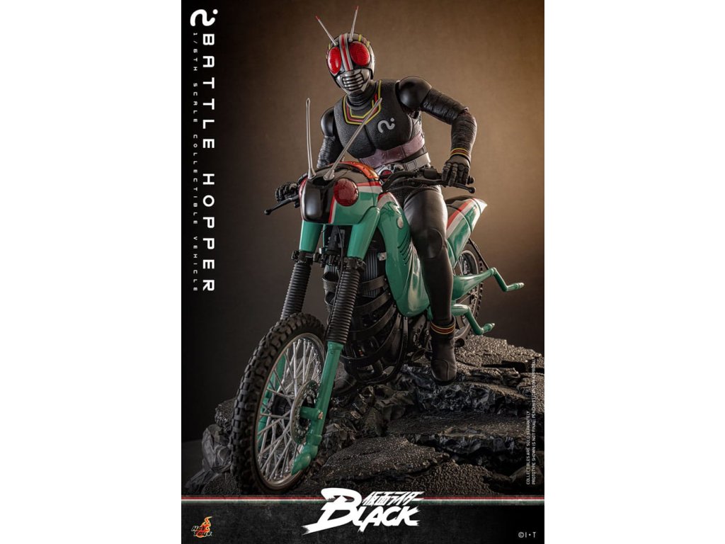 V klasické sérii Kamen Rider Black z roku 1987 je Battle Hopper víc než jen motorka, je to živý, loajální partner Kotaro Minamiho. Stvořený společností Gorgom pro Kings of the Century, tento koníček inspirovaný Rider Machine pomáhá Kotarovi v dramatickém útěku z kultu a podporuje ho v nespočetných bitvách. Battle Hopper má schopnost se zahojit, když je zraněn a dokáže se postavit, když je převrácen. S těmito pozoruhodnými schopnostmi se vyprofiloval jako pravý druh Kotarovi. Během závěrečného souboje utrpěl Battle Hopper těžké škody, získal tak hrdinské rozloučení a upevnil své místo jako pravá legenda. Sideshow a Hot Toys s nadšením představují sběratelské vozidlo Battle Hopper ve škále 1/6. Jde o věrný a podrobně vypracovaný hold této ikonické Rider Machine. Model dlouhý přibližně 36 cm, široký 14 cm a vysoký 21 cm představuje autentické mechanické funkce od motoru, rámu, výfuku až po stojany. Battle Hopper je jemně natřený lesklými zelenými, rudými a bílými barvami. Exteriér inspirovaný kobylkou obsahuje dlouhé tykadla, kobylčí nohy a světla s LED červeným světlem, které napodobuje oči. Vlastnosti jako zadní odpružení a otáčecí kola s pneumatikami znečištěnými prachem ukazují mistrovské řemeslo. Toto sběratelské vozidlo je dokonale velké tak, aby doplňovalo Kamen Rider Black Sixth Scale Figurku. Společně jsou připraveni bojovat a znovu vytvářet klasický speciální pohyb na kolečku! Zachycuje každý ikonický prvek a nostalgický okamžik a zajišťuje, že žádná sbírka Riderů není kompletní bez Kotarova neohroženého průvodce. Rozměr výrobku: 21 x 14 x 36 cm. Figurka Kamen Rider není součástí balení.