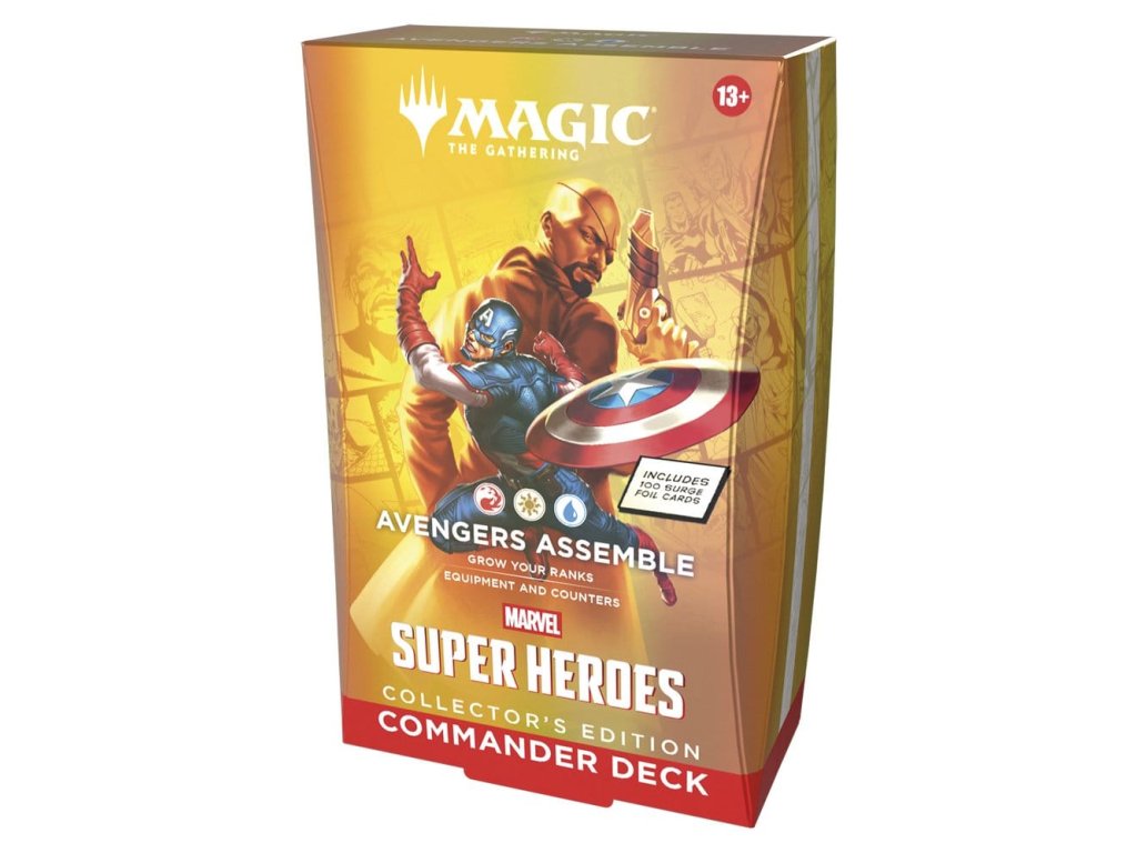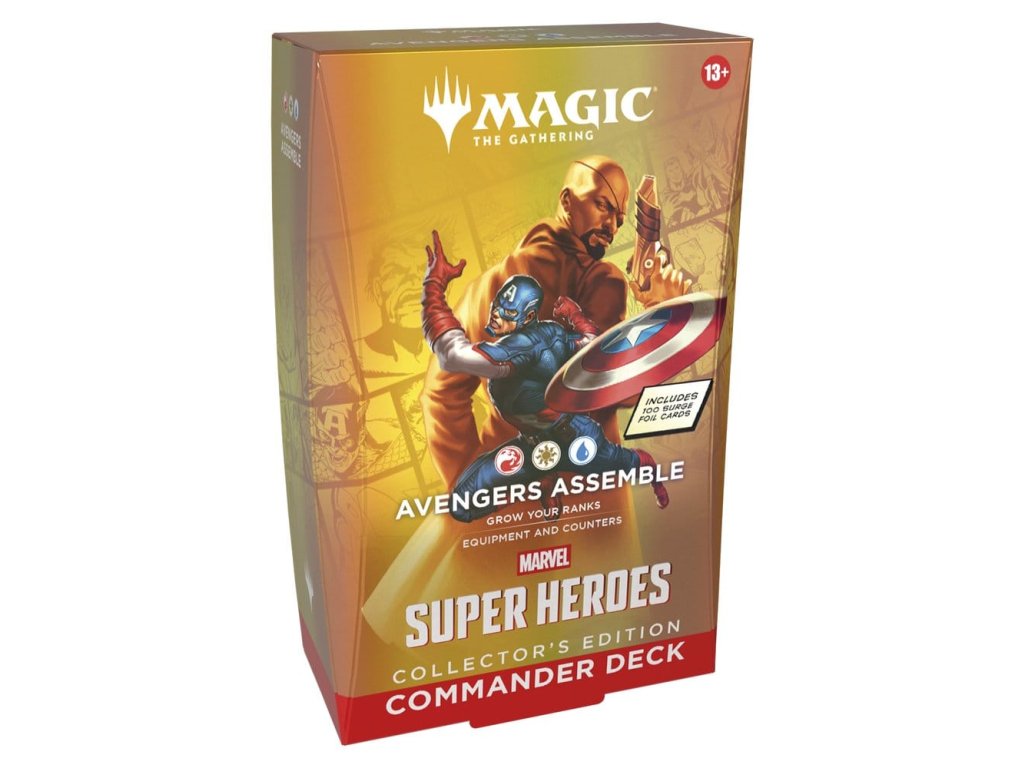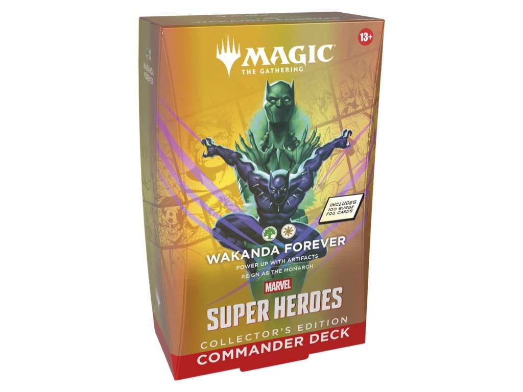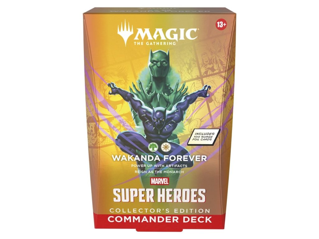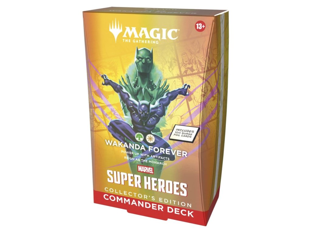 Balíčky pro hru Commander jsou připraveny k hraní hned po vybalení a obsahují vše, co potřebujete pro hraní nejpopulárnějšího multiplayerového formátu Magic. Magic: The Gathering | Marvel Super Heroes balíčky pro hru Commander Collector's Edition představují čtyři různé verze balíčku Commander a každý z nich obsahuje 100 karet z jiskřivé folie. Vesmír Marvel dorazil v plné síle! Hvězdná sestava těžkých hráčů skáče z komiksů do bojiště a osud světa je na vážkách. Postavte si svůj vysněný supertým hrdinů a záporáků, vyzbrojte je ikonickým vybavením a uvolněte jejich zemětřesení schopnosti. Vznášejte se, udeřte a rozbijte cestu k vítězství v Magic: The Gathering | Marvel Super Heroes! Obsah: 1 připravený balíček se 100 kartami Magic 10 dvoustranných token karet Krabice na karty Vložka se strategií Referenční karta.