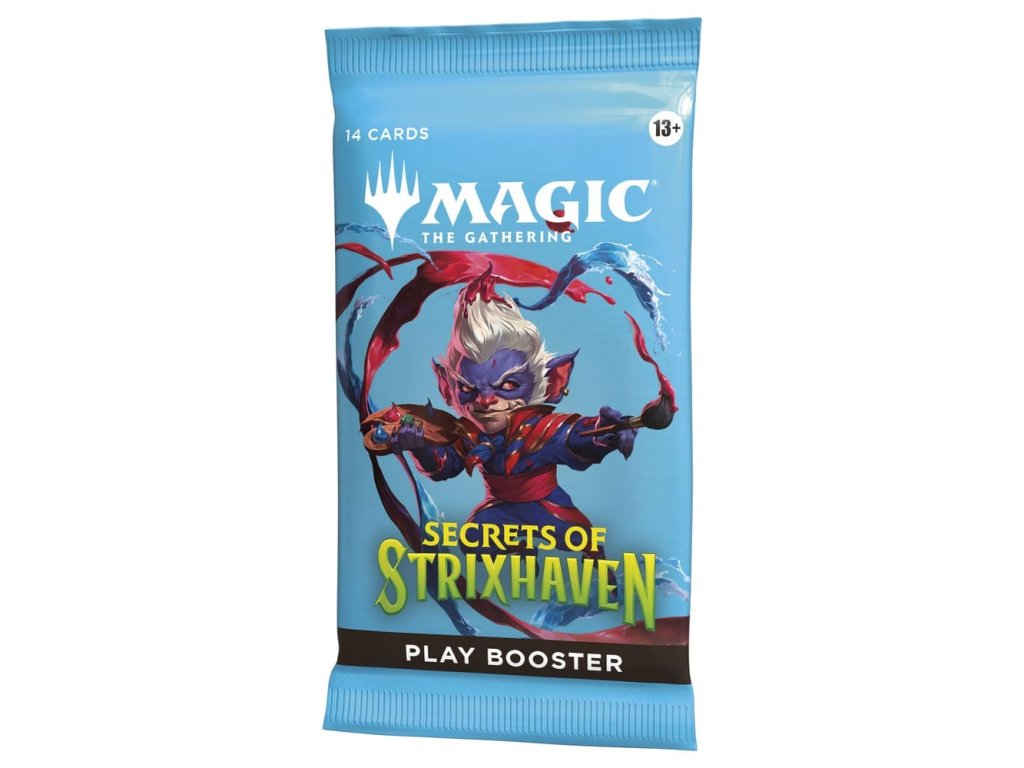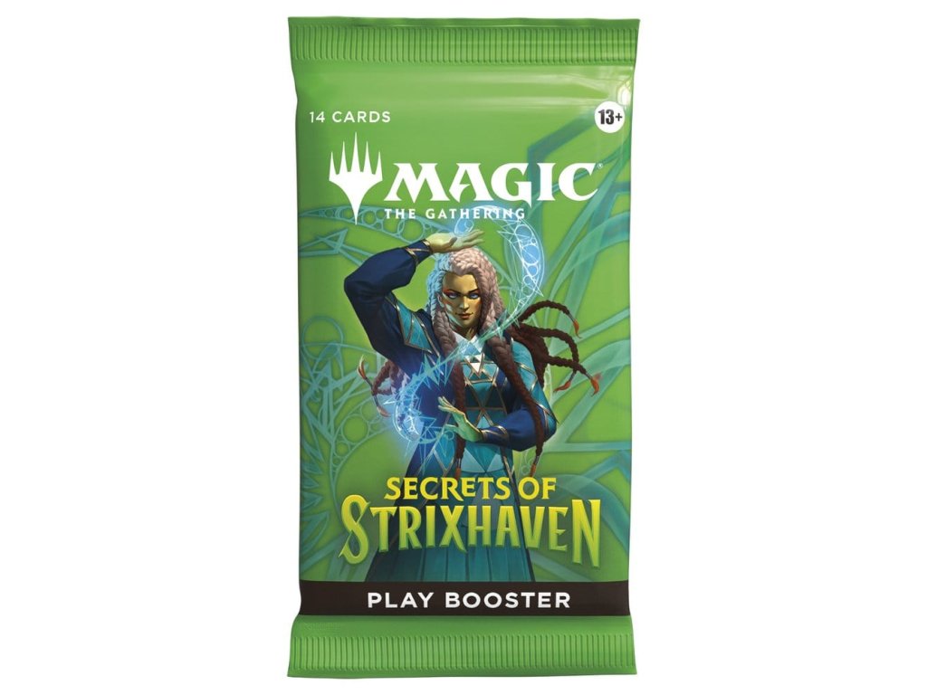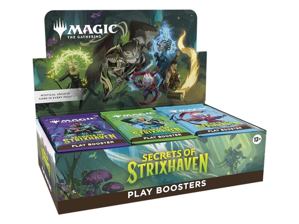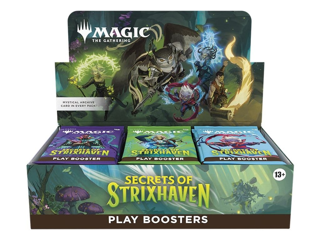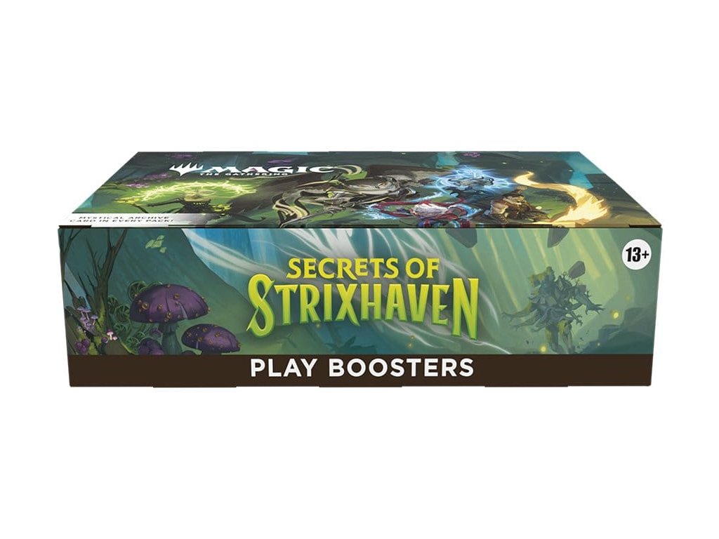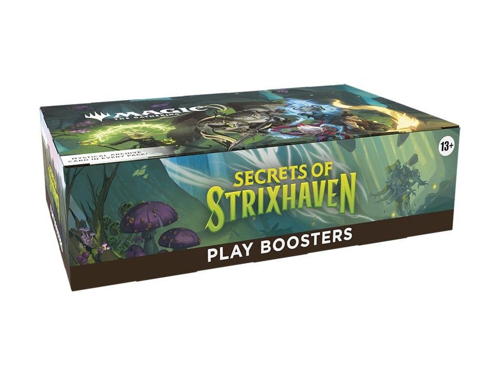 Posvátné sály Strixhavenu vás vítají zpět ve škole! Vyberte si svou fakultu kouzelnických studií a rozšiřte si vzdělání ve větším světě Arcavios. Odhalte starověká bojiště, monstrózní močály a mysl ohromující architekturu, když čelíte tajemným hrozbám sužujícím letadlo. Tato krabice Secrets of Strixhaven Play Booster obsahuje 30 herních boosterů, ideálních pro limitovanou hru i pro otevírání balíčků jen tak pro zábavu. Každý herní booster obsahuje 1–5 karet s raritou Rare nebo vyšší (2: 33 %, 3: 6 %, 4–5: <1 %) a 3–6 Uncommon, 5–8 Common a 1 Land karty. 1 karta jakékoliv rarity je tradiční Foil. Fólie bezrámečkového mytického mýtu v <1 % z boosterů. Tradiční fólie Land nahrazuje Land v 20 % z boosterů.
