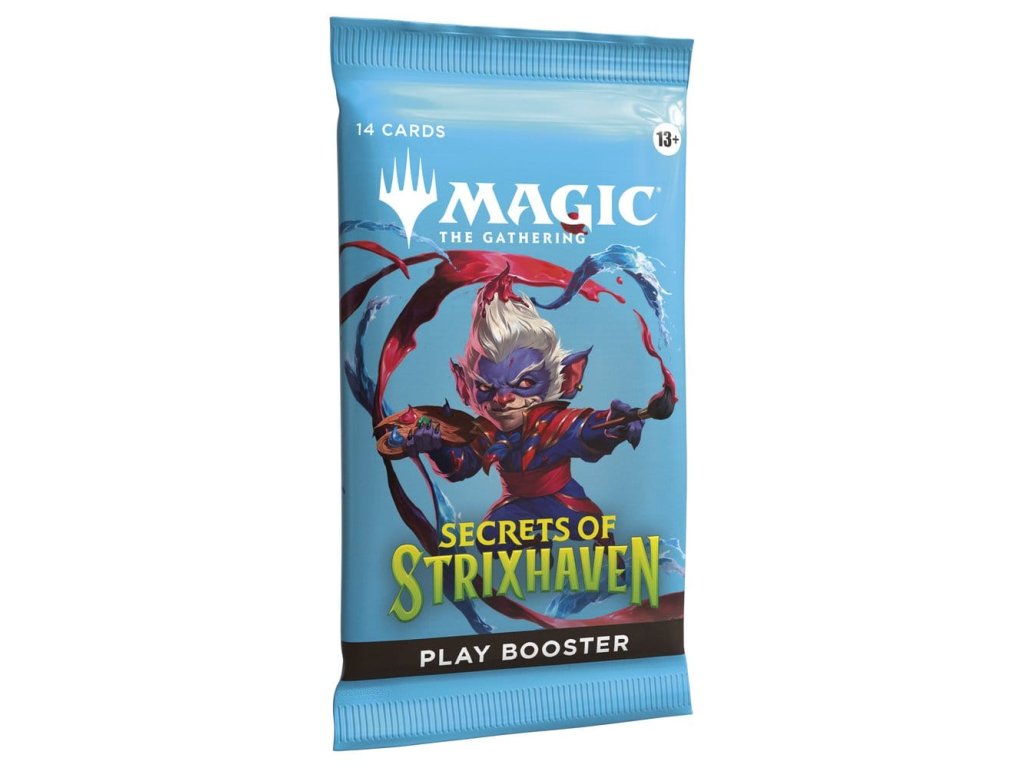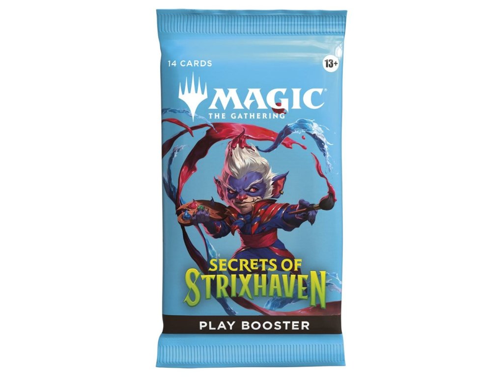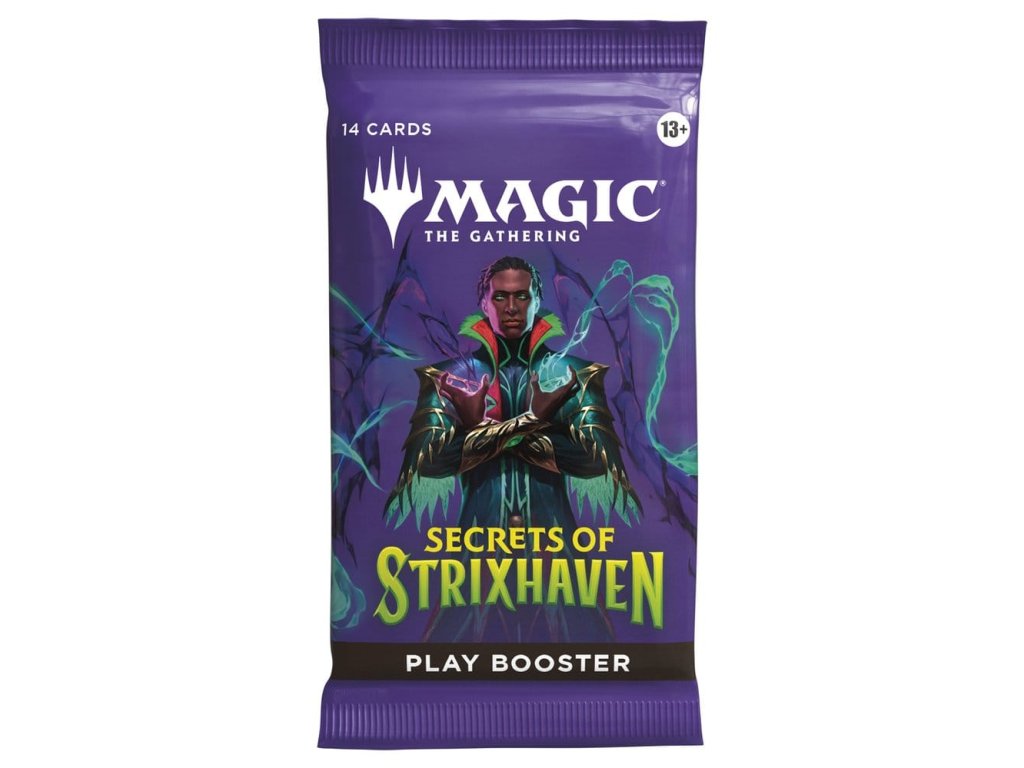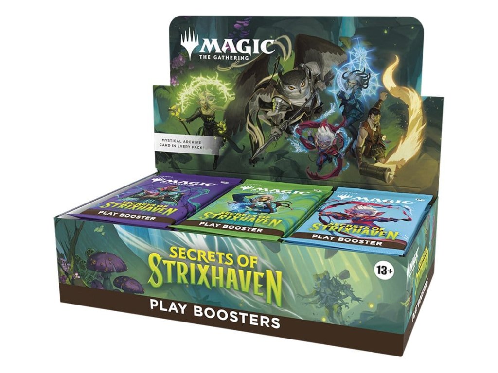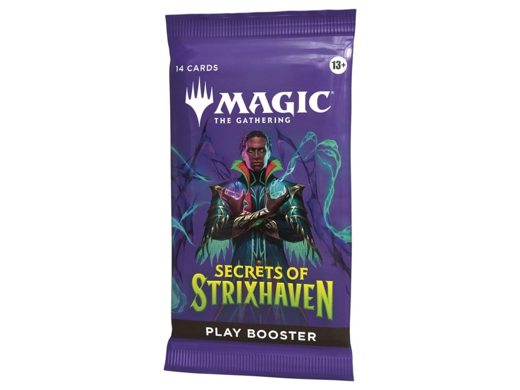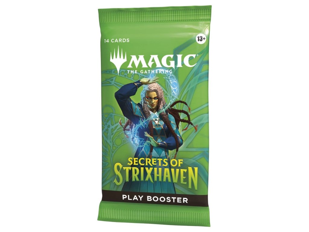 Posvátné sály Strixhavenu vás vítají zpět ve škole! Vyberte si svou fakultu kouzelnických studií a rozšiřte si vzdělání ve větším světě Arcavios. Odhalte starověká bojiště, monstrózní močály a mysl ohromující architekturu, když čelíte tajemným hrozbám sužujícím letadlo. Tato krabice Secrets of Strixhaven Play Booster obsahuje 30 herních boosterů, ideálních pro limitovanou hru i pro otevírání balíčků jen tak pro zábavu. Každý herní booster obsahuje 1–5 karet s raritou Rare nebo vyšší (2: 33 %, 3: 6 %, 4–5: <1 %) a 3–6 Uncommon, 5–8 Common a 1 Land karty. 1 karta jakékoliv rarity je tradiční Foil. Fólie bezrámečkového mytického mýtu v <1 % z boosterů. Tradiční fólie Land nahrazuje Land v 20 % z boosterů.