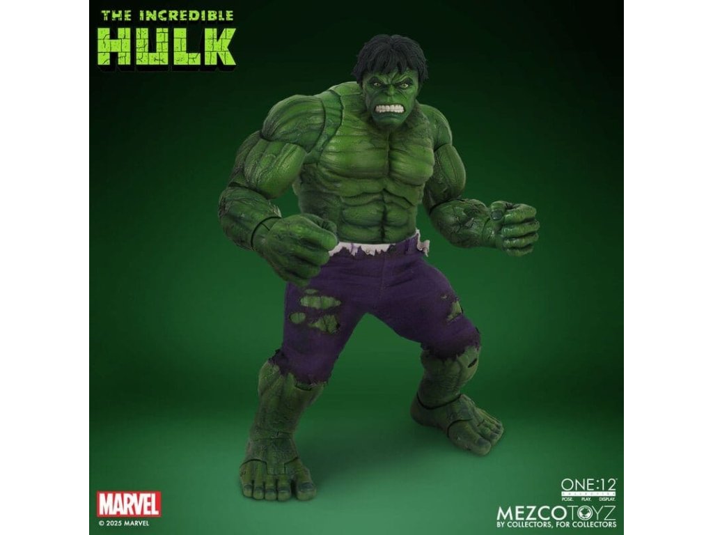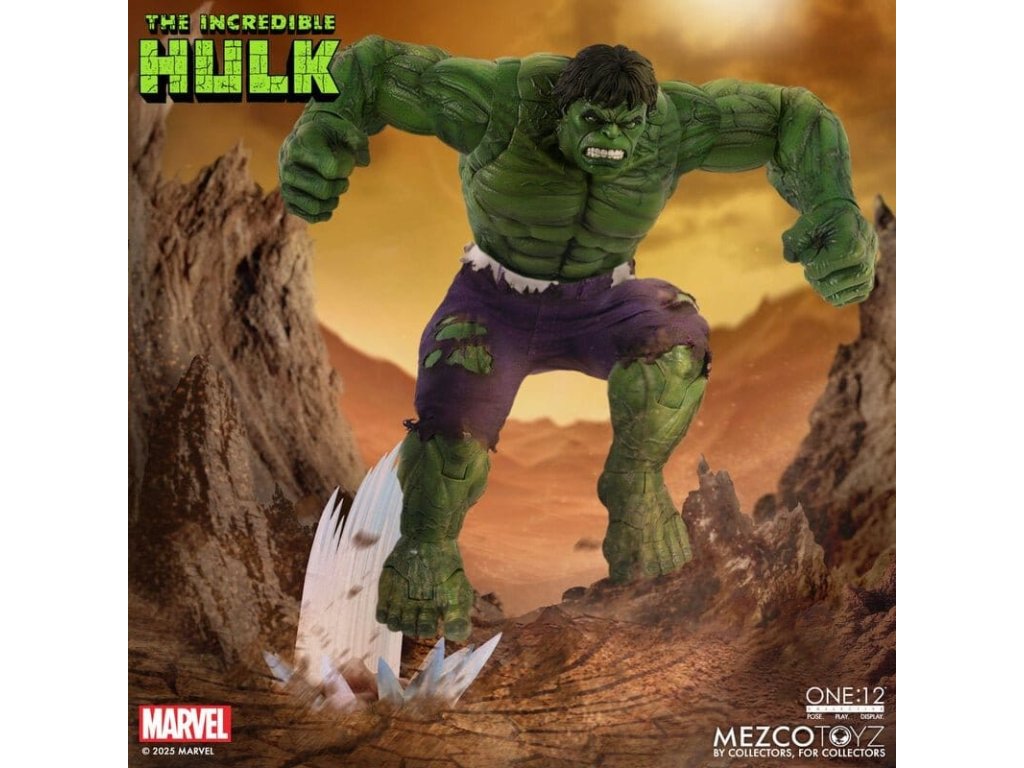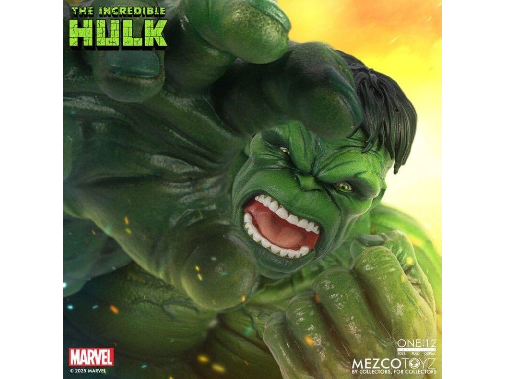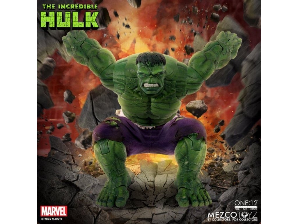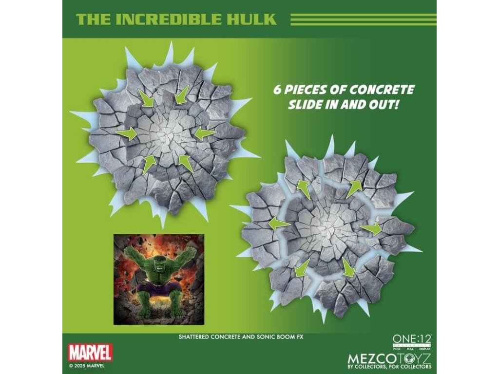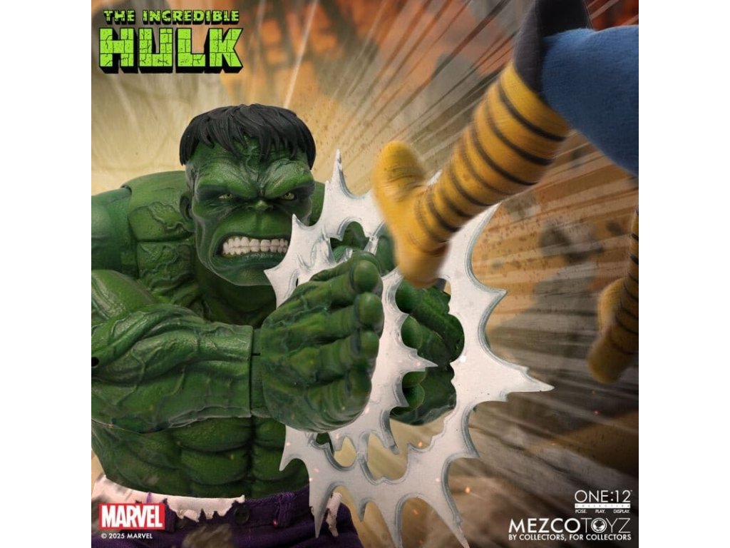 Neuvěřitelný Hulk se prorazil do řady The One:12 Collective s neústupným vztekem a nezastavitelnou silou. Tato mohutná 19 cm postavička Hulk je zachycena v plné síle gama paprsků, postavena na zbrusu novém, hyper-artikulovaném těle navrženém k projevování syrové, řádící energie. Hulk je oděn do svých typických potrhaných kalhot ušitých ze speciálního strečového džínovinu a je připraven SMASH. Kompletně vybaven 6 výrazovými hlavami, které zachycují každou fázi jeho náladových výkyvů, od ponurého přes rozzuřený až po plně vyhrocený řádící záchvat. Hulk je také vybaven sbírkou silných FX doplňků, díky kterým může zrekonstruovat své nejikoničtější pohyby: hromový potlesk, který rozechvívá bitevní pole, skok do vzduchu poháněný dynamickou skokovou základnou, a INCREDIBLE One:12 Collective země otřásající dopadovou základnou s pohyblivými troskami. SOUBOR THE INCREDIBLE HULK THE ONE:12 COLLECTIVE OBSAHUJE: - 1 x tělo One:12 Collective s více než 32 artikulačními body - Ručně malované autentické detaily - Výška přibližně 19 cm - 6 vyměnitelných hlavových portrétů - 15 vyměnitelných rukou KOSTÝM: - 1 x potrhané strečové kalhoty (fialový odstín) DOPLŇKY: - 1 x pár pěstí pro efekt SMASH (L&R) - 1 x efekt hromového tlesku - 1 x skákací základna - 1 x základna dopadu s 7 pohyblivými kusy rozbitého betonu - 1 x ohýbatelný lampión - 1 x ohybný I-nosník - 1 x zobrazovací základna One:12 Collective s logem - 1 x nastavitelný displejový sloupek One:12 Collective The Incredible Hulk je balen v sběratelsky přívětivé krabici, která je navržena s ohledem na sběratele.