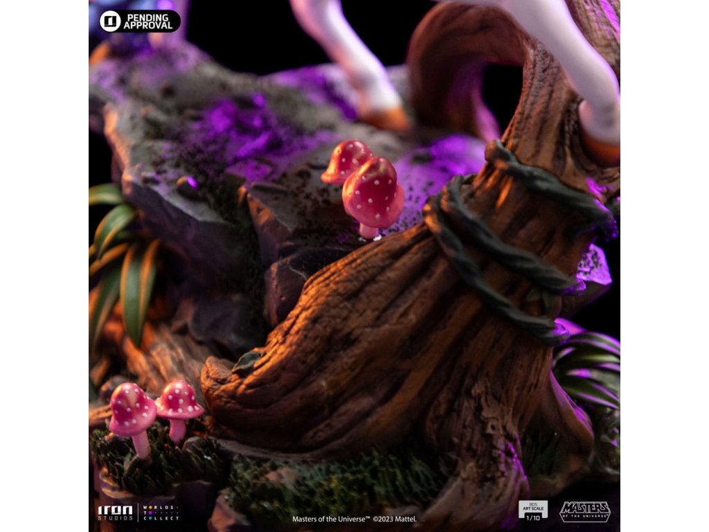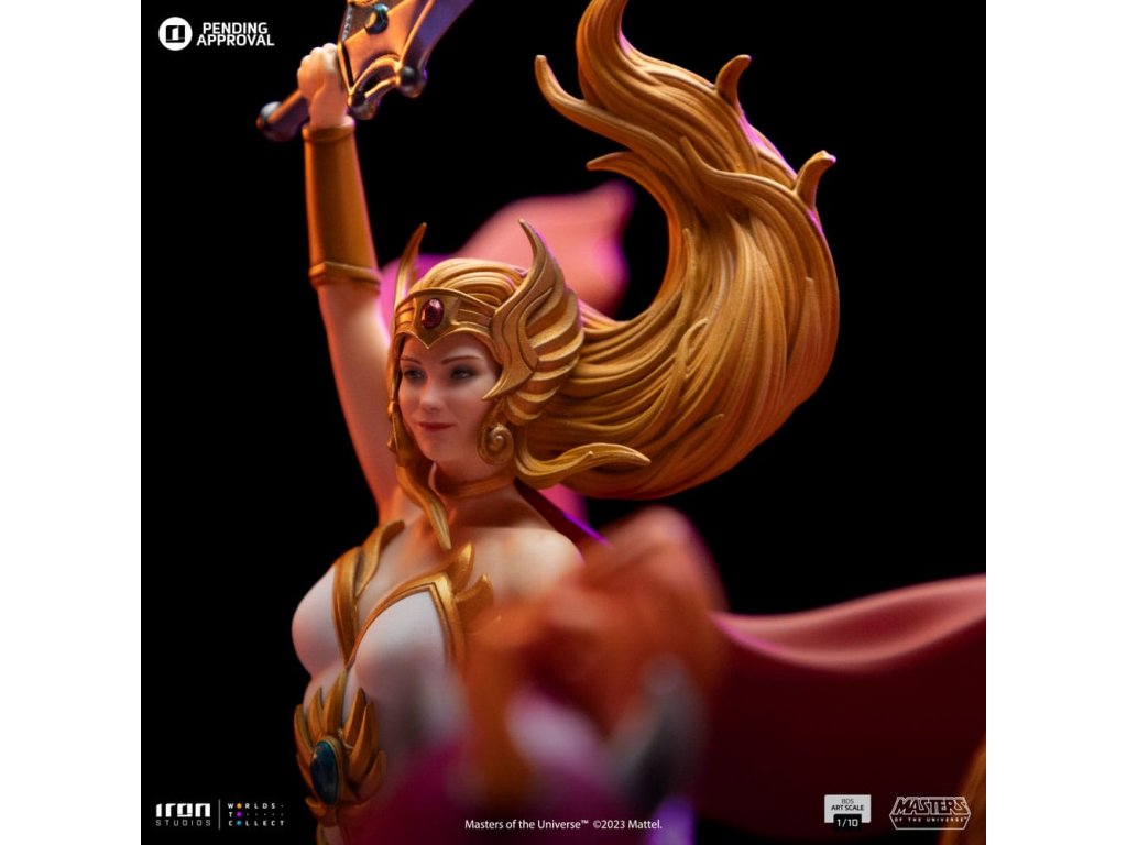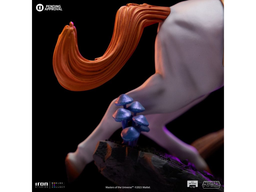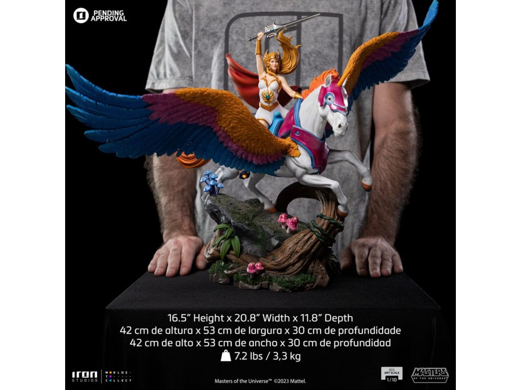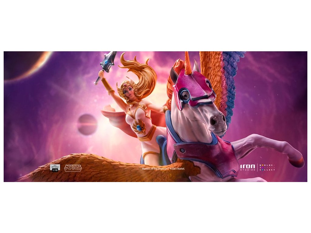 Princezna síly ve svém Alicornu dostává novou sochu od Iron Studios!Pokrývá ji válečná přilba a hrudník v odstínech modré a růžové, majestátní bílý jednorožec s křídly kluse nad světem přeplněným bujnou vegetací pod její ochranou, otevírá svá velká barevná křídla rozšířená do modrých, růžových a oranžových per, připravena letět, silný hřebec na svém hřbetě, osedlaný do svého sedla, nese krásnou válečnici známou jako Princeznu síly, která zvedá svůj kouzelný meč, aby bojovala za své rebely a všechny lidi z Etherie proti silám intergalaktického utlačovatelského režimu vedeného Lord Hordakem. Na překvapení fanoušků a sběratelů během San Diego Comic-Conu 2023 Iron Studios představili v své expozici sochu "She-Ra a Swift Wind Deluxe - Mistři vesmíru - Umělecké měřítko 1/10" na jedné z nejtradičnějších akcí světové pop kultury s hrdinkou, ústřední postavou spin-off show z Mistři vesmíru produkována v roce 1985 Filmationem. Když byla ještě miminkem, princezna Adora, dvojče prince Adama z Eternie, byla unesena zlým Hordakem, hlavním velitelem Hordy na planetě Etheria z jiné dimenze a paměť všech lidí z Eternie byla kouzelně vymazána kouzlem, které donutilo všechny zapomenout na existenci princezny, kromě jejích rodičů, Man-At-Arms a Sorceress. Vyrostla jako agentka Zlé Hordy a pracovala pro Hordaka a stala se vůdcem kapitána Adory. Povolán Sorceress z Grayskull, He-Man dostal misi jít do Etherie, kde se spojil s uprchlíky v povstání ve Whispering Woods, vedený princeznou Glimmer. Během bitvy proti Hordě se He-Man postaví zlému kapitánu Adoře, který při boji s jejím bratrem uvědomuje, že její císař je tyran, který ji manipuloval. Obdrží Meč Obrany, protějšek verzi He-Manova Meče Síly. S mečem v rukou začíná osvobozovat se z Shadow Weaverových kouzel, která ovládají její mysl. Když zvedne meč a řekne: "Za cestu Grayskull! Jsem She-Ra!", může se Adora proměnit ve válečnici She-Ra a proměnit jejího věrného koně Spirit, blízkého průvodce Adory, v Alicorn Swift Wind, věrného koně She-Ry, během jejích dobrodružství. Jako Swift Wind má alicorn schopnost vypouštět energetické výboje a cítit přítomnost magie v okolí. Po objevení celé pravdy se She-Ra rozhodne pomoci Rebelii s cílem osvobodit Etherii od Hordy. Rozhodná, noblesní, strategická a často prokazující rychlý duchapřítomnost, She-Ra, stejně jako její bratr dvojče He-Man, pevně věří v činění správných věcí a podporuje ostatní, i když to svým spojencům často odporuje. S nadlidskou silou, zvýšenou rychlostí a reflexy a téměř nezranitelná, She-Ra má schopnost léčit rány a komunikovat se zvířaty telepatií. Cílená především na mladé ženské publikum, She-Ra debutovala v animovaném filmu The Secret of the Sword v březnu 1985, který spojuje prvních 5 epizod jejího televizního seriálu. Se dvěma sériemi celkem 93 epizod, původní série She-Ra: Princezna moci se vysílala mezi lety 1985 a 1987 a mezi jejími scénáristy byli někteří ikony komiksu, jako jsou Paul Dini a J. Michael Straczynski. Na začátku října se očekává zahájení prodeje, ve stejném měsíci kdy Iron Studios Concept Store v Sao Paolo-SP slaví "Skelebraci", oslavu Skeletora, jedné z nejoblíbenějších a nejznámějších postav z pop kultury! Při příležitosti vydání mnoha soch z kolekce Masters of the Universe - Umělecké měřítko 1/10 od Iron Studios. Odhalené během SDCC 2023 studiem Iron Studios v jejich stánku, to byla jedna z nejvíce ceněných soch publikem, brzy se dočkáte dalších novinek z MOTU.Doplňkové parametry