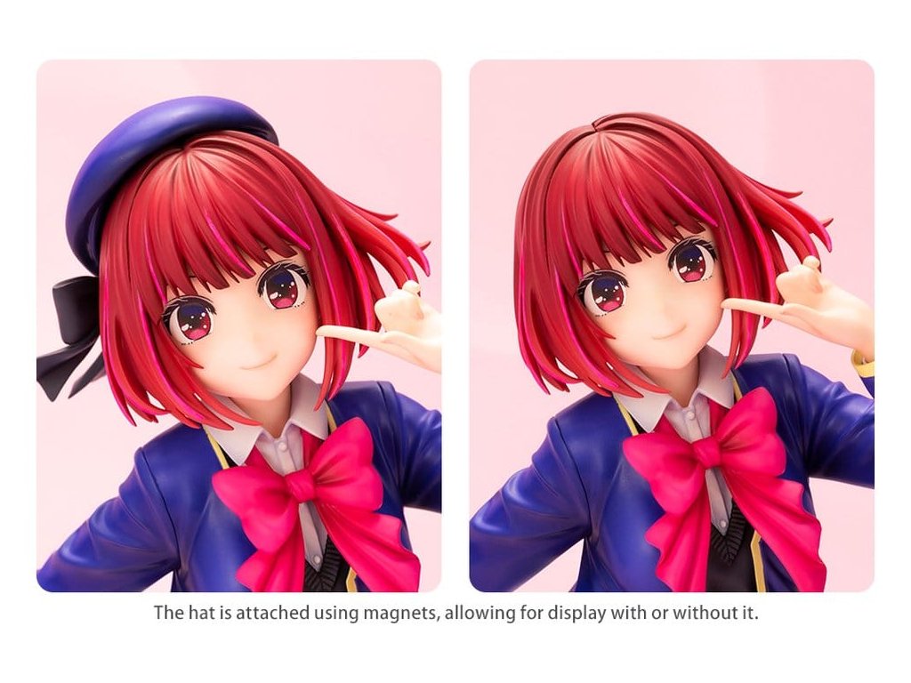 Kana Arima z anime OSHI NO KO se připojuje k řadě figurek Kotobukiya v měřítku 1/7! Momentálně je aktivní jako centrum pro B-Komachi a je ztvárněna v jejím školním oděvu! S jejím roztomilým úsměvem, roztomilou pózou a důkladnou sochařskou prací, která byla pečlivě vytvořena až do posledního detailu, dokonale ožívá každý jeden z jejích kouzelných rysů. Věnujte pozornost jejímu energickému pohybu a struktuře její lesklých vlasů. Klobouk uniformy využívá magnet a může být připojen nebo odstraněn, což ji umožňuje zobrazit s kloboukem nebo bez něj podle preference. Roztomilá, ale zároveň chladná, přidejte opravdovou profesionálku Kanu Arima do své sbírky ještě dnes! (Tento předmět je reprodukce.)