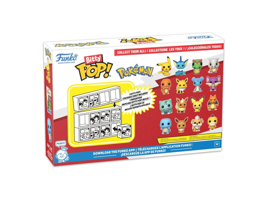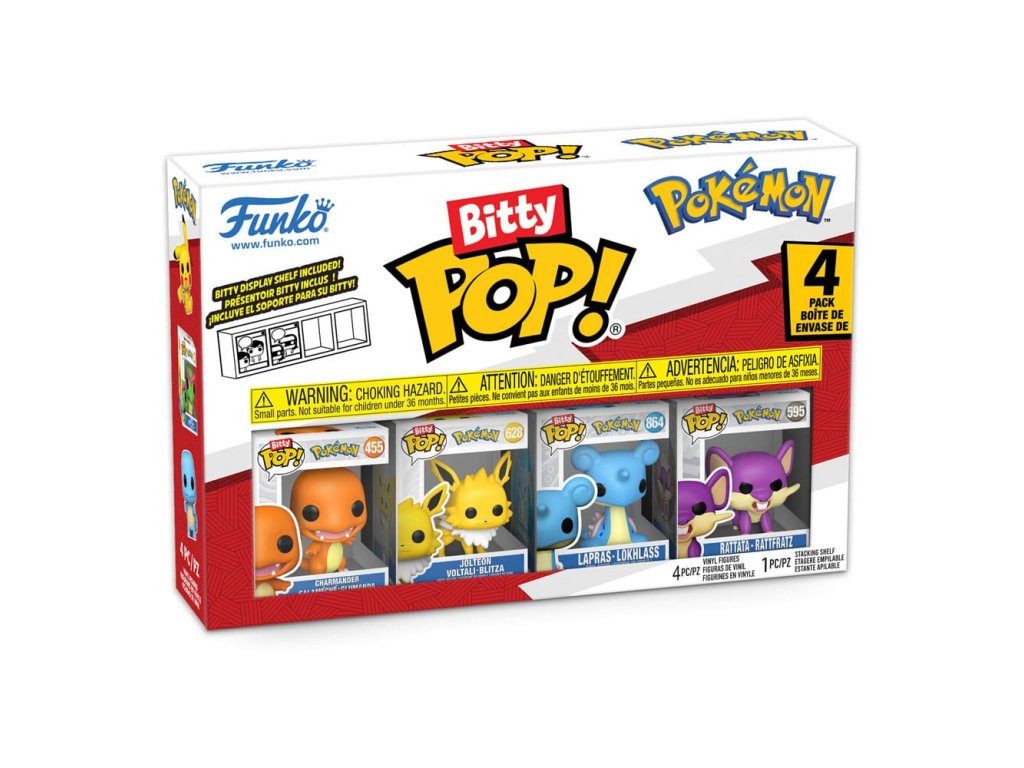 Z Funko série 'Bitty POP!' pochází tento balíček 4 mini POP! figurek vyrobených z vinylu. Každá je vysoká cca 2 cm a je dodávána s vlastním akrylovým balením v obvyklém designu POP! Součástí balení je také stohovatelný displej, který dokáže pojmout všechny čtyři figurky. V balení naleznete: - Charmander - Jolteon - Lapras - Rattata.