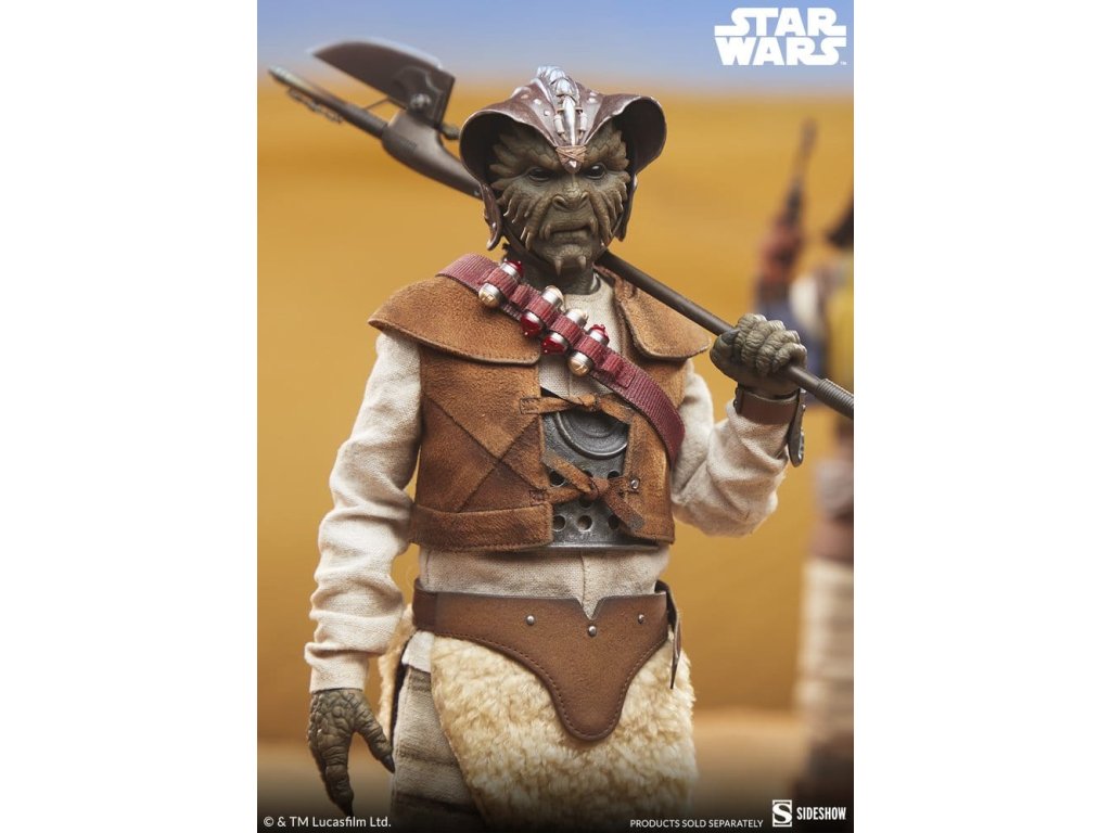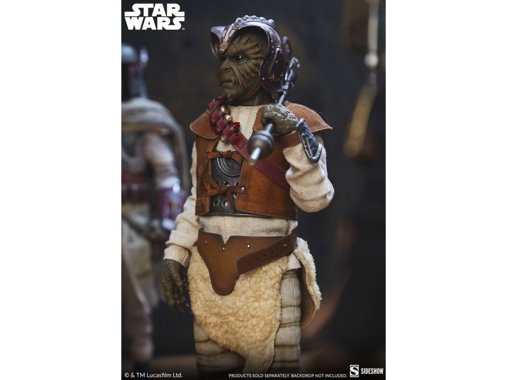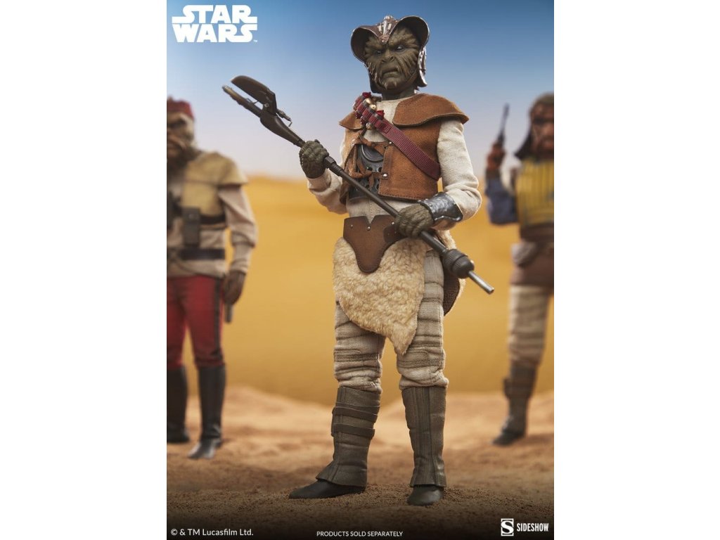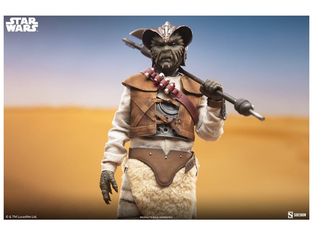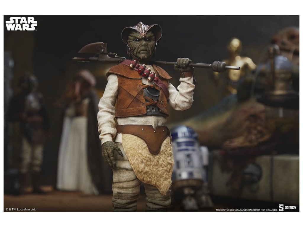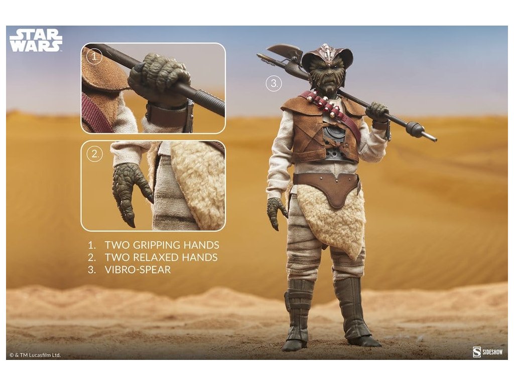 Sideshow představuje Wooof™ Šestá škálová sběratelská figurka high-endu, oficiálně licencovaná sběratelská figurka Star Wars&, připravená připojit se k vašemu dvornímu soudu. Stejně jako hazardní hráč Klaatu je Wooof olivově zbarveným Nikto, poddruh, který je obzvláště vhodný pro drsné pouštní klima. Jeho šupinatá kůže, malé rohy a intenzivní oči dávají tomuto pašerákovi tvrdý vzhled, který mu slouží dobře jako zločinec v kruhu Jabby Hutta. Jako součást podsvětí Tatooine je vidět v trůnním sále zločineckého pána a na palubě plachetnice. Inspirujte se vzhledem postavy Návrat Jediho&, tato plně artikulovaná, vysoce pohyblivá postava Star Wars je oblečena do šitého látkového oblečení přesně podle jeho obrazové sady. Jeho oděv sestává ze světle béžové košile a odpovídajících kalhot, plus tmavě hnědé vesty. Wooofův soubor je doplněn helmu, hrudním plátem, bandoliérem a přilbou a kožíškem z umělé kůže. Wooof&trade Šestá škálová sběratelská figurka high-endu také přichází se dvěma uvolněnými rukama, stejně jako s párem držících rukou pro jeho doplněk vibrospear. Wooof&trade Šestá škálová sběratelská figurka high-endu je nejnovější přírůstek k Sideshow's Scum & Villainy řadě sběratelských předmětů high-end, které přináší vaše oblíbené podsvětné postavy až z daleké, daleké galaxie na vaši nejbližší domácí nákladní loď. Buďte bdělí a dávejte pozor na další nechvalně známé postavy v této nádherně nebezpečné série omezených vydání sběratelských figur high-end.Buďte první, kdo si přiveze Wooof™ Šestou škálu sběratelské figurky vysokého konce od Sideshow již dnes! Orientační datum vydání: září 2026