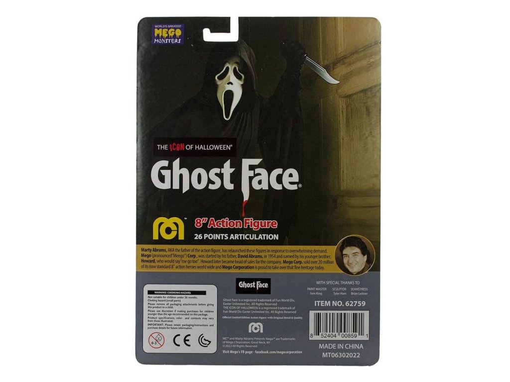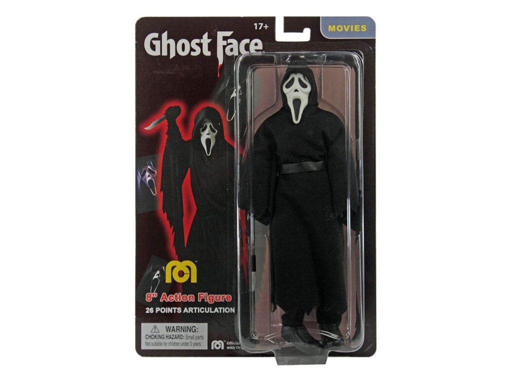 ''Jaký je tvůj oblíbený hororový film?'' Iconický Ghostface debutoval v Megoverse! Jsme nadšeni, že můžeme přivést tohoto fanouškem oblíbeného mezi hvězdnou sestavu naší hororové řady! Popularity Ghostface ho upevnila mezi legendy hororových filmů všech dob. 'The Voice' nyní muže stát hrdě po boku vašich dalších akčních figurek Mego Horror a Monster! 'Nikdy neříkej 'kdo je tam?' přeci sleduješ horory? Nyní poprvé v historii můžete přidat Ghostface ve klasickém stylu Mego 8 inch do své sbírky akčních figurek! Ghostface přichází s autentickým oblečením a sochařstvím, jak je vidět v neuvěřitelně populární filmové franchíze. 'Nezapomeňte nastavit budík.'