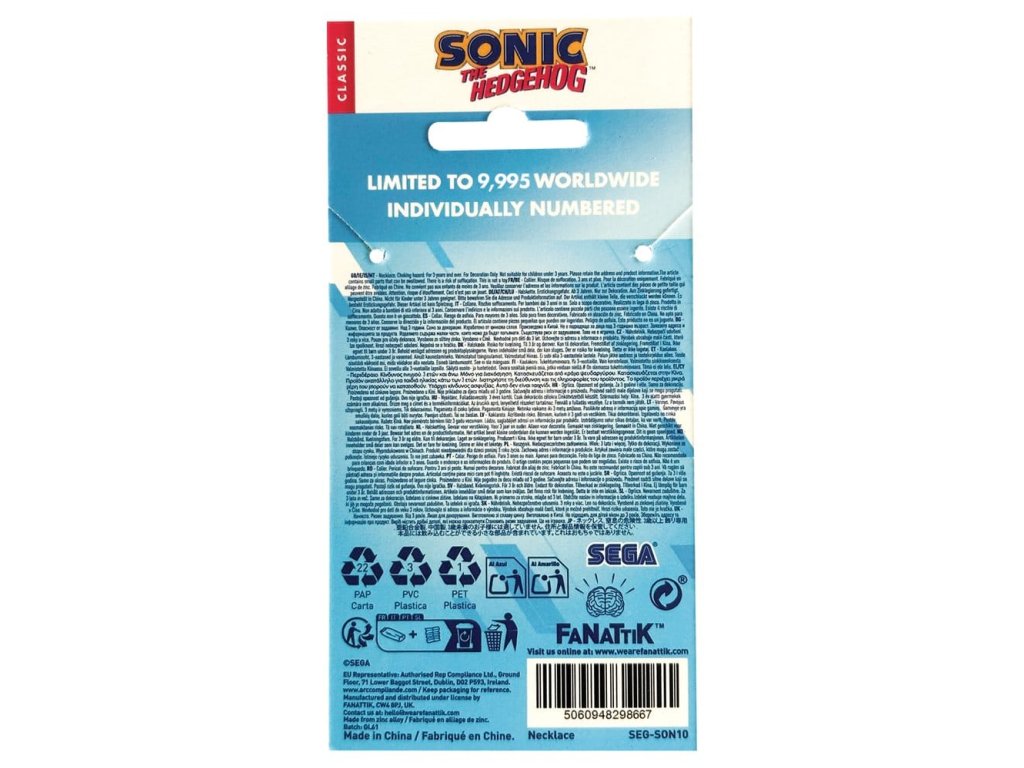 Prsteny jsou synonymem pro Sonic the Hedgehog, kde je sbírá téměř ve všech hrách, ve kterých se objevil. Tento limitovaný náhrdelník představuje tuto spojitost tím, že zobrazuje pixelovou verzi tohoto modrého sprintera uvnitř prstenu s pozlaceným povrchem. Samostatně číslované na zadní straně Sonicu, je náhrdelník omezen na 5 000 kusů na celém světě. - Oficiálně licencované - Omezeno na 5 000 - Jednotlivě číslované na zadní straně Sonicu - Prsten s pozlaceným povrchem - Průměr 30mm