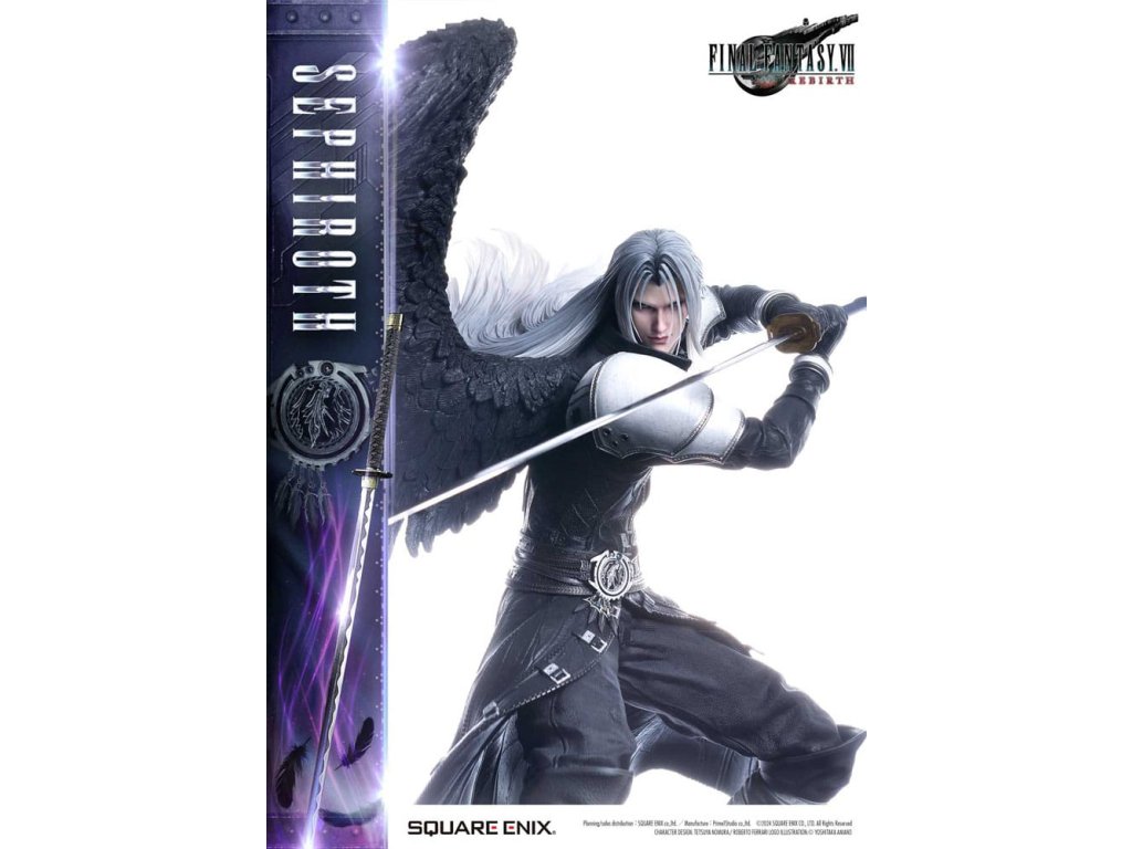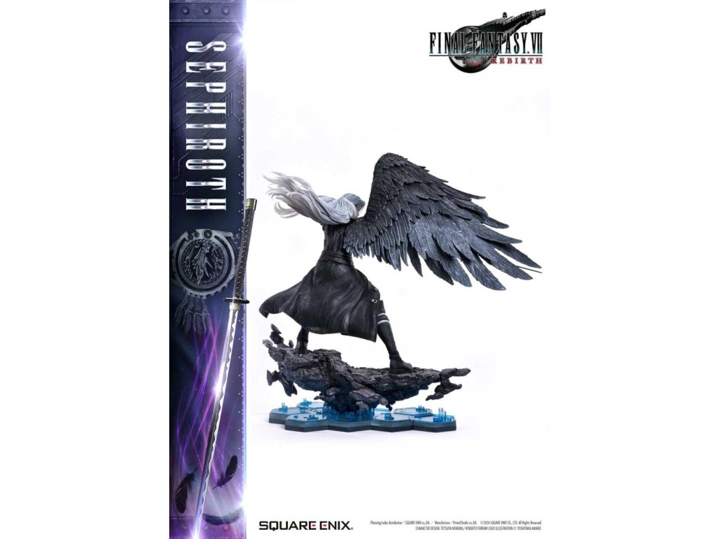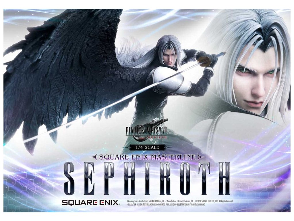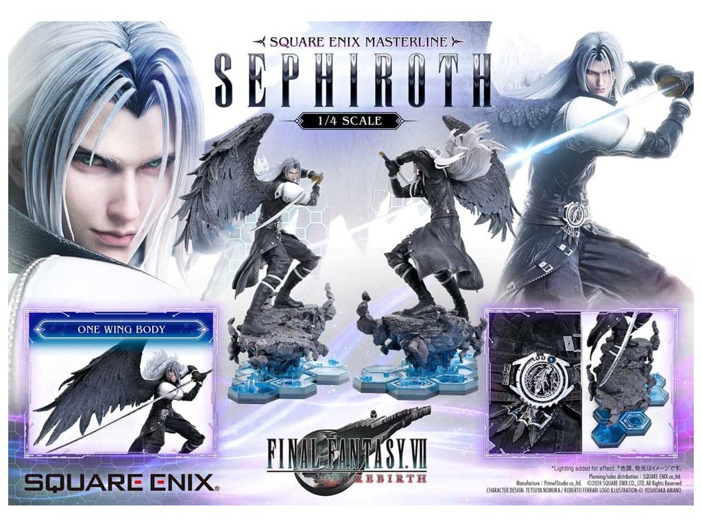 Uhelně černé křídlo, které se vznáší mezi hvězdami, a mstivý meč, který přináší katastrofu. Sephiroth z FINAL FANTASY VII REBIRTH se objevuje jako sousoší v měřítku 1/4, zdokonalené v 3D. SQUARE ENIX a Prime 1 Studio se opět spojili, aby vám přinesli vysoce kvalitní sběratelský SQUARE ENIX MASTERLINE. Sephiroth, jednokřídlý anděl z FINAL FANTASY VII REBIRTH, je oživen v této sérii sousoší, která přitahuje pozornost sběratelů z celého světa! Protažený meč, který tiše hrozí spolu s jeho vyrovnaným postojem, přímo zachycují Sephirothovu povahu, když se s ním v hře setkáte. Dlouhé stříbrné vlasy, které mu vlají za zády, oči z Mako zbarvené šílenstvím, Masamune, které jistě okouzlí srdce každého svým krásným vzorem čepele, a uhelně černé křídlo, které se táhne z jeho pravého ramene - barvení a sochaření tohoto sousoší jsou plné náročných detailů a řemeslné dovednosti, které usilují jen o to nejlepší, jsou živé a zdravé v každém detailu a formě. Modré hexagony, které vyplňují spodní část speciální základny, se také používají u soch Cloud Strife a Zack Fair ze stejné série, takže si můžete užít sjednocenou prezentaci tím, že je postavíte vedle sebe. Díky vynikajícímu sochaření a barevnému provedení tohoto mistrovského díla můžete cítit bohatý příběh za postavou. Požadující to nejlepší ve všech aspektech, Sephiroth určitě ovládne vaši sbírku svou převládající přítomností! Materiál: Polystone / Některé části využívají jiné materiály. Přibližná velikost výrobku: 69 x 41 x 72 cm. Součástí balení: - Speciální základna - Stojan s logem FINAL FANTASY VII REBIRTH - Podpůrný sloupek.