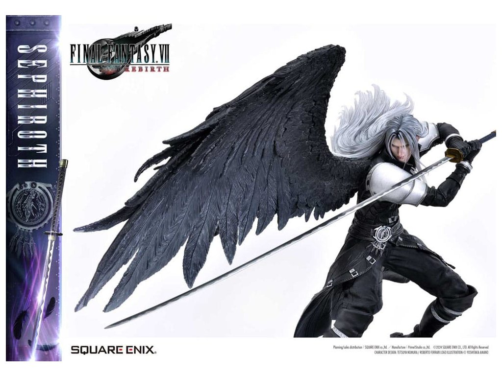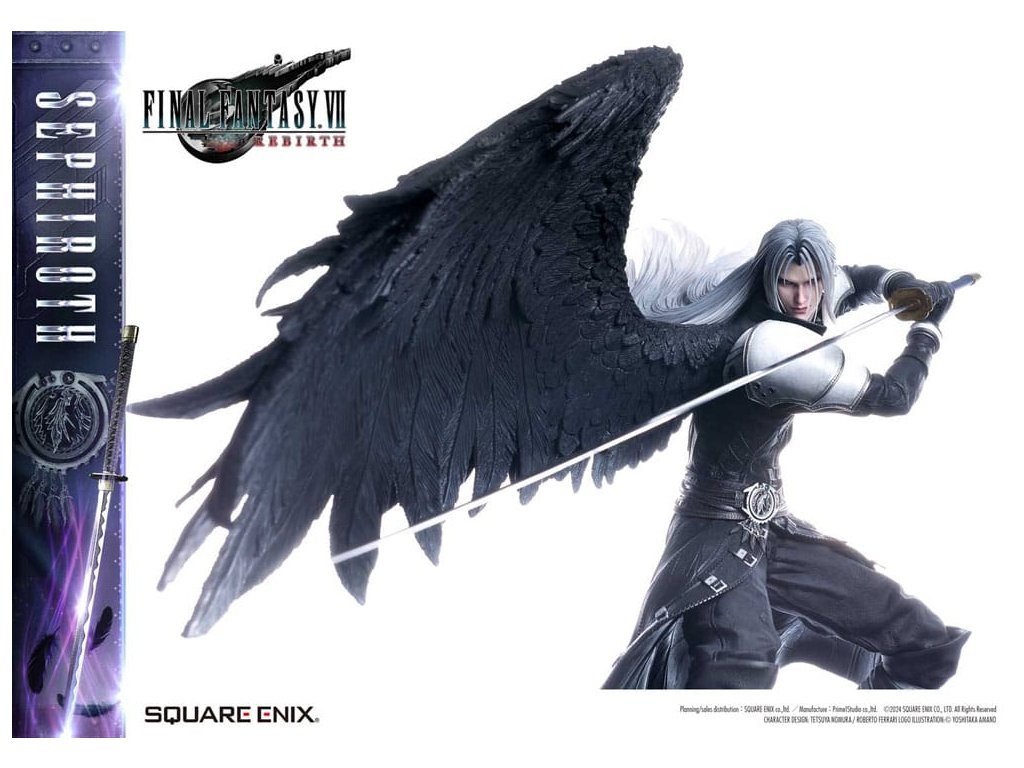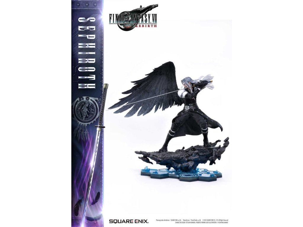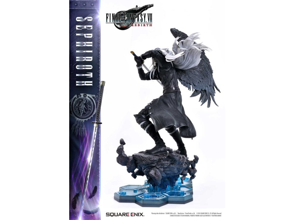 Uhelně černé křídlo, které se vznáší mezi hvězdami, a mstivý meč, který přináší katastrofu. Sephiroth z FINAL FANTASY VII REBIRTH se objevuje jako sousoší v měřítku 1/4, zdokonalené v 3D. SQUARE ENIX a Prime 1 Studio se opět spojili, aby vám přinesli vysoce kvalitní sběratelský SQUARE ENIX MASTERLINE. Sephiroth, jednokřídlý anděl z FINAL FANTASY VII REBIRTH, je oživen v této sérii sousoší, která přitahuje pozornost sběratelů z celého světa! Protažený meč, který tiše hrozí spolu s jeho vyrovnaným postojem, přímo zachycují Sephirothovu povahu, když se s ním v hře setkáte. Dlouhé stříbrné vlasy, které mu vlají za zády, oči z Mako zbarvené šílenstvím, Masamune, které jistě okouzlí srdce každého svým krásným vzorem čepele, a uhelně černé křídlo, které se táhne z jeho pravého ramene - barvení a sochaření tohoto sousoší jsou plné náročných detailů a řemeslné dovednosti, které usilují jen o to nejlepší, jsou živé a zdravé v každém detailu a formě. Modré hexagony, které vyplňují spodní část speciální základny, se také používají u soch Cloud Strife a Zack Fair ze stejné série, takže si můžete užít sjednocenou prezentaci tím, že je postavíte vedle sebe. Díky vynikajícímu sochaření a barevnému provedení tohoto mistrovského díla můžete cítit bohatý příběh za postavou. Požadující to nejlepší ve všech aspektech, Sephiroth určitě ovládne vaši sbírku svou převládající přítomností! Materiál: Polystone / Některé části využívají jiné materiály. Přibližná velikost výrobku: 69 x 41 x 72 cm. Součástí balení: - Speciální základna - Stojan s logem FINAL FANTASY VII REBIRTH - Podpůrný sloupek.