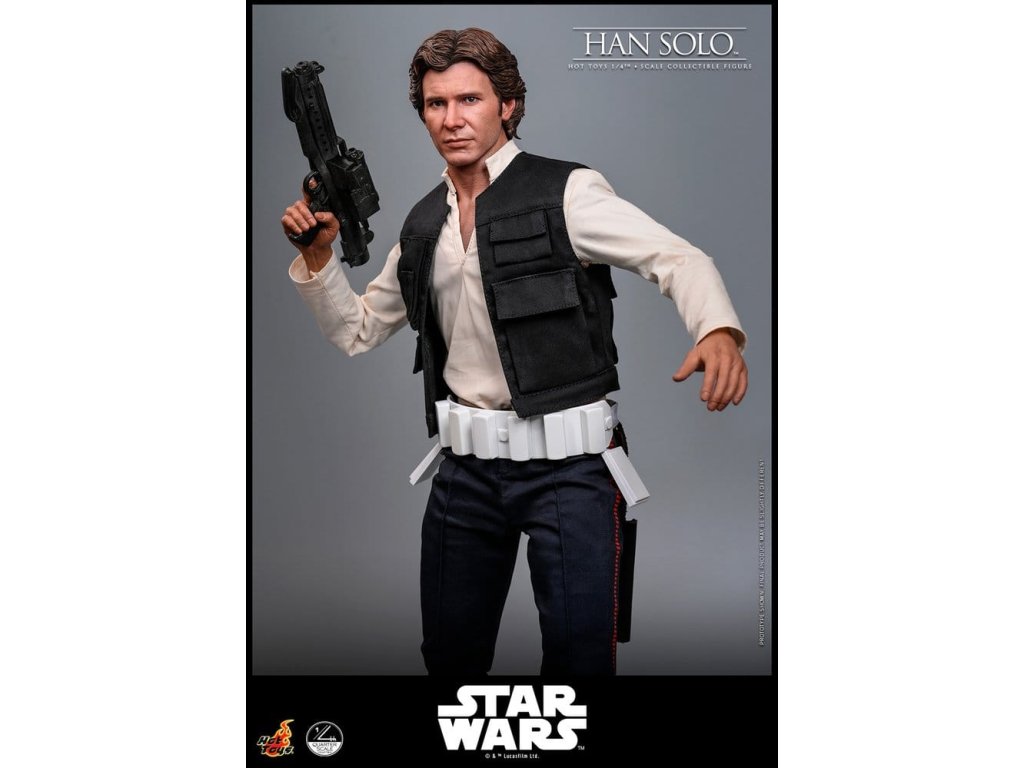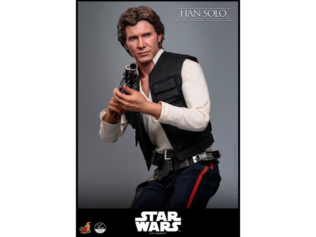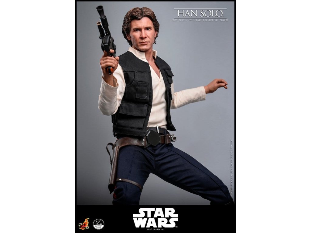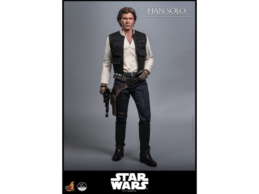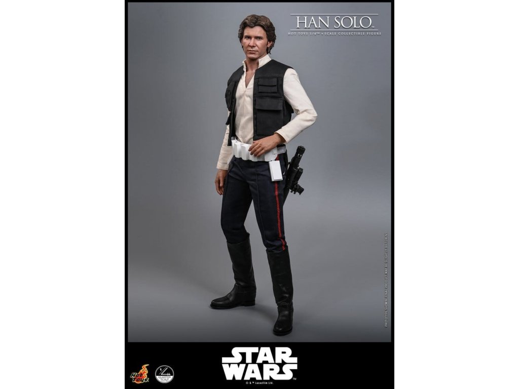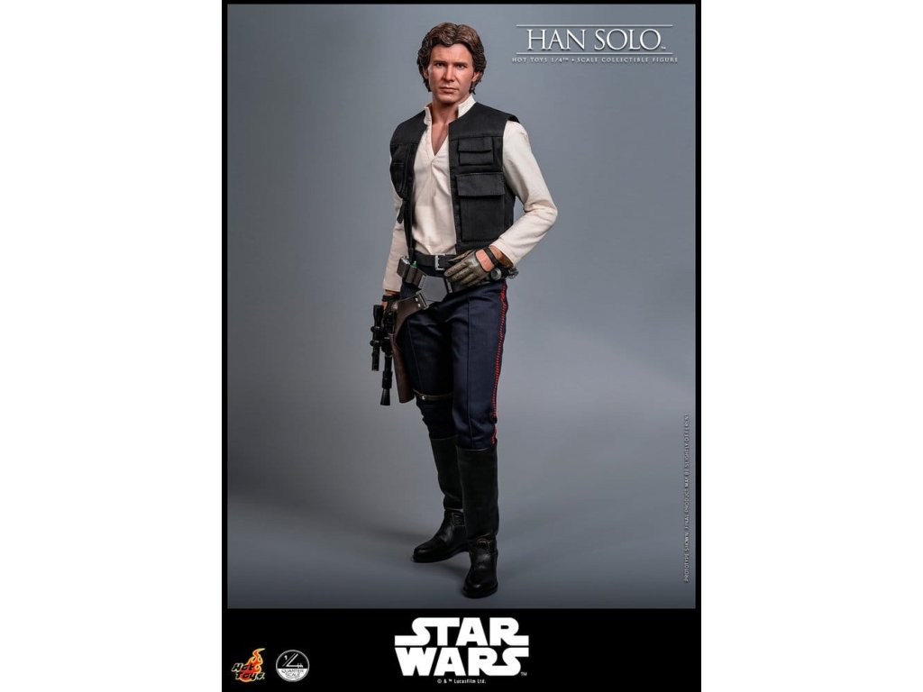 Ve Star Wars: Nová naděje se Han Solo objevuje jako klasický darebácký pašerácký kapitán Hvězdného sokola - cynický, bystrý výstřední z Corellie. Drzý, sebejistý a zpočátku v tom jen kvůli kreditům, následně se po osudovém setkání neochotně přidává k Povstalecké příčině, přičemž předvádí své legendární pilotní dovednosti, ostrý jazyk a překvapivou loajalitu, díky nimž se okamžitě stává ikonou. Sideshow a Hot Toys s hrdostí představují sběratelskou figurku Han Solo & trade; ve velikosti čtvrtiny skutečné velikosti zachycující Harrisona Forda se značnou realističností. Tato figura ve čtvrtinové velikosti má nově vyvinutou hlavu se samostatnými očními bulvamy, detailně zpracovanou jizvu a věrnou kůži. Jeho hnědý krátký účes je pečlivě zpracován, aby odrážel jeho klasický vzhled z Nové naděje. S nově vyvinutým tělem mohou sběratelé vytvořit jeho typické sebevědomé postoje nebo pose připravený k výstřelu. Široký výběr výměnných rukou, včetně čtyř normálních rukou, tří rukavicových rukou, stejně jako šesti rukou s předloktím, poskytuje rozmanité možnosti vystavování přímo z cantiny v Mos Eisley nebo uprostřed bitvy. Hanovo oblečení je věrně padnoucí, jeho vesta je vrstvena přes tričko s výstřihem do V, kalhoty a černý pásek z pravé kůže. Hnědý kůžený praktický pásek je bohatě zdoben stříbrnou přezkou, ozdobami a pouzdrem na blaster z kůže, doplněným párem dlouhých kožených bot, které dotvářejí jeho pašerácký vzhled. Co se týče zbraní, Han je vybavený svou typickou blasterovou pistolí DL-44 a blasterovým puškou E-11, zatímco mezi příslušenstvím najdeme volač droidů a stormtrooperský praktický pásek s kůženým pouzdrem na blaster. Figurka ve čtvrtinové velikosti je vystavena na podstavci s motivem Hvězdného sokola se zmenšeným modelem Hvězdného sokola, logem Star Wars a štítkem s jménem postavy, což z ní dělá nepřehlédnutelný klenot jakékoliv sbírky. Darebácký, legendární a vždy lump se srdcem ze zlata - tato úžasná figurka Han Sola ve čtvrtinové velikosti je nepřehlédnutelným klenotem jakékoliv sbírky Star Wars.