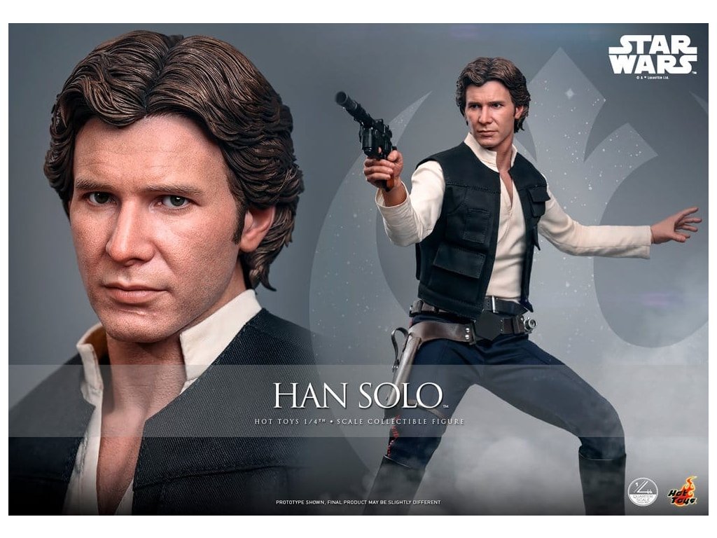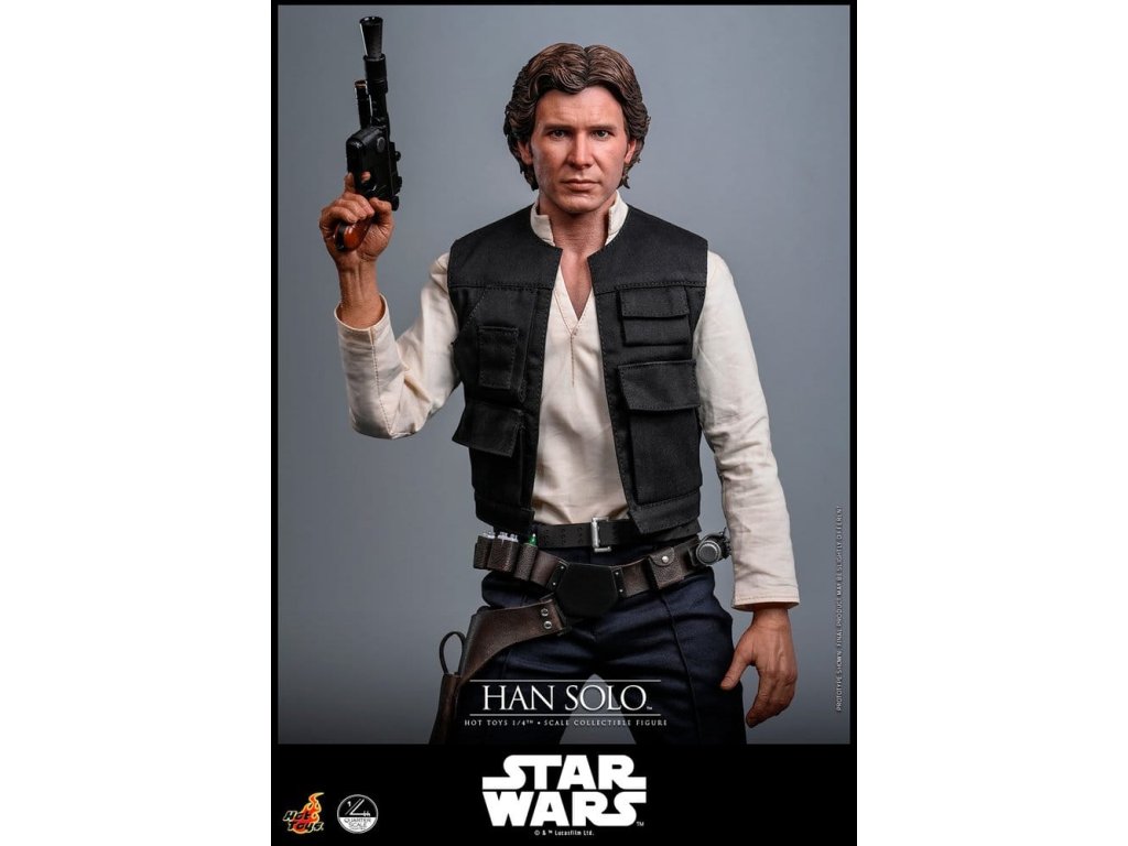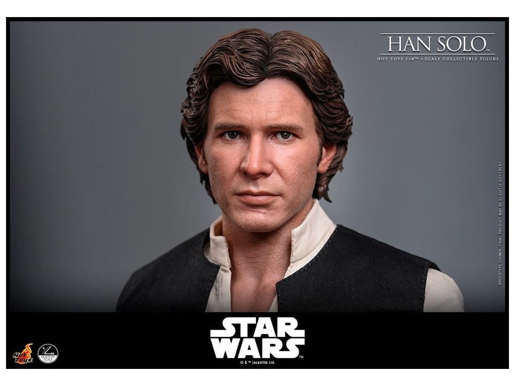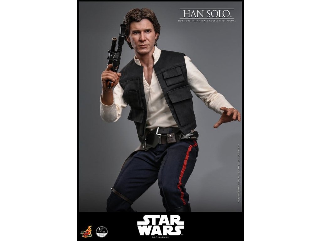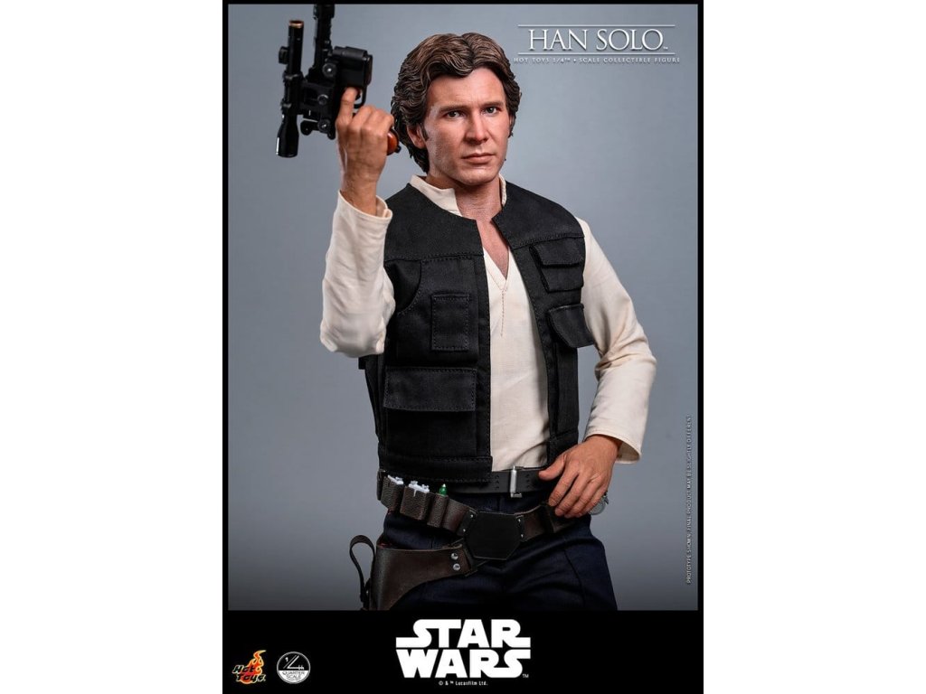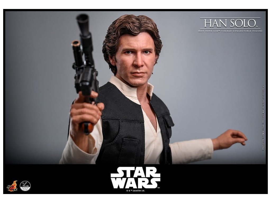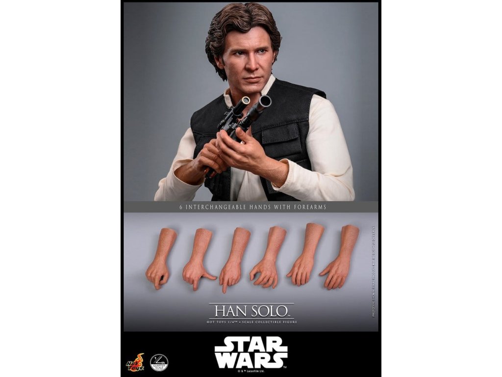 Ve Star Wars: Nová naděje se Han Solo objevuje jako klasický darebácký pašerácký kapitán Hvězdného sokola - cynický, bystrý výstřední z Corellie. Drzý, sebejistý a zpočátku v tom jen kvůli kreditům, následně se po osudovém setkání neochotně přidává k Povstalecké příčině, přičemž předvádí své legendární pilotní dovednosti, ostrý jazyk a překvapivou loajalitu, díky nimž se okamžitě stává ikonou. Sideshow a Hot Toys s hrdostí představují sběratelskou figurku Han Solo & trade; ve velikosti čtvrtiny skutečné velikosti zachycující Harrisona Forda se značnou realističností. Tato figura ve čtvrtinové velikosti má nově vyvinutou hlavu se samostatnými očními bulvamy, detailně zpracovanou jizvu a věrnou kůži. Jeho hnědý krátký účes je pečlivě zpracován, aby odrážel jeho klasický vzhled z Nové naděje. S nově vyvinutým tělem mohou sběratelé vytvořit jeho typické sebevědomé postoje nebo pose připravený k výstřelu. Široký výběr výměnných rukou, včetně čtyř normálních rukou, tří rukavicových rukou, stejně jako šesti rukou s předloktím, poskytuje rozmanité možnosti vystavování přímo z cantiny v Mos Eisley nebo uprostřed bitvy. Hanovo oblečení je věrně padnoucí, jeho vesta je vrstvena přes tričko s výstřihem do V, kalhoty a černý pásek z pravé kůže. Hnědý kůžený praktický pásek je bohatě zdoben stříbrnou přezkou, ozdobami a pouzdrem na blaster z kůže, doplněným párem dlouhých kožených bot, které dotvářejí jeho pašerácký vzhled. Co se týče zbraní, Han je vybavený svou typickou blasterovou pistolí DL-44 a blasterovým puškou E-11, zatímco mezi příslušenstvím najdeme volač droidů a stormtrooperský praktický pásek s kůženým pouzdrem na blaster. Figurka ve čtvrtinové velikosti je vystavena na podstavci s motivem Hvězdného sokola se zmenšeným modelem Hvězdného sokola, logem Star Wars a štítkem s jménem postavy, což z ní dělá nepřehlédnutelný klenot jakékoliv sbírky. Darebácký, legendární a vždy lump se srdcem ze zlata - tato úžasná figurka Han Sola ve čtvrtinové velikosti je nepřehlédnutelným klenotem jakékoliv sbírky Star Wars.