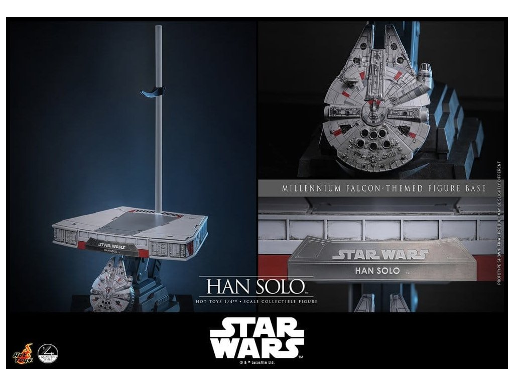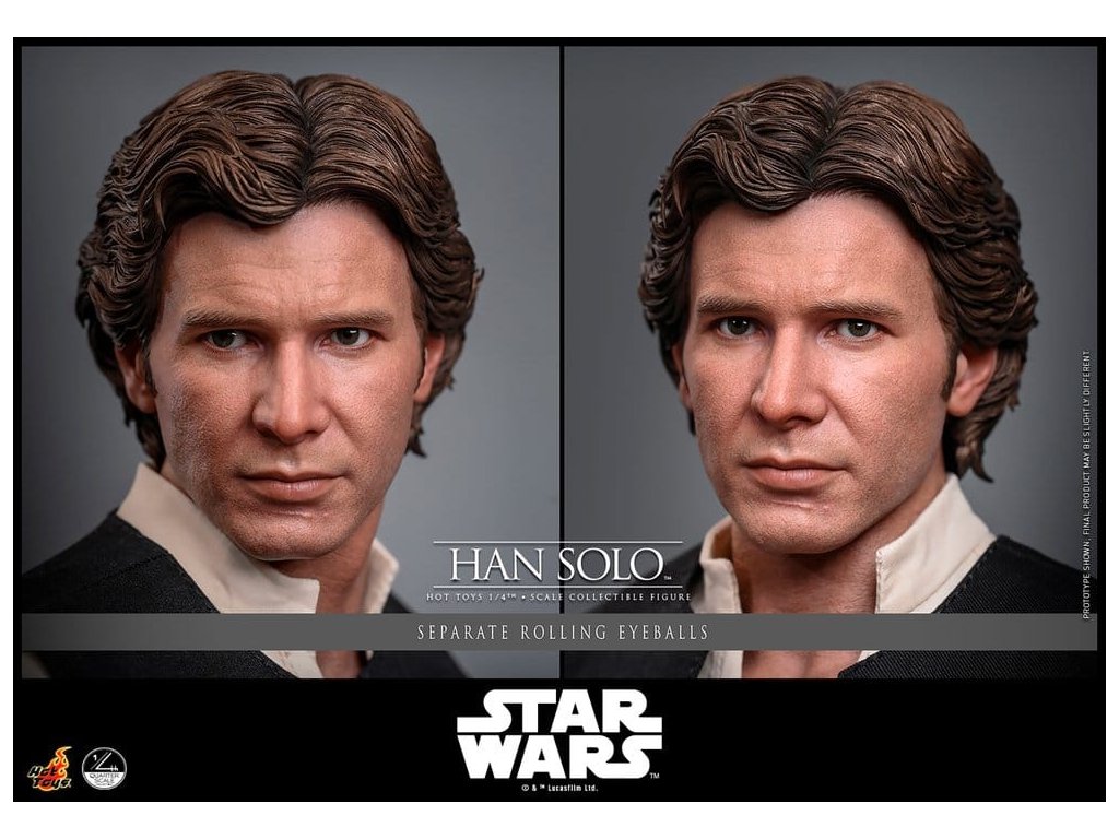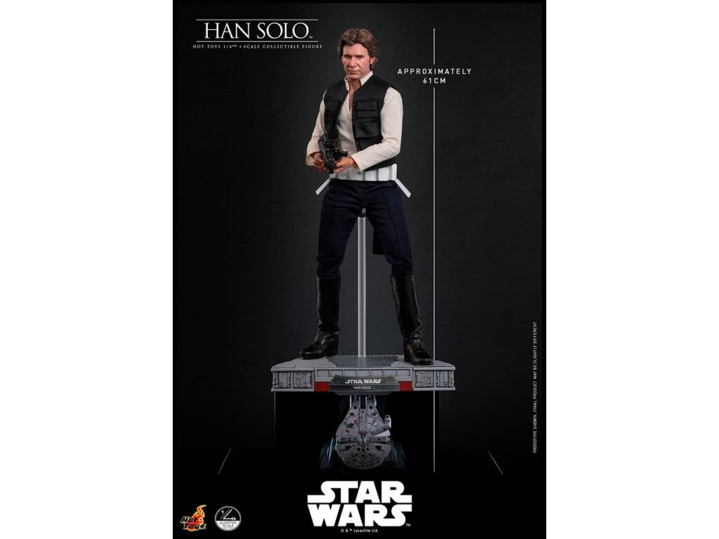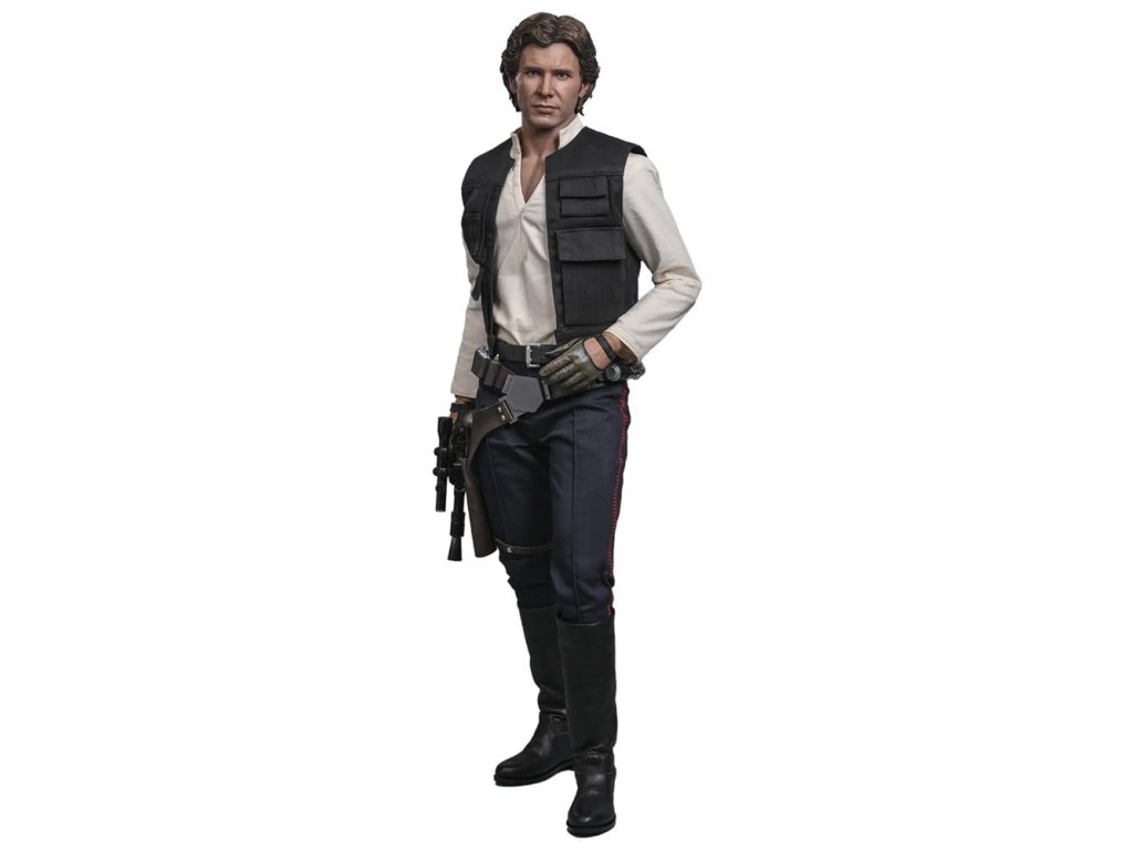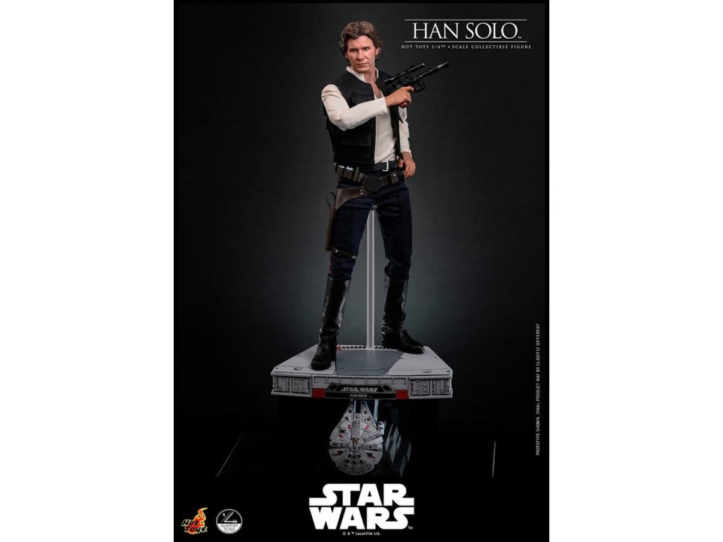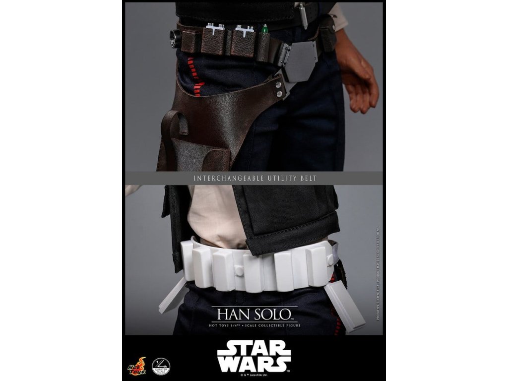 Ve Star Wars: Nová naděje se Han Solo objevuje jako klasický darebácký pašerácký kapitán Hvězdného sokola - cynický, bystrý výstřední z Corellie. Drzý, sebejistý a zpočátku v tom jen kvůli kreditům, následně se po osudovém setkání neochotně přidává k Povstalecké příčině, přičemž předvádí své legendární pilotní dovednosti, ostrý jazyk a překvapivou loajalitu, díky nimž se okamžitě stává ikonou. Sideshow a Hot Toys s hrdostí představují sběratelskou figurku Han Solo & trade; ve velikosti čtvrtiny skutečné velikosti zachycující Harrisona Forda se značnou realističností. Tato figura ve čtvrtinové velikosti má nově vyvinutou hlavu se samostatnými očními bulvamy, detailně zpracovanou jizvu a věrnou kůži. Jeho hnědý krátký účes je pečlivě zpracován, aby odrážel jeho klasický vzhled z Nové naděje. S nově vyvinutým tělem mohou sběratelé vytvořit jeho typické sebevědomé postoje nebo pose připravený k výstřelu. Široký výběr výměnných rukou, včetně čtyř normálních rukou, tří rukavicových rukou, stejně jako šesti rukou s předloktím, poskytuje rozmanité možnosti vystavování přímo z cantiny v Mos Eisley nebo uprostřed bitvy. Hanovo oblečení je věrně padnoucí, jeho vesta je vrstvena přes tričko s výstřihem do V, kalhoty a černý pásek z pravé kůže. Hnědý kůžený praktický pásek je bohatě zdoben stříbrnou přezkou, ozdobami a pouzdrem na blaster z kůže, doplněným párem dlouhých kožených bot, které dotvářejí jeho pašerácký vzhled. Co se týče zbraní, Han je vybavený svou typickou blasterovou pistolí DL-44 a blasterovým puškou E-11, zatímco mezi příslušenstvím najdeme volač droidů a stormtrooperský praktický pásek s kůženým pouzdrem na blaster. Figurka ve čtvrtinové velikosti je vystavena na podstavci s motivem Hvězdného sokola se zmenšeným modelem Hvězdného sokola, logem Star Wars a štítkem s jménem postavy, což z ní dělá nepřehlédnutelný klenot jakékoliv sbírky. Darebácký, legendární a vždy lump se srdcem ze zlata - tato úžasná figurka Han Sola ve čtvrtinové velikosti je nepřehlédnutelným klenotem jakékoliv sbírky Star Wars.