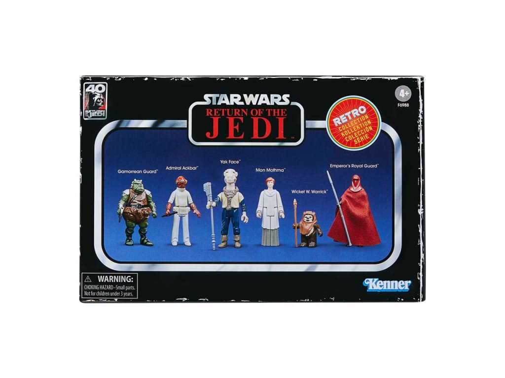 Děti a sběratelé si mohou představit největší bitvy a mise ze ságy Star Wars s figurkami ze Star Wars Retro Kolekce! S vynikajícími funkcemi a dekorací skutečně reprezentuje kvalitu a realismus, který milují fanoušci Star Wars. Star Wars Retro Kolekce zahrnuje akční figurek ze Star Wars z více než 40letého odkazu Star Wars Galaxie, včetně filmů a živých akčních sérií. (Další produkty se prodávají samostatně. Podléhá dostupnosti.)Tyto figurek o velikosti 3,75 palce ze Star Wars Retro Kolekce jsou detailně zpracované, aby vypadaly jako postavy Admirál Ackbar, Wicket W. Warrick, Mon Mothma, Císařovy královské stráže, Gamorrean Strážce a Yak Face z filmu Star Wars: Návrat Jediho, mají design a detailling inspirovaný figurkami ze Star Wars ze 70. let.