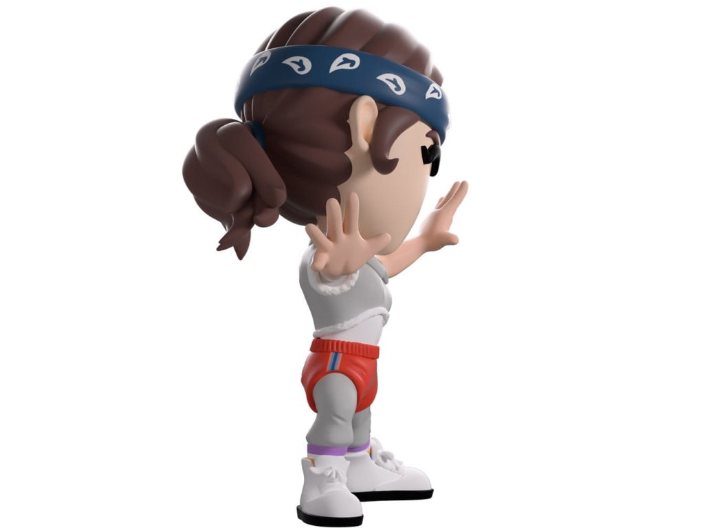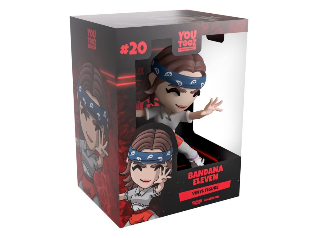 Eleven se vrátila do Youtooz, aby nás zachránila před invazí ze Světa vzhůru nohama! Stojí vysoká 4,3 palce se vztyčenými pažemi, jak předvádí nejsladší taneční krok, modrobarevnou šátku má navlečenou nad zaujetýma očima a obalenou kolem hnědých vlasů stažených do culíku na zadní straně hlavy. Je oblečená v šedé mikině s límečkem s oříznutým lemem a rukávy, jasně červené kraťasy má přes odpovídající šedé tepláky, které jsou zasunuté do pruhovaných ponožek, a na nohou má čistě bílé tenisky. Na vnější straně jejich obalu je její červený vektor proti černému pozadí s jemnými úponky, které se přes něj vinou, zatímco neonově červené čáry vystřelují vodorovně skrz interiér. Ty pak pokračují na ochranný rukáv, kde lze její figurku vidět skrz velké, průhledné okno na přední straně obalu. Tento sběratelský předmět je dodáván v matném, reliéfním, ochranném vnějším obalu a v plastovém chrániči přesně dané velikosti pro maximální ochranu během přepravy. O seriálu Stranger Things: Stranger Things je americký vědecko-fantastický hororový seriál, který vytvořili bratři Dufferovi a vysílá se na Netflixu. Seriál je zasazen do 80. let ve fiktivním městě Hawkins v Indianě. Série se točí kolem skupiny přátel, kteří vyšetřují četné nadpřirozené události, které se v městě odehrávají. Navážou spojení s nepřátelskou alternativní realitou nazývanou "Svět vzhůru nohama" a musí najít způsoby, jak z ní uniknout. Orientační datum vydání: červenec 2026