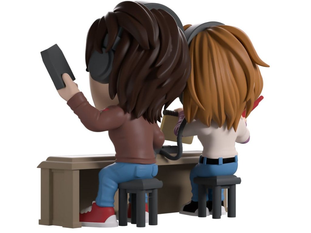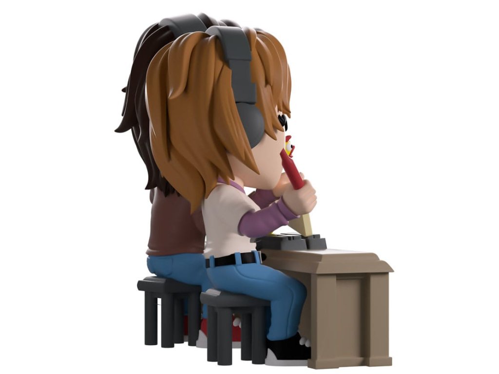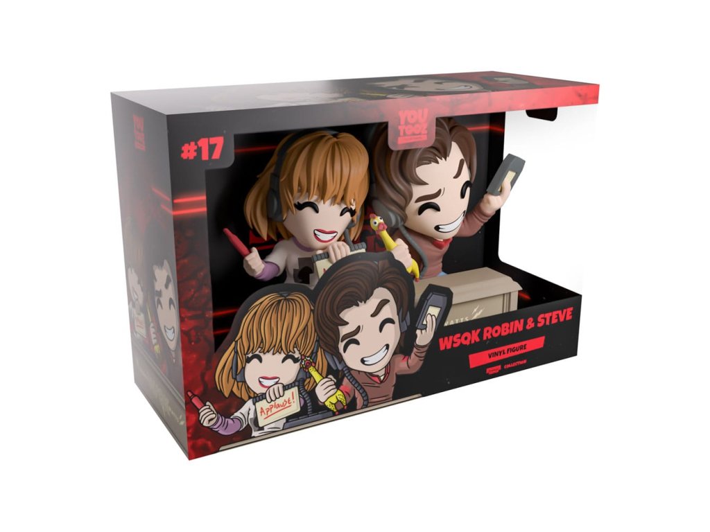 'On Air' Zapněte a hlasitěji! Robin a Steve se vrátili k Youtooz pro novou figurku! Sedí o výšce 5,2 palce za béžovým stolem s obrovskými úsměvy na tvářích a šňůry jejich šedých sluchátek vedou dolů k mixážnímu pultu. Robin má na sobě růžové tričko přes fialovou dlouhým rukávem a drží ceduli na které napsala 'Potlesk!' červeným fixem v pravé ruce. Zatímco Steve má na sobě hnědou košili s dlouhým rukávem s červenými nášivkami na rukávech a límci, v jedné ruce drží hračku s křičícím kuřetem a v druhé pásku. Na obalu jejich balení vidíme červené vektory dvojice na černém pozadí s jemnými výhonky vinoucími se napříč ním, zatímco neonově červené čáry praskají vodorovně přes vnitřek. Ty pak pokračují na ochranné pouzdříčko, kde jsou jejich figurky vidět skrze velké průzračné okno na přední straně balení. Tento sběratelský kus je odesílán v matném, raženém, ochranném vnějším pouzdře a v plastovém chrániči na míru pro maximální ochranu během přepravy.O seriálu Stranger Things:Stranger Things je americký vědeckofantastický hororový televizní seriál, který vytvořili bratři Dufferové a je dostupný na Netflixu. Seriál se odehrává v 80. letech ve fiktivním městě Hawkins v Indianě. Série se soustředí na skupinu přátel, kteří vyšetřují nejrůznější nadpřirozené události, jež se ve městě dějí. Navazují spojení s nepřátelskou alternativní realitou nazývanou 'Vzhůru nohama' a musí najít způsob, jak z ní uniknout. Orientační datum vydání: červenec 2026
