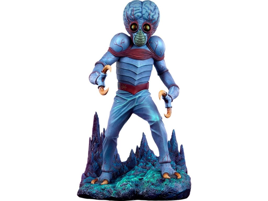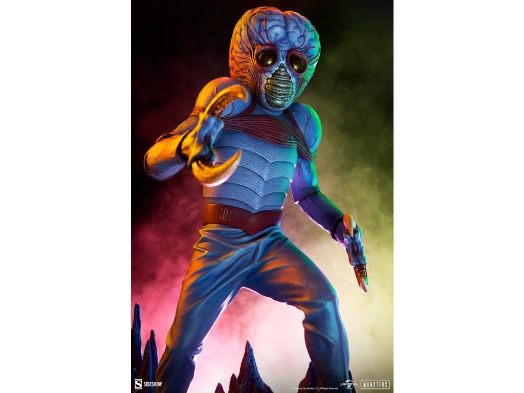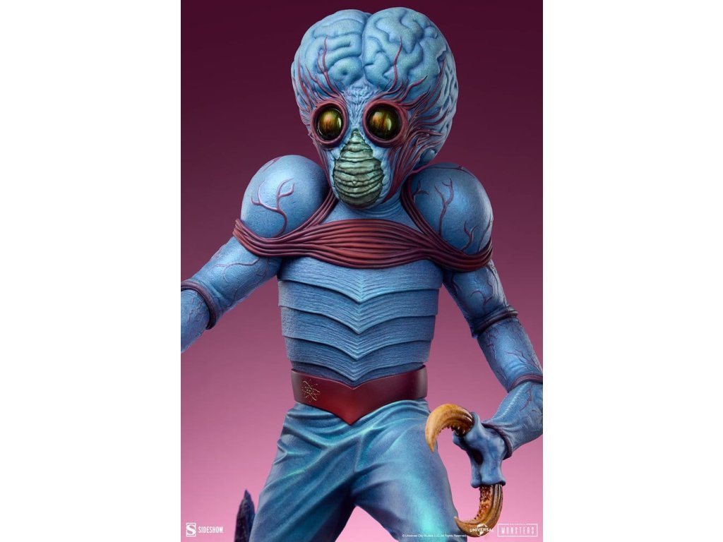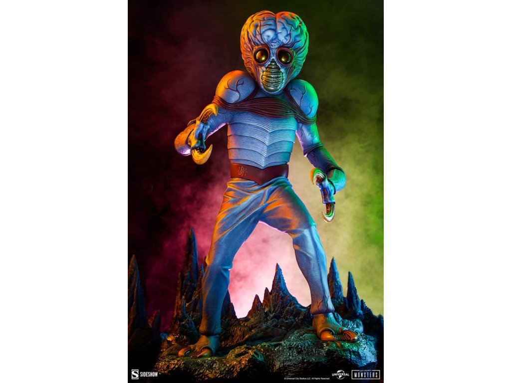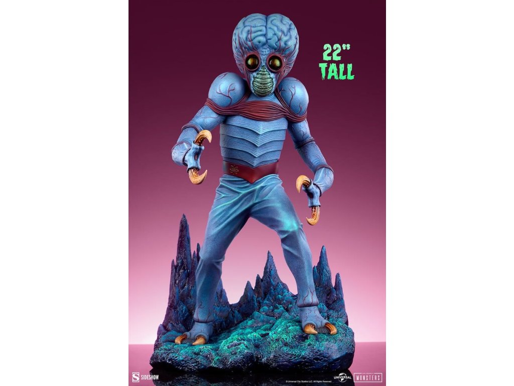 Sideshow představuje Metaluna Mutant v prémiovém velkoformátovém provedení, oficiálně licencovaný sběratelský kus z kolekce Univerzální monstra. Tato okouzlující, plně vysoce kvalitní socha je technicolorovým tributem pro nedoceněné, ale nikoli zapomenuté, filmové monstro, které debutovalo v 50. letech. Po téměř třech desetiletích se Sideshow vrací k tajemstvím vesmíru s Metaluna Mutant! I přes to, že tento charakter byl dříve viděn ve formátech menších sběratelských kusů, tato nová verze ve čtvrtinové velikosti nesmazatelné ikony popkultury přináší její unikátní design do života v prvotřídní prezentaci. Metaluna Mutant v prémiovém velkoformátovém provedení měří 55,88 cm na výšku, 33,02 cm na šířku a 43,18 cm na hloubku a je ultimátní reprezentací tohoto úchvatného stvoření, které šokovalo diváky po celé Americe. Jeho hmyzí vzhled a krustácea klapky evokují nostalgie na retro filmové masky monstr, zatímco mozoly a obří hlava tvoří kvintesenciální siluetu pro tento žánr. Od své psychedelické červeně-modré barevné palety až po jeho mimozemskou fyziologii najdou fanoušci, že ve věrném ztvárnění této ikony science fiction nebyl opomenut žádný detail. Velká a životná, Metaluna Mutant v prémiovém velkoformátovém provedení stojí na drsné vyhlídce živého povrchu nějaké planety. Inspirace estetikou atomového věku, jeho podivné hmyzí oči, zvrásněná kůže a vrstvená ústa naznačují podivnou, ionizovanou atmosféru, ve které žije. Může se zdát odjinud svéta, ale hrůza a nebezpečí číhají blízko domova! Nechte Metaluna Mutant v prémiovém velkoformátovém provedení od Sideshow napadnout vaši polici už dnes! Rozměry produktu: 55,9 x 33 x 43,2 cm. Orientační datum vydání: leden 2027