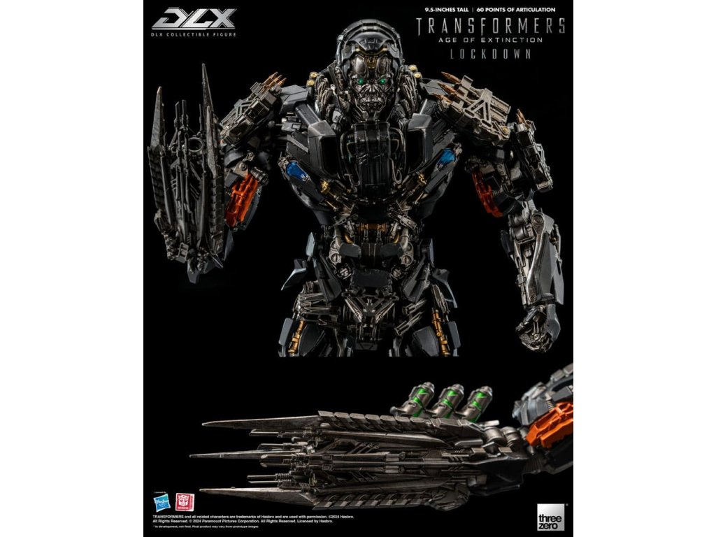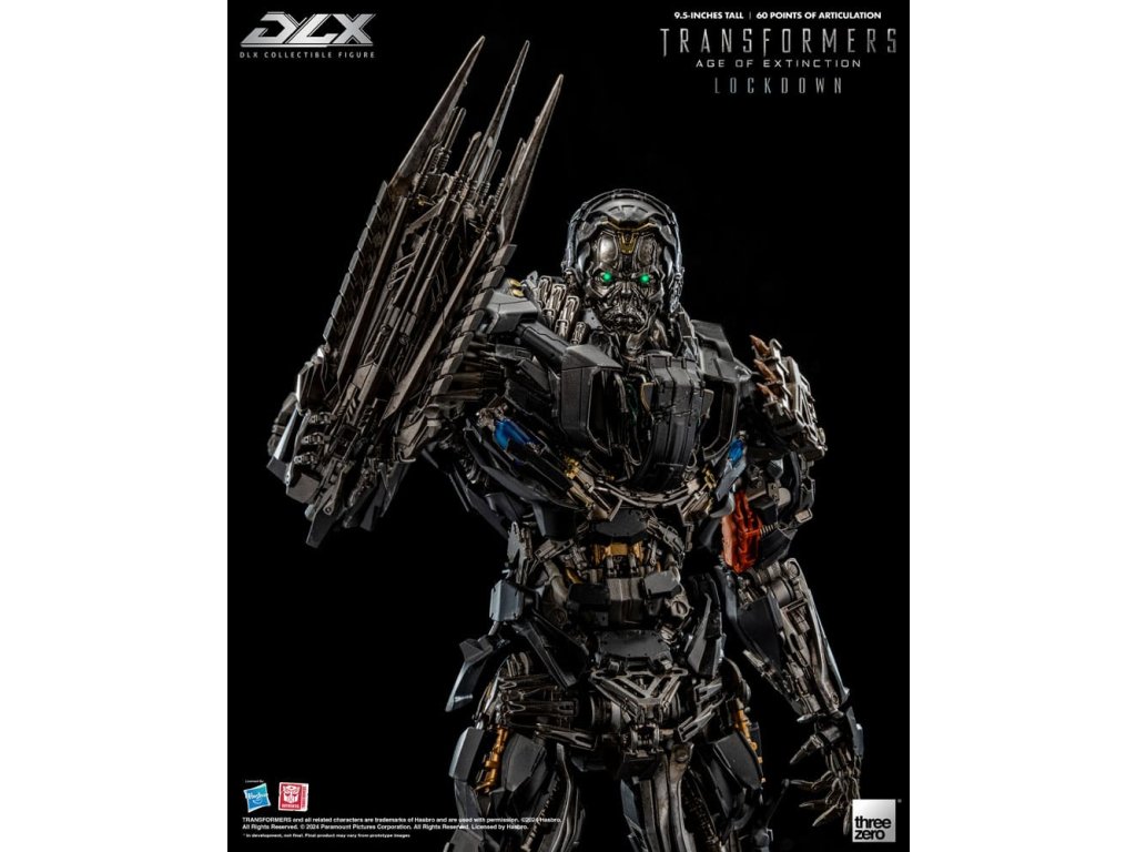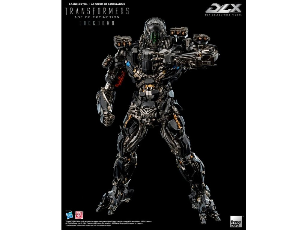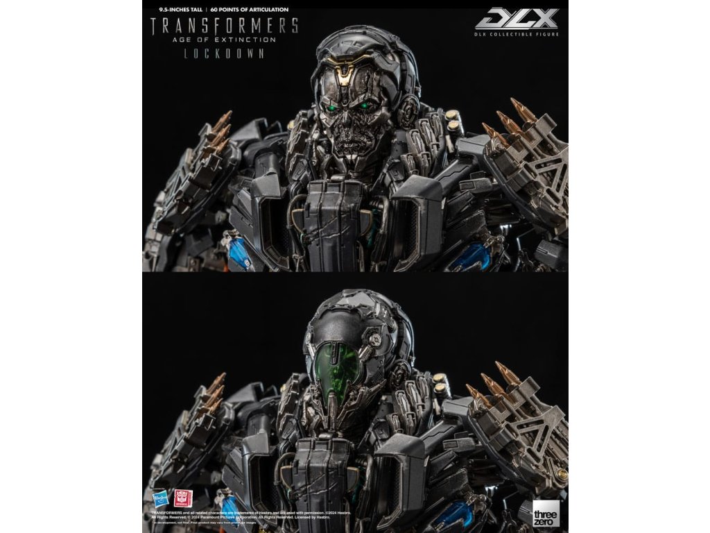 threezero s hrdostí prezentuje nechvalně proslulého nájemného lovce a najatého vraha z filmu Transformers: Doba zániku, Lockdown! DLX Lockdown z Transformers: Doba zániku stojí přibližně 24 cm vysoký a má přibližně 60 bodů ohybu. Figurka je vybavena díly z lisovaného kovu na konstrukci z inženýrských plastů, která umožňuje dynamickou škálu pohybů, trvanlivost a vynikající stabilitu. DLX Lockdown disponuje nesmírně detailním sochařským zpracováním s podpisovou povětrnostně zpracovaným nátěrem threezero, aby replikoval vzhled, jak byl vidět ve filmu, různé zbraně umožňují rekonstrukci různé scény bitev. DLX Lockdown obsahuje ohromující množství detailů. Jeho oči jsou osazeny LED světelnými efekty (vyžadují baterie typu AG13 x 2, baterie nejsou součástí balení). Příslušenství obsahuje bojovou masku s průhledným dílem, dělo na obličej, extraktor jisker, blástr, hák, čepel na ruce a nůž. Bojová maska může být magneticky připevněna k hlavě figurky, dělo na obličej a blástr jsou vybaveny LED světelnými efekty (každý vyžaduje baterie typu AG3 x 2, baterie nejsou součástí balení). Když je spárovaný se 4 sadami vyměnitelných rukou (jednou dvojicí pěstí, jednou levou ukazující rukou, jednou párem akčních rukou a jedním párem rukou držících zbraň) a stojanem pro akci DLX, je výsledkem impozantní prezentace. **Tento produkt má také výstavní exkluzivní edici [3Z0881], která zahrnuje další termální kamerový obličejový díl a díl energetického jádra, znovu vytváření scény z filmu, kdy Lockdown loví Autoboty! VLASTNOSTI - Oficiálně licencované od Hasbro - Vysoký přibližně 9,5 palce (24 cm) - Přibližně 60 bodů ohybu - Kovový rám se sofistikovanou možností ohybu - Detailní a povětrnostně zpracovaný nátěr - LED osvětlené oči* a zbraně* - Magnetická část hlavy# - Bojová maska s průhledným dílem# PŘÍSLUŠENSTVÍ - 1 x Bojová maska - 1 x Dělo na obličej* - 1 x Extraktor jisker - 1 x Blástr* - 1 x Hák - 1 x Čepel na ruce - 1 x Nůž - 1 x sady vyměnitelných rukou: jedna (1) dvojice pěstí, jedna (1) levá ukazující ruka, jedna (1) dvojice akčních rukou a jedna (1) dvojice rukou držících zbraň - 1 x DLX stojan pro akci LED VLASTNOSTI - Oči - Dělo na obličej - Blástr* Oči vyžadují baterie AG13 x 2, baterie nejsou zahrnuty* Obě zbraně vyžadují baterie AG3 x2 (celkem 4), baterie nejsou zahrnuty.