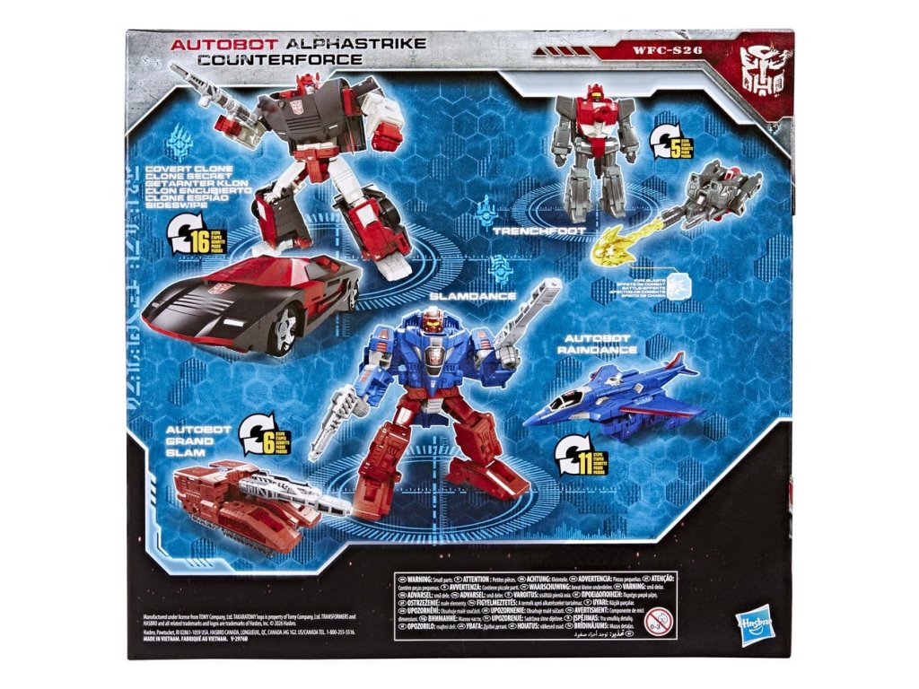 Tento balíček Autobot Alphastrike Counterforce zahrnuje 3 figurky: Deluxe Slamdance, G2 deco'd Deluxe Covert Clone Sideswipe a figurku Battle Masters, Trenchfoot.