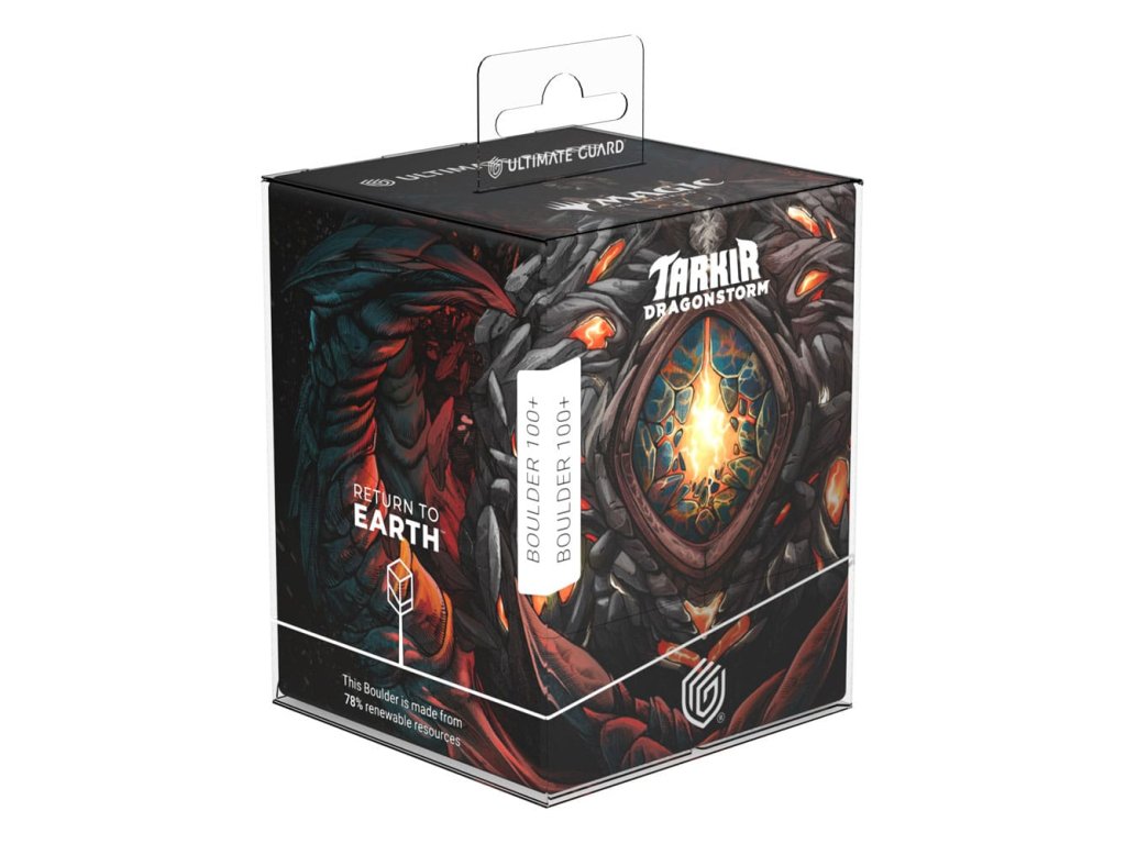 Boulder RTE 100+ je pevná a spolehlivá krabička na karty s bezpečným zavíráním, která pojme až 100 dvojitě fóliovaných karet (120 v jediném fólii). Odolný a jasný kompletní barevný tisk zobrazuje oficiálně licencované umělecké dílo Mox Jasper od DZO z Magic: The Gathering’s Tarkir: set Dragonstorm. Boulders z naší série Návrat na Zemi jsou udržitelně vyrobeny, vyrobeny z 78% obnovitelných surovin v Německu a tam také tisknuty. Navíc je balení vyrobeno z 100% recyklovaného materiálu.