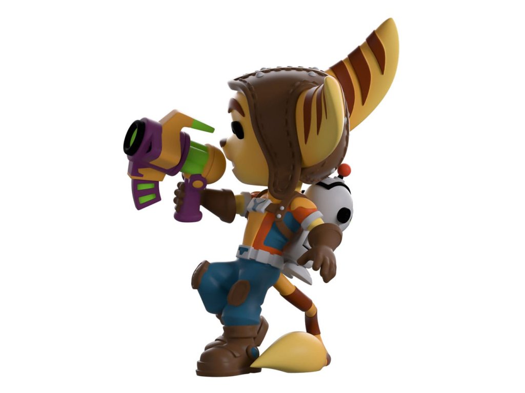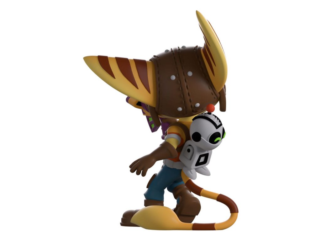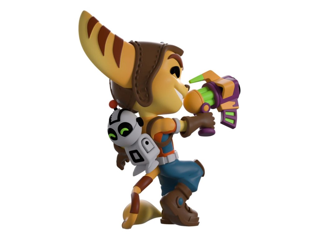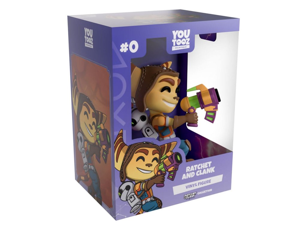 'To bude jako ve starých časech!' Je to... portál?! To může znamenat jen jednu věc! Ratchet a Clank se připravují na svůj debut na Youtoozu! S výškou 4,7 palce a opírající se o svůj dlouhý pruhovaný ocas, Ratchet míří se zbraní Burst Pistol, kterou má vystřelovanou v ruce, zatímco na jeho oranžové tváři přebíhá chytrý úsměv a dlouhé uši mu trčí z hnědého klobouku na hlavě. Nosí oranžovou a modrou košili, modré kalhoty a hnědé boty, jeho věrný kamarád Clank sedí na jeho zádech s jasně zelenými očima a rudým anténou, která trčí z vrchu jeho šedého těla. Na vnějším balení vidíme duo vyskakovat z fialové trhliny. Zatímco interiér je točící se bílá vířivka, která střílí prameny elektrického proudu na hluboké fialové pozadí, ochranný obal je tmavě modrý s kovovou deskou na spodku, kde lze vidět jejich figurky skrz velké průhledné okno na přední straně balení. Tento sběratelský předmět je dodáván v matném, reliéfním, chráněném vnějším obalu a v plastovém chrániči přizpůsobeném na míru pro maximální ochranu během dopravy.O hře Ratchet and Clank: Rift Apart: Ratchet and Clank: Rift Apart je plošinová dobrodružná hra vyvinutá Insomniac Games a vydána Sony Interactive Entertainment. Devátá hra v sérii Ratchet and Clank, kde se duo pomocí každého nástroje, který mají k dispozici, včetně cestování mezi dimenzemi, snaží zabránit tomu, aby se jejich galaxie neroztrhala na kusy.