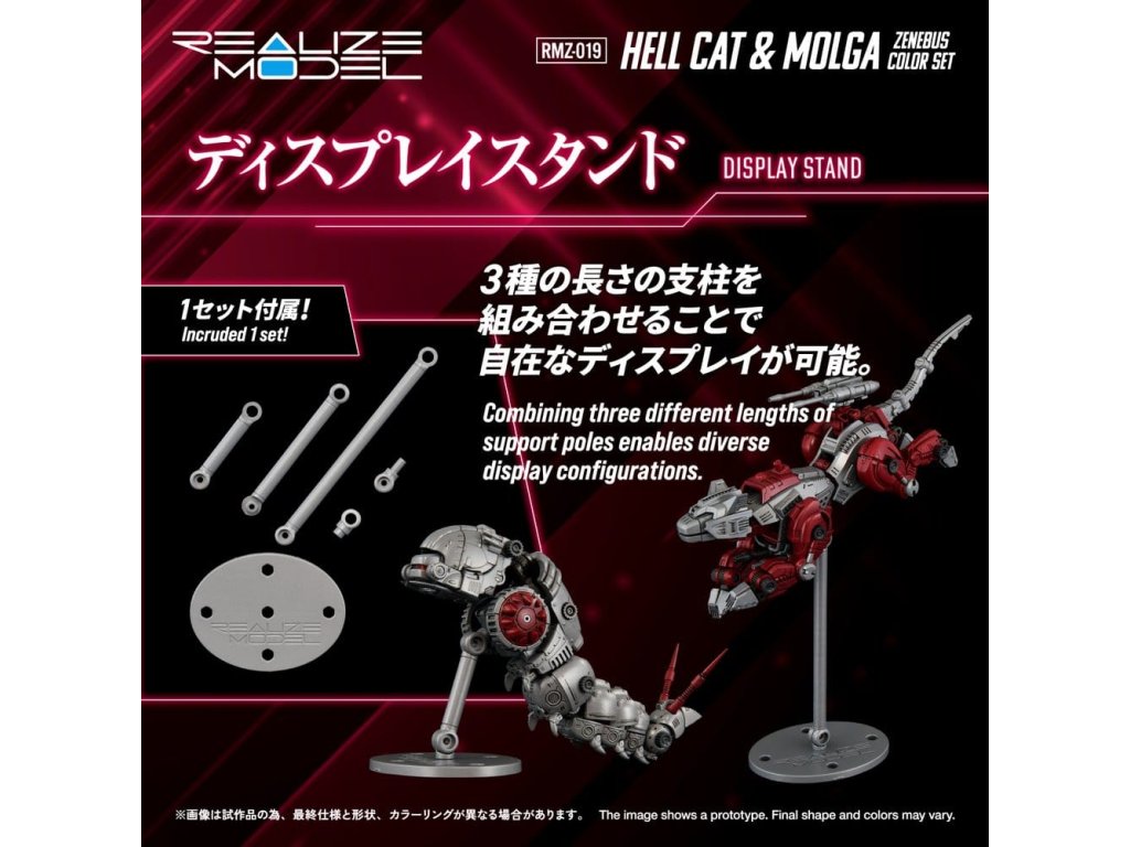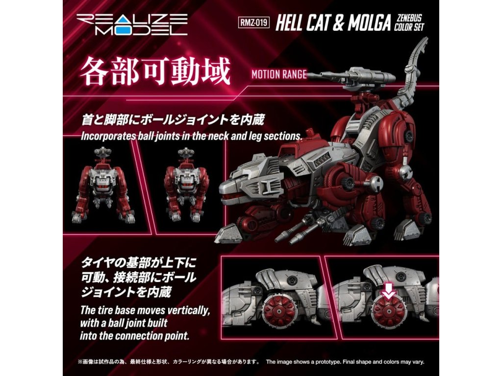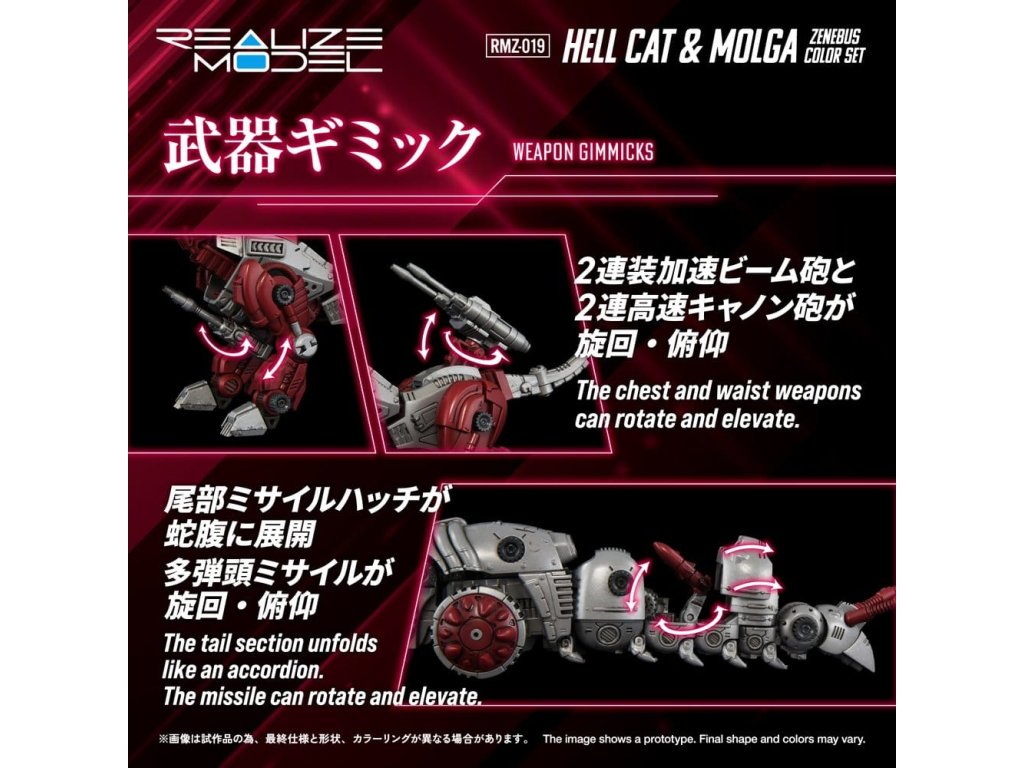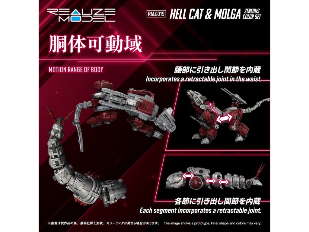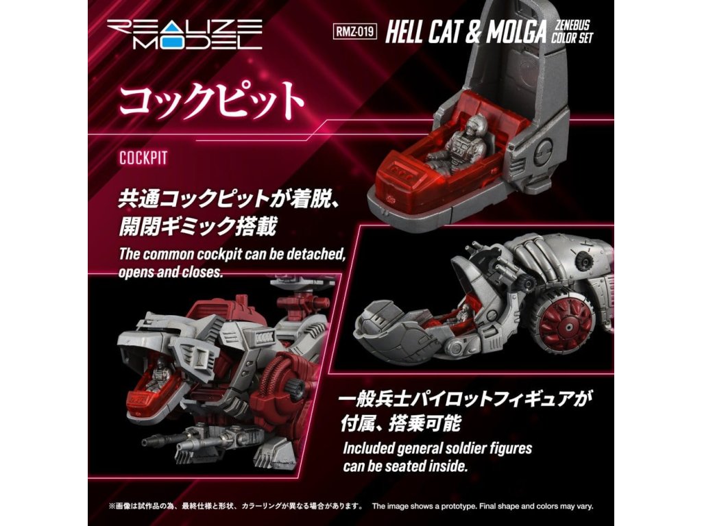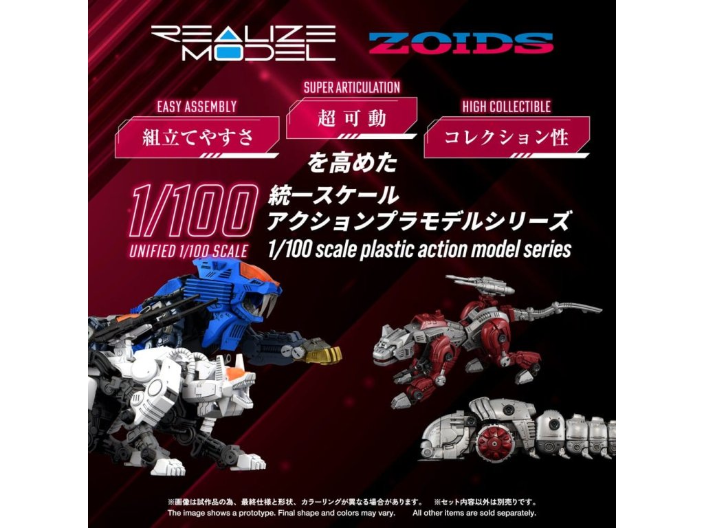 「REALIZE MODEL」1/100 Měřítko Akční plastová modelová řada. 1/100 měřítková akční plastová modelová série, která zlepšuje 'super artikulaci', 'lehkost sestavení' a 'sběratelnost'. Z hlediska uživatele, nejen co se týče počtu dílů, ale také měřítka, designu a struktury, vtěluje každý ideál. Speciálně navržený systém artikulace umožňuje pohyb celého těla, což umožňuje dynamické akční pózy charakteristické pro levhartí a housenkové typy Zoids. Mezi vrcholy patří charakteristický průhledný červený kanopi a věrná reprodukce původního Zenebus barevného schématu prostřednictvím formovaných barev. Součástí jsou dvě figurky pilota (standardní vojáci), které lze umístit do sdíleného kokpitu.
