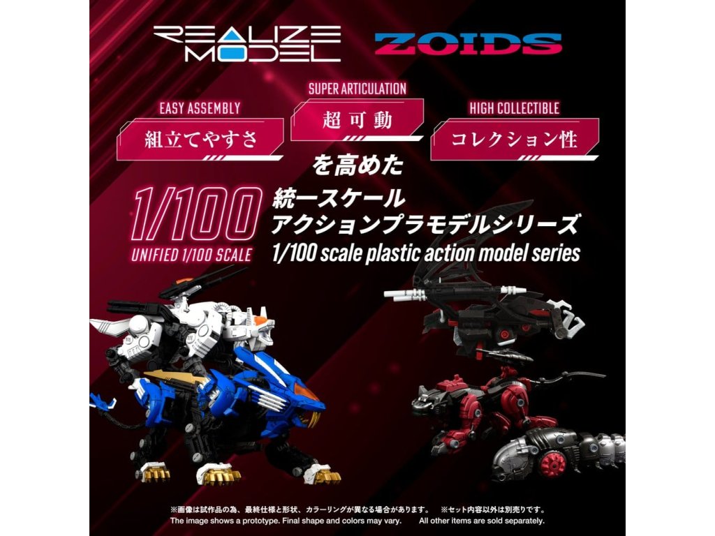 SKUTEČNÝ MODEL v měřítku 1/100. Sada pro pohyblivý plastový model 1/100, která zvyšuje „super artikulaci“, „snadnost sestavení“ a „sběratelnost“. Model naplno představuje všechny ideály tím, že sleduje perspektivu uživatele - nejen počet dílů, smysl pro měřítko, design a strukturu. Speciálně navržený systém artikulace umožňuje celotělový pohyb, což umožňuje různé akční pózy specifické pro vlčí typ Zoids, jako je řvát a sprintovat. Zbraně umístěné po celém těle jsou pohyblivé, což umožňuje rekonstruovat různé bojové scény z anime. Zbraně a další brnění. Kromě montážních bodů byl design části hlavy upraven tak, aby se rozšířil rozsah pohybu. Součástí jsou také díly pro standardní vlk příkazu, které umožňují jeho sestavení jako aktualizovanou verzi s vylepšenou artikulací.