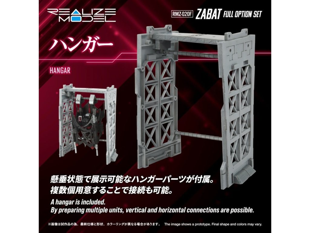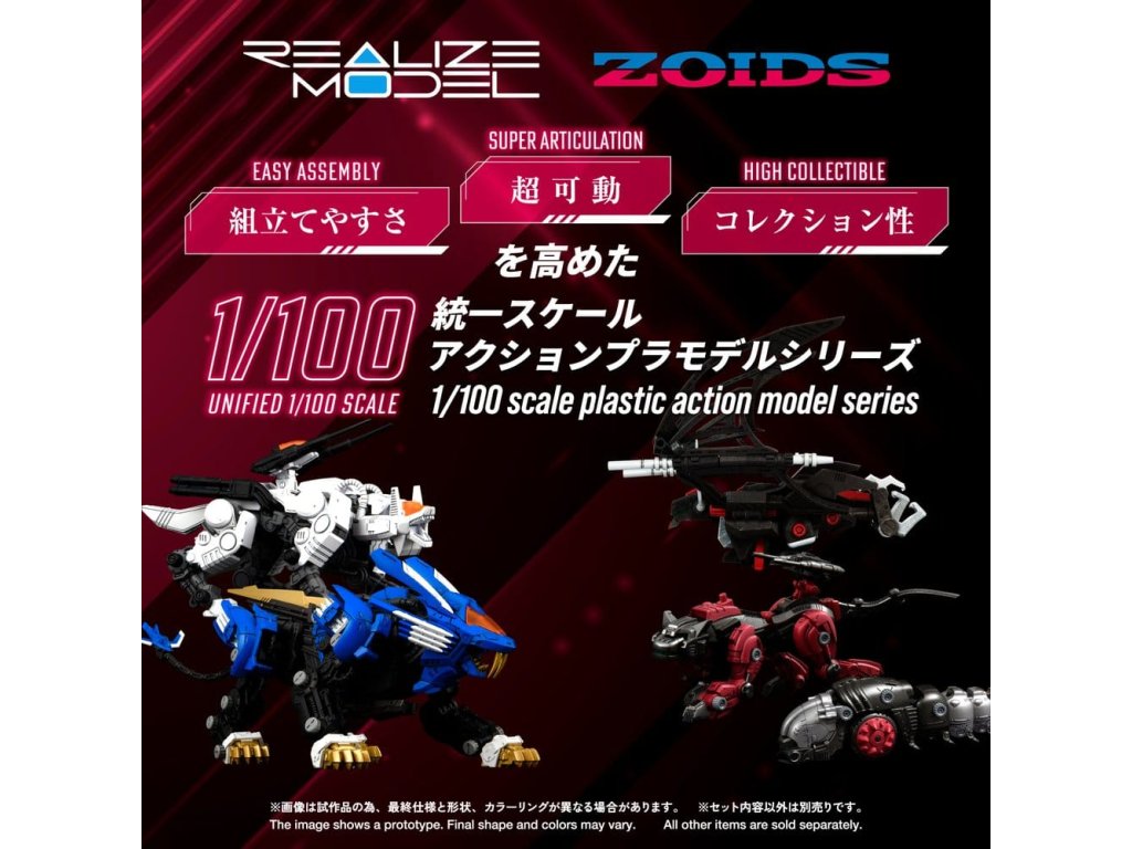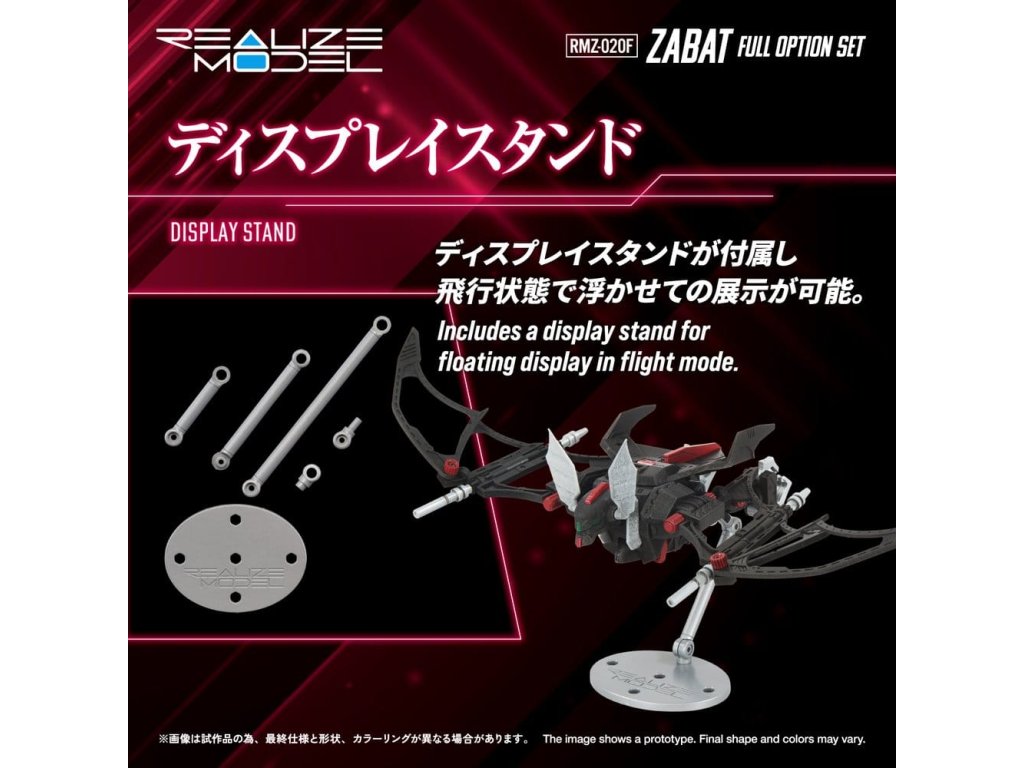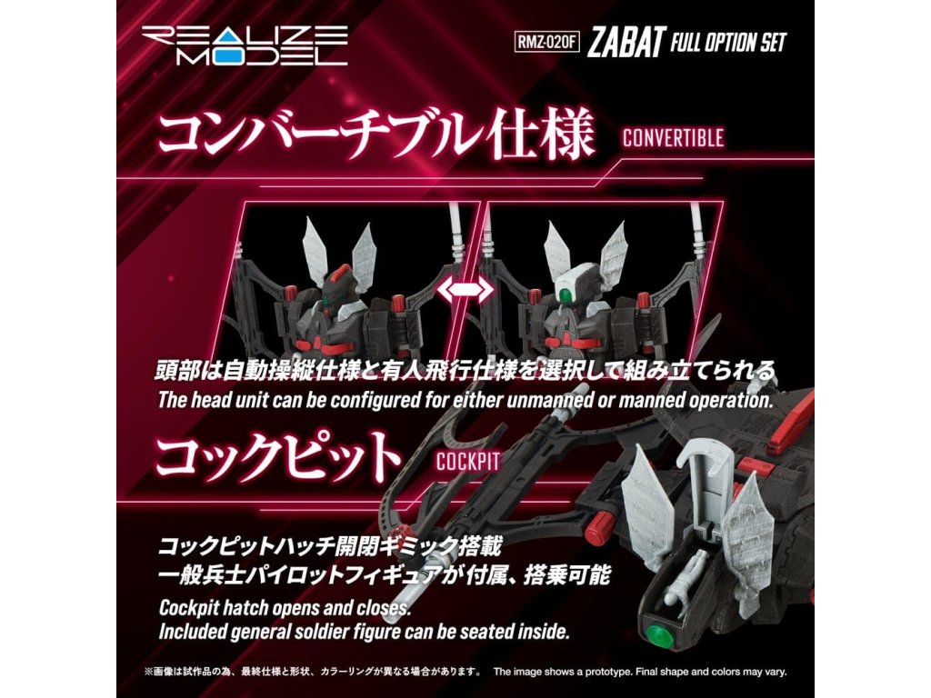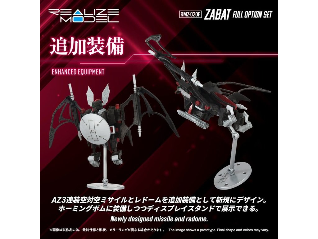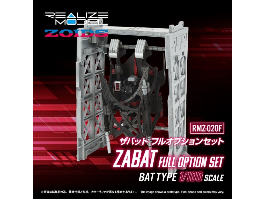 REALIZE MODEL 1/100 stupně akčního plastového modelu SerieS 1/100 je série akčních plastových modelů, která zlepšuje 'super artikulaci', 'snadnou montáž' a 'sběratelnost'. Pohledem uživatele se nezastavuje jen u počtu dílků, ale také u měřítka, designu a struktury a vtělila každý ideál. Deluxe verze RMZ-020 ZABAT s mnoha dalšími díly. Jeho speciálně navržená artikulace umožňuje pohyb celého těla, čímž umožňuje různé akční pózy jedinečné pro netopýří zoids, jako jsou letové pózy a visící pózy. Homingové bomby uložené v břiše jsou vyjímatelné. Spodní strana může být zobrazena s vystavenými nebo zataženými pneumatikami. Navíc může být vybaven buď trojitými protiletadlovými střelami nebo radomem jako volitelné díly. Součástí je také věšák pro jeho zavěšení a základna pro jeho zobrazení v letu. Hlava může být sestavena buď v autopilotním režimu nebo v režimu pilotovaného letu. Je zahrnuta figurka pilota (vojáka), která může sedět v kokpitu pro režim pilotovaného letu.