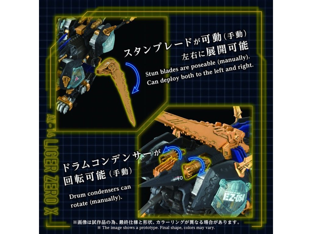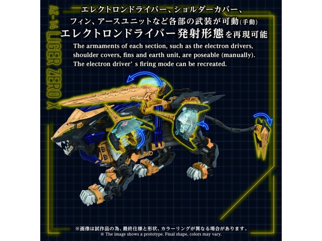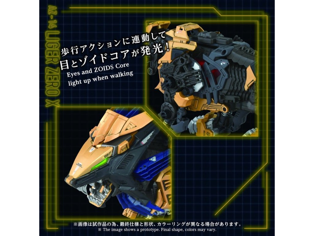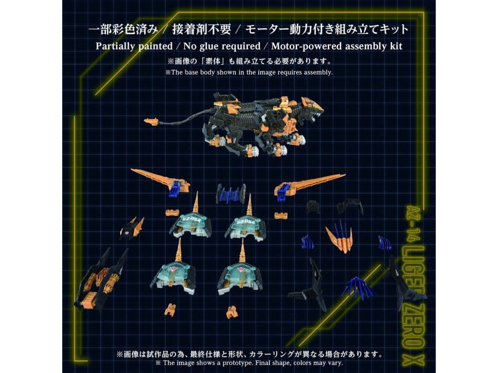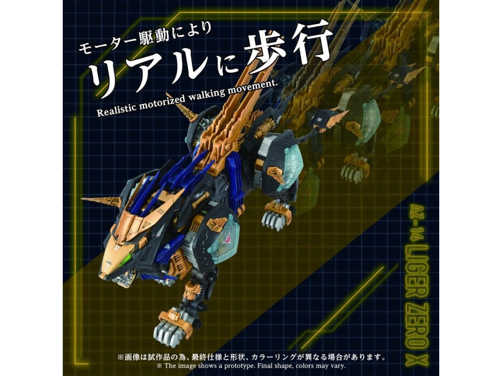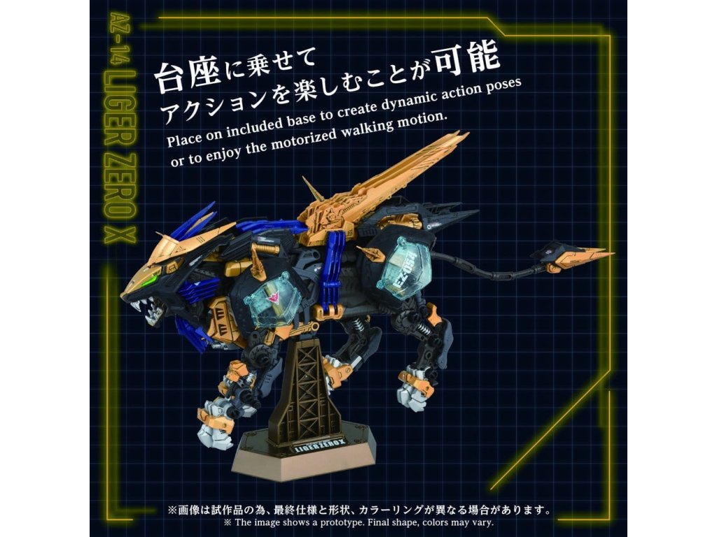 POKROČILÉ sărie pohybových konštrukčních kitov ZiZOIDS. Tato série zastupuje krok směrem k další evoluci, pokrok společného smyslu. Na základě témat nastavených pro každé ZOIDS, tato vrcholná značka ztělesňuje ultimátní formu pohybového kitu, zahrnuje 'rekonstrukci', 'vylepšení' a 'dokonalost'. Tento produkt je montážní kit v měřítku 1/72. Aktivace elektrické jednotky napodobuje realistický zvířecí pohyb, oči a hrudník jsou osvětleny LED diodami. Díly včetně krytů ramen, ploutví, bubnových kondenzátorů, zemní jednotky a zadního elektro-ovladače jsou manuálně pohyblivé. Odebrání X jednotky umožňuje rekonstrukci 'základního rámu'. Obsahuje nepomalovanou figurku standardního vojáka v měřítku 1/72, která může být usazena v kokpitu. Umístění na přiložený podstavec umožňuje užít si jeho chůzi hned tam.