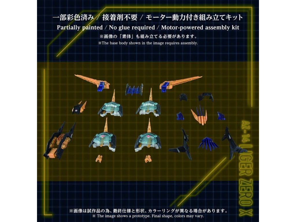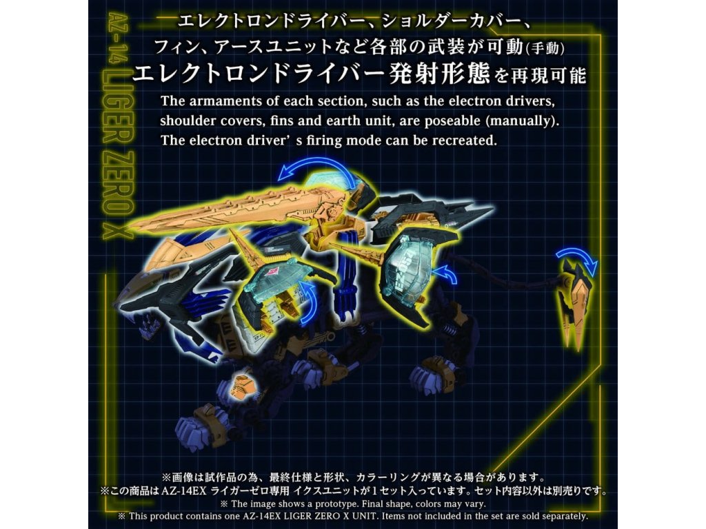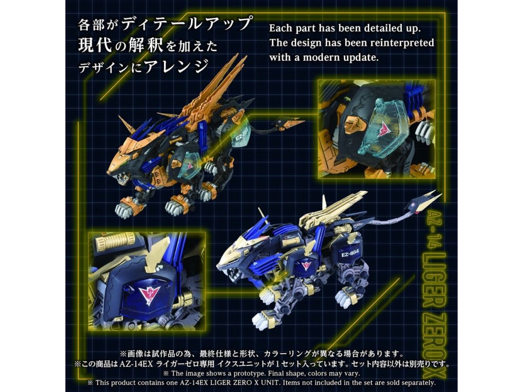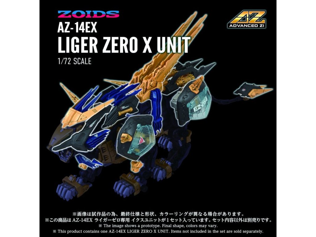 Pokročilá série sestavitelných modelů ZOIDS ADVANCED - Tato série představuje krok směrem k další evoluci, rozvoji zdravého rozumu. Na základě témat stanovených pro každého ZOIDa, tato špičková značka představuje nejvyšší formu sestavitelného modelu, zahrnující 'rekonstrukci', 'zdokonalení' a 'broušení'. Tento produkt je stavebnicí v měřítku 1/72. Tento produkt obsahuje pouze jednotku (díly), které jsou nezbytné k rekonstrukci Liger Zero X v kombinaci s AZ sérií Liger Zero (základní jednotkou), jako je AZ-02EX2 Liger Zero specifikace Impérium (prodává se samostatně) nebo AZ-02 Liger Zero (prodává se samostatně). Po vybavení jsou různé části, jako jsou kryty ramen, ploutve, bubnové kondenzátory, zemní jednotka a zadní elektrodriver, manuálně pohyblivé. Součástí je nepomalovaná figura pilota standardního vojáka v měřítku 1/72, kompatibilní s kokpitem Liger Zero (prodává se samostatně).