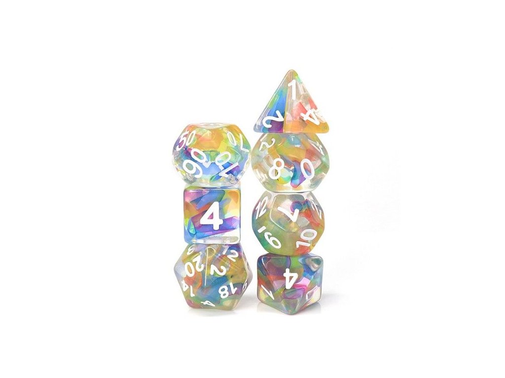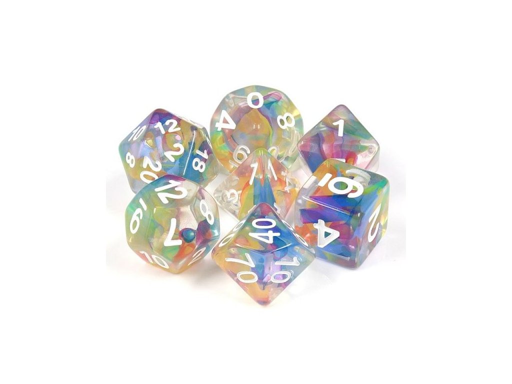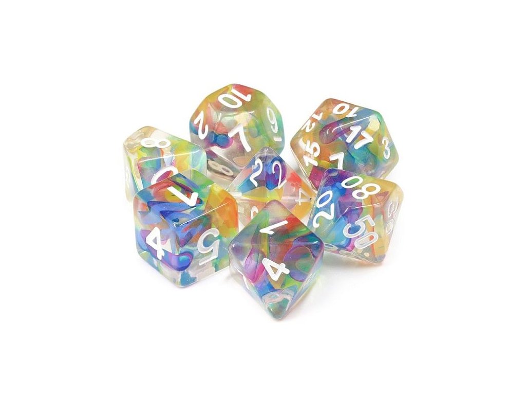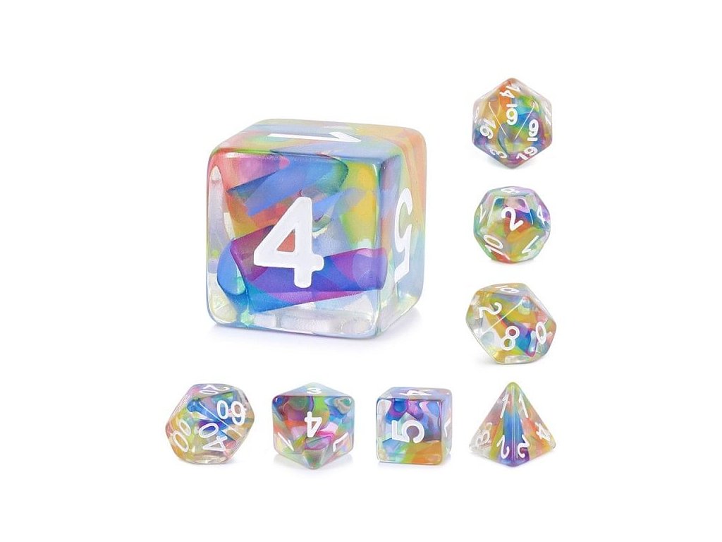 Sada sedmi průsvitných vícestranných kostek (k4, k6, k8, k10, k12, k20 a k%) protkaných duhovými barvami.Diskuze