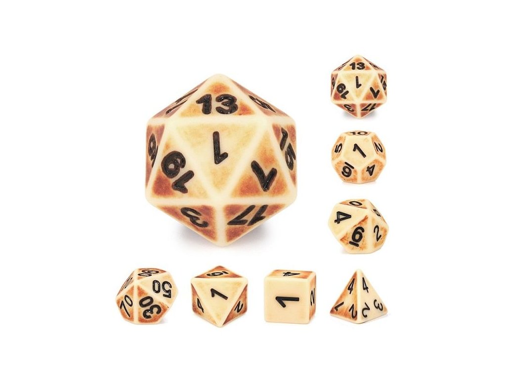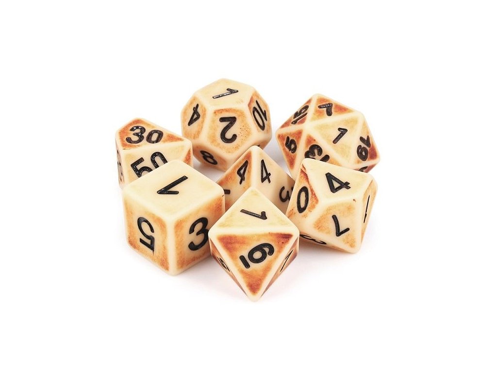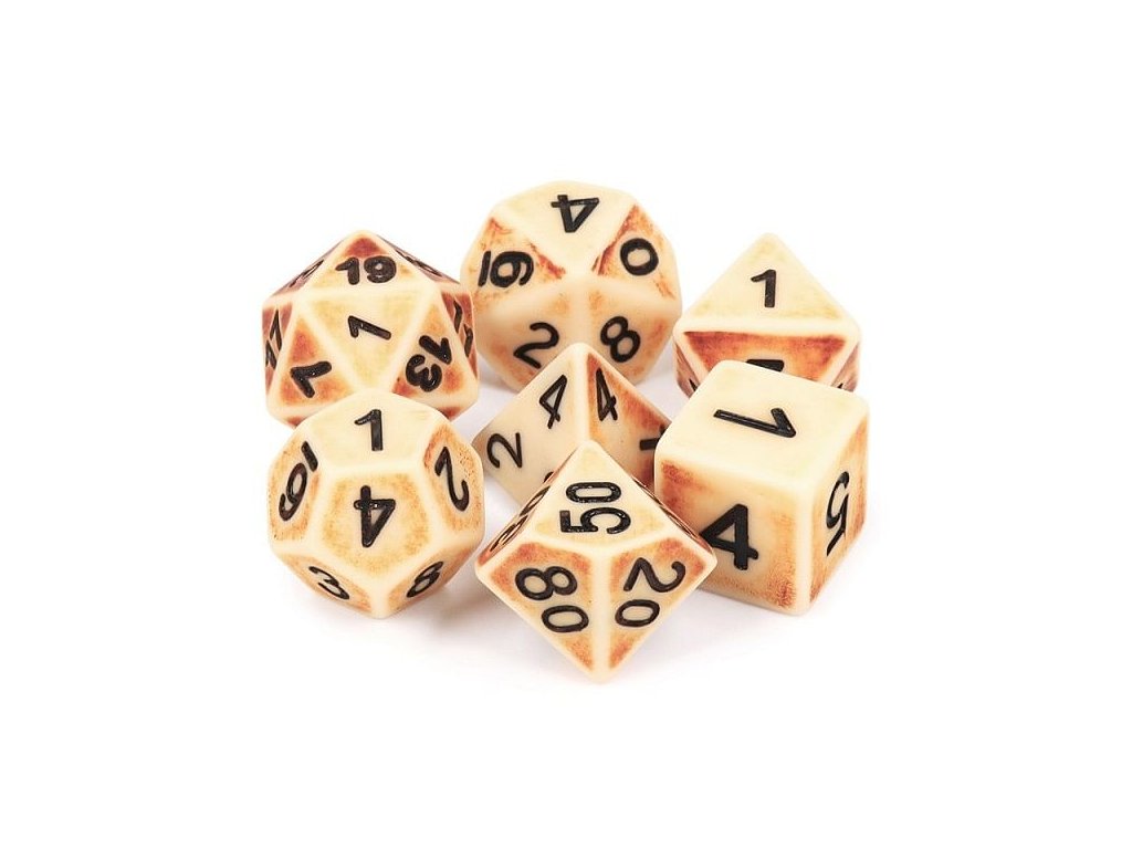 Orginální sada čítající sedm různostranných kostek (k4, k6, k8, k10, k12, k20 a k%), pocta starým RPG. Kostky mají starobylou patinu a krásné ostré hrany.