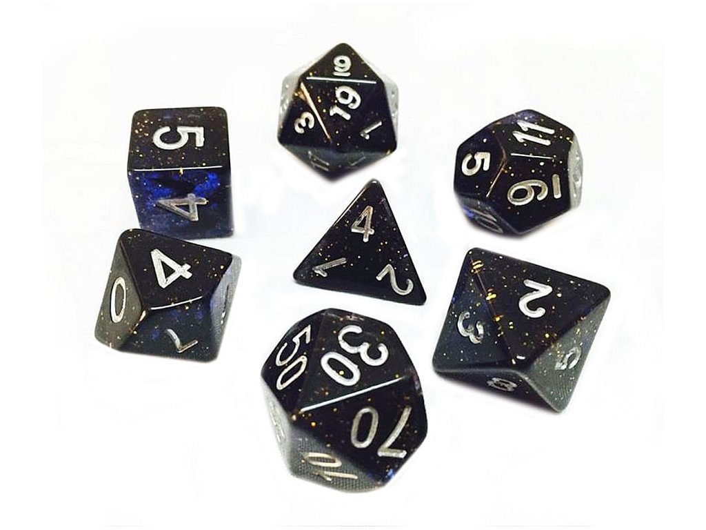 Sada sedmi vícestranných kostek (k4, k6, k8, k10, k12, k20 a k%) v magickém provedení evokujícím nekonečnou hloubku vesmíru.