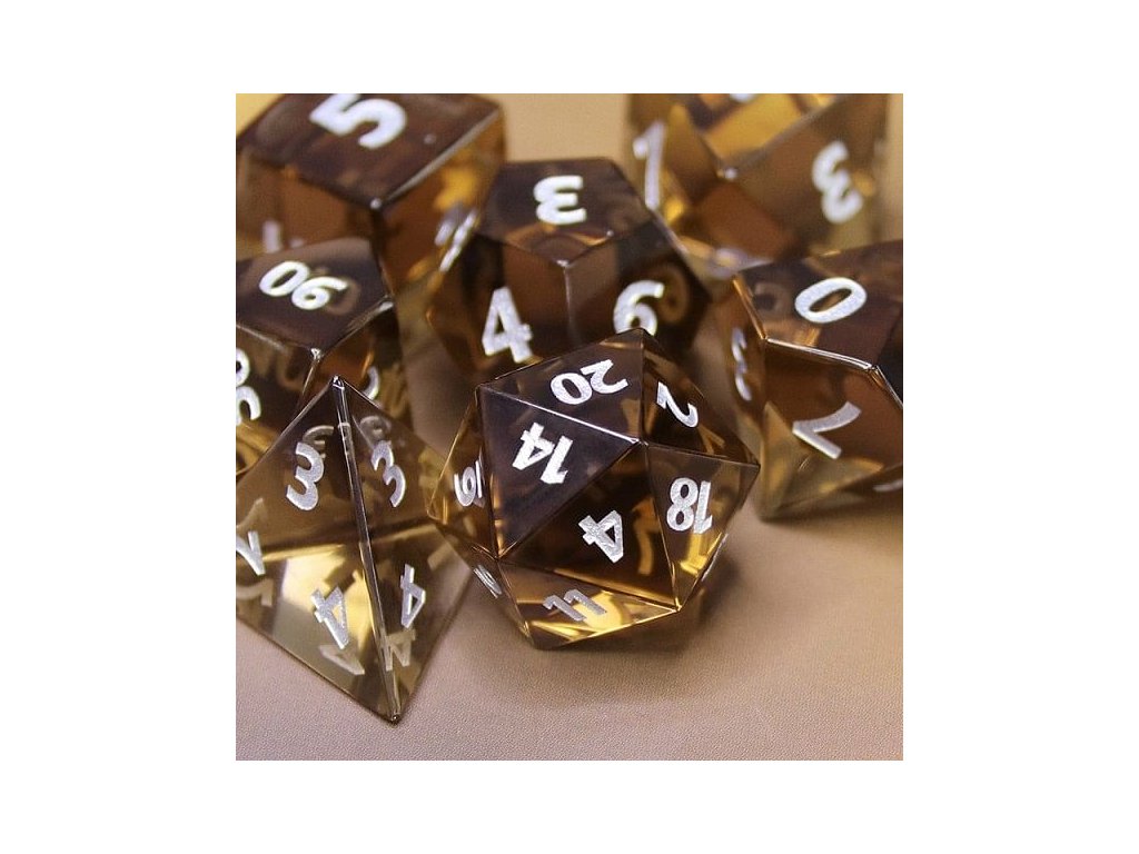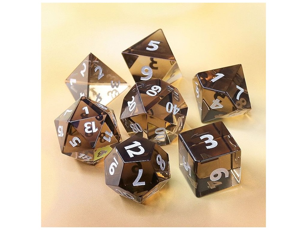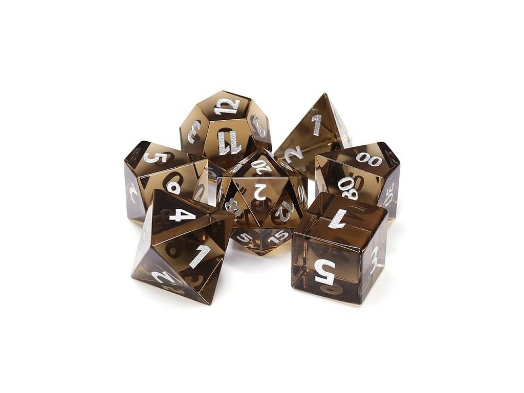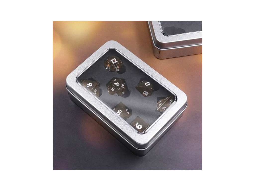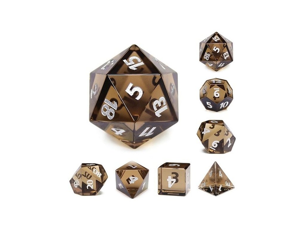 Sada skleněných kostek barvy šampaňského se hodí k vašim oblíbeným deskovým hrám a hrám na hrdiny. Sada je balena v plechové krabičce. Kostky doporučujeme házek na měkkém povrchu nebo použít spolu s některou z házecích podložek. Kostky mají elegantní design s ostrými hranami, v balení naleznete sedm kostek (k4, k6, k8, k10, k12, k20 a k%).sada sedmi kostek