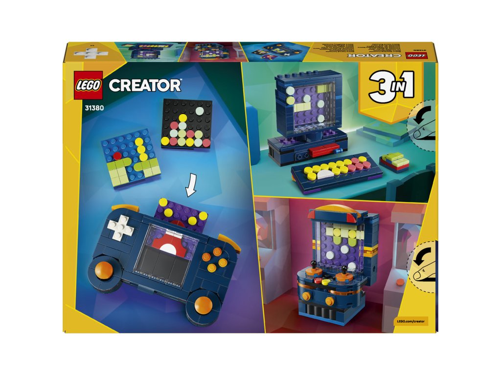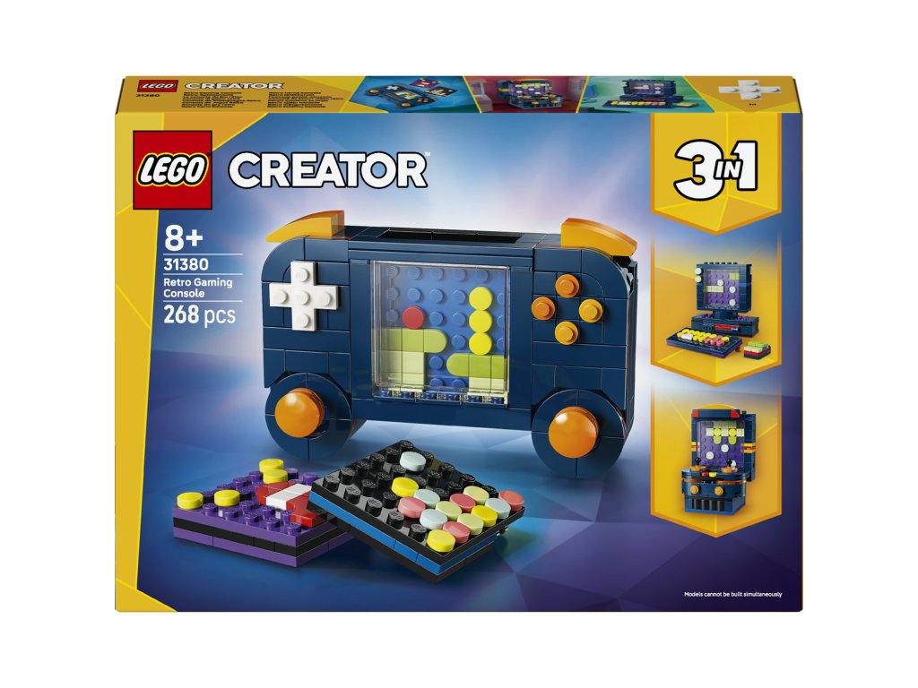 Děti a malí gameři od 8 let si zamilují stavění, hraní a vystavování stavebnice LEGO® Creator 3 v 1 Retro herní konzole (31380). Tato detailně propracovaná a zábavná dekorace do pokojíčku milovníka videoher nabízí 3 různé možnosti stavění ze stejné sady kostek. Kluci a holky si můžou postavit přenosnou herní konzoli se 2 pohyblivými joysticky a 2 pohyblivými tlačítky a 3 herní moduly, které lze vložit do konzole. Tu pak mohou přestavit na stolní mini počítač klávesnicí a monitorem, diskem, který lze vložit dovnitř, a myší, nebo na arkádový herní automat. Tato stavebnice LEGO Creator 3 v 1 podnítí dětskou fantazii a představuje skvělý dárek pro gamery a dospělé, jež naladí na vlnu nostalgie. A díky aplikaci LEGO Builder si děti užijí snadné a intuitivní stavitelské dobrodružství. Své modely můžou přibližovat a otáčet ve 3D, sledovat pokrok ve stavění a ukládat stavebnice na jednom místě. Upozornění: Modely nelze sestavit najednou. Stavebnice obsahuje 268 dílků.