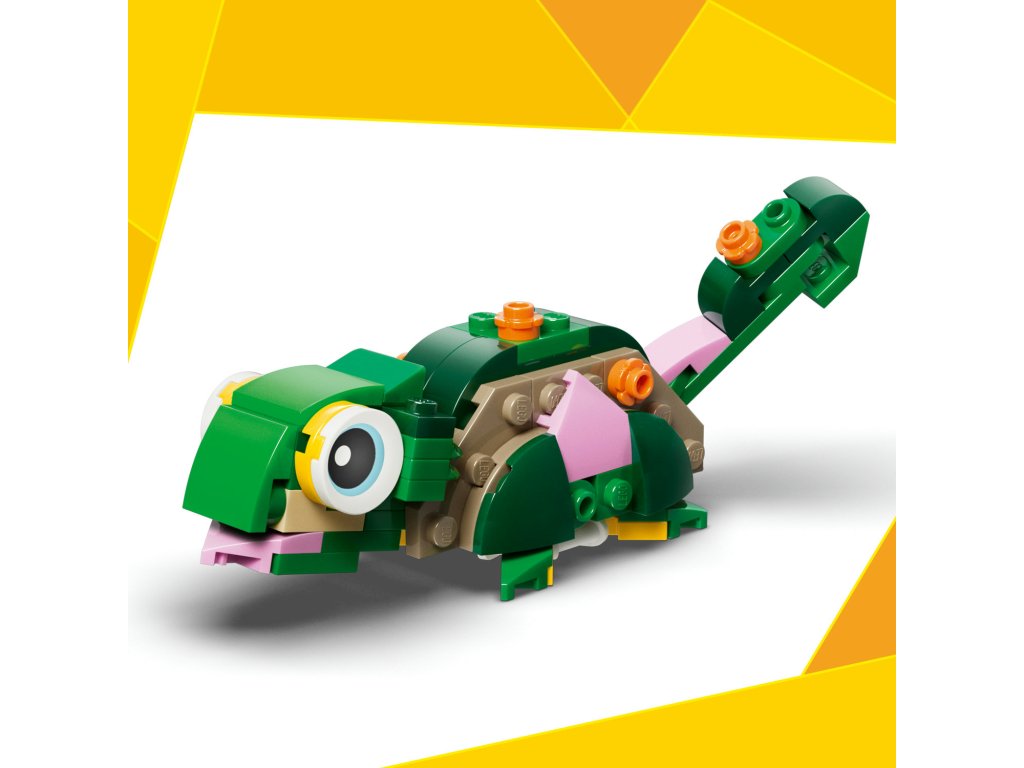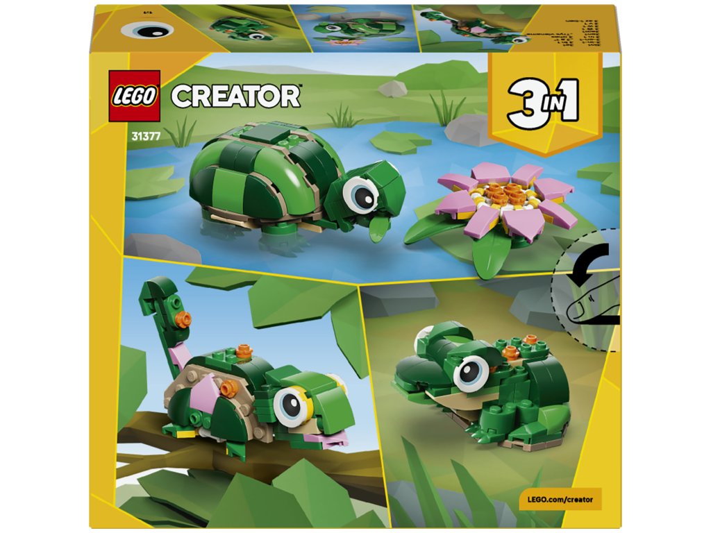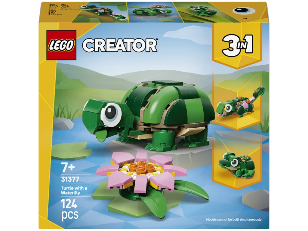 Stavebnice LEGO® Creator 3 v 1 Želva s leknínem (31377) umožňuje dětem od 7 let hrát si se zvířátky a vymýšlet kreativní příběhy. Tato roztomilá zvířecí hračka pro holky i kluky nabízí 3 různé možnosti stavění ze stejné sady kostek. Děti si mohou vybrat, jestli si postaví želvu s pohyblivou hlavou a tlamou a krásným růžovým leknínem, kterou pak lze přestavit na chameleona s pohyblivou hlavou a ocasem nebo na žábu s pohyblivou tlamou. Až si děti dohrají, jednotlivé modely si můžou vystavit jakozábavnou dekoraci do pokoje. Tato stavebnice LEGO Creator 3 v 1 podnítí dětskou fantazii a představuje roztomilý dárek pro holky a kluky, kteří mají rádi divoká zvířátka a užívají si vymýšlení příběhů. A díky aplikaci LEGO Builder si děti mohou vyzkoušet snadné a intuitivní stavitelské dobrodružství. Své modely mohou přibližovat a otáčet ve 3D, sledovat pokrok ve stavění a ukládat stavebnice na jednom místě. Upozornění: Modely nelze sestavit najednou. Stavebnice obsahuje 124 dílků.