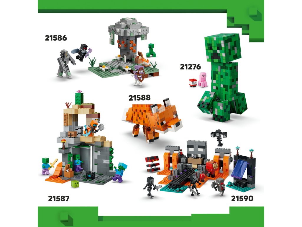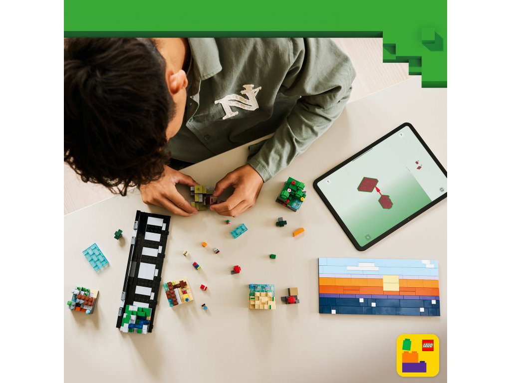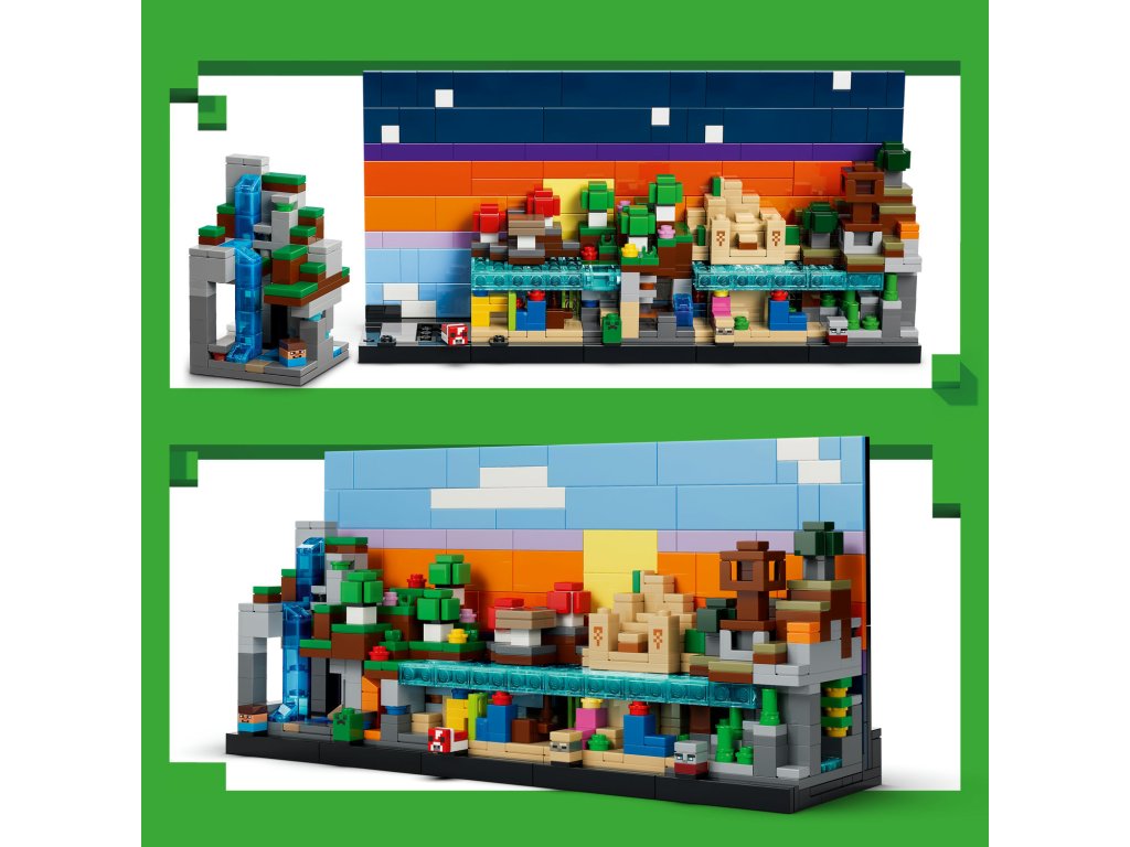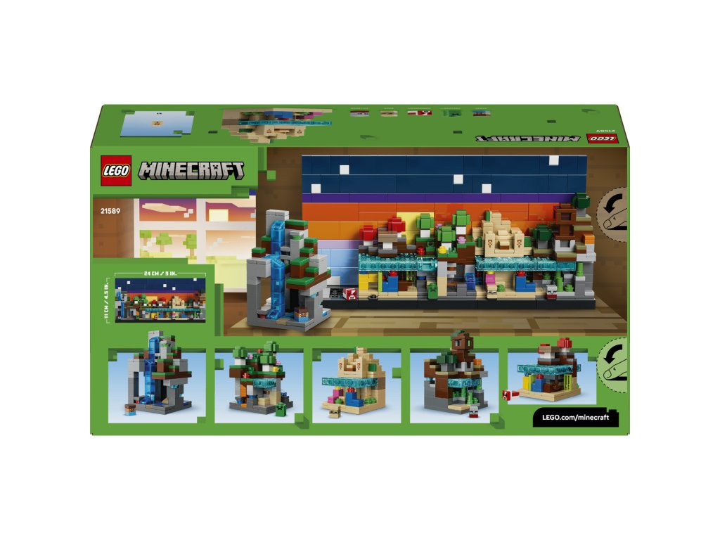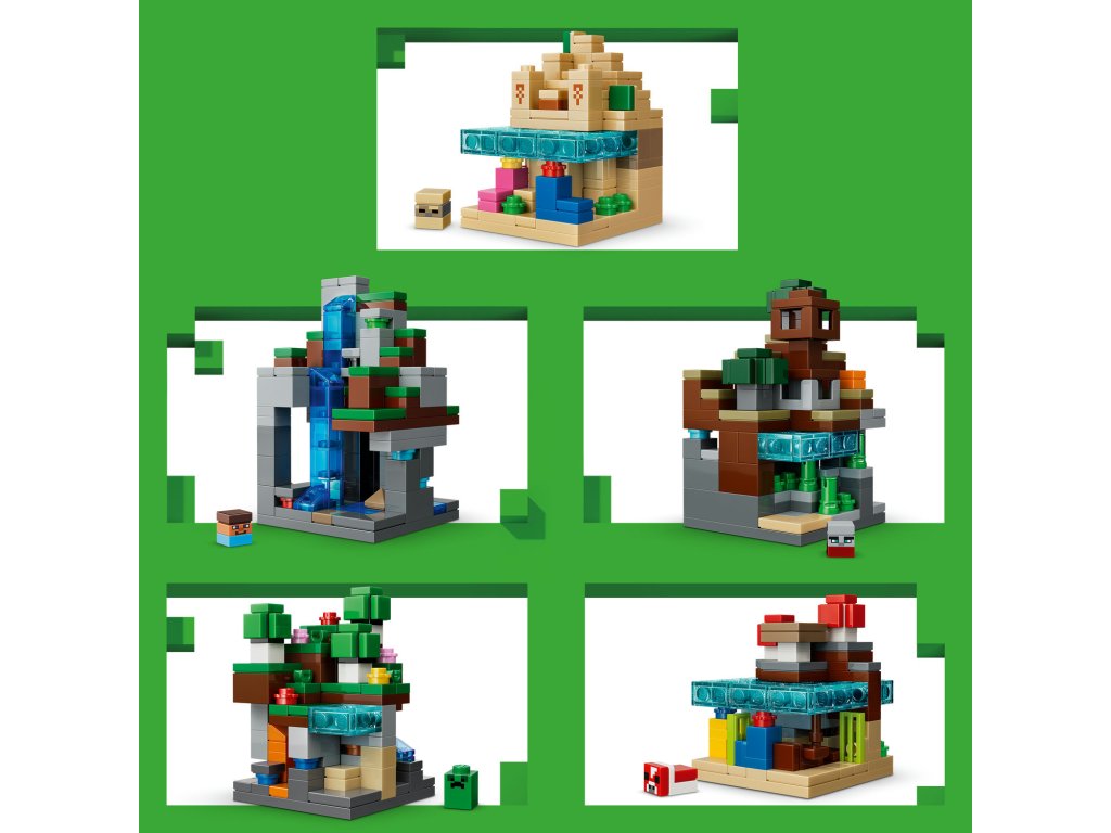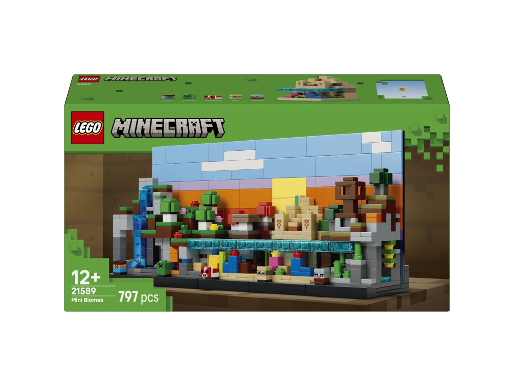 Vzdejte hold biomům ze světa Minecraft® se stavebnicí LEGO® Minecraft® (21589) Mini biomy pro holky a kluky od 12 let. Milovníci Minecraftu ukážou světu svou lásku k videohrám díky modelu s 5 biotopy a 5 mikro figurkami: Stevem, Creeperem, krávomůrkou, Huskem a plenitelem. Tato stavebnice LEGO Minecraft obsahuje 5 odnímatelných biomů: hory s krápníkovou jeskyní, ametystovou geodou a vodopádem, květinový les s jeskyní, lávou a zlatem, houbové pole s korálovým útesem, vrakem lodi, 2 červenými houbovými stromy a hnědou houbou, poušť s chrámem, korálovým útesem, oceánem, kaktusy a truhlou s pokladem a savanu se základnou plenitelů, bujnou jeskyní, akáciovými stromy, dýní, lávou a pláží. Součástí je také také oboustranné pozadí (den/noc). Tato stavebnice představuje skvělý videoherní dárek pro hráče Minecraftu a fanoušky LEGO. A děti můžou stavět s jistotou díky aplikaci LEGO Builder – přibližujte a otáčejte model ve 3D a sledujte postup pomocí srozumitelného digitálního návodu. Stavebnice obsahuje 797 dílků.