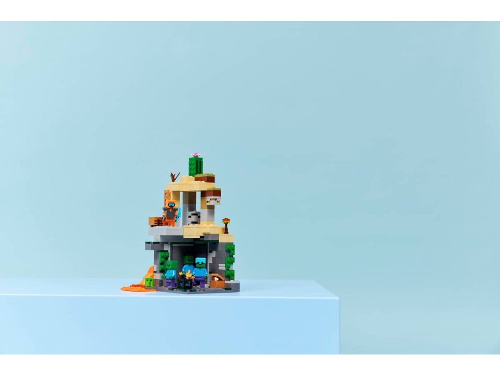 - HERNÍ STAVEBNICE – Tato stavebnice z pouštního biomu Minecraftu obsahuje spoustu kreativních prvků, které podněcují fantazii, jako je otočná komora, z níž se vynořují zombie, a posuvný díl, který spouští sesuv kamení