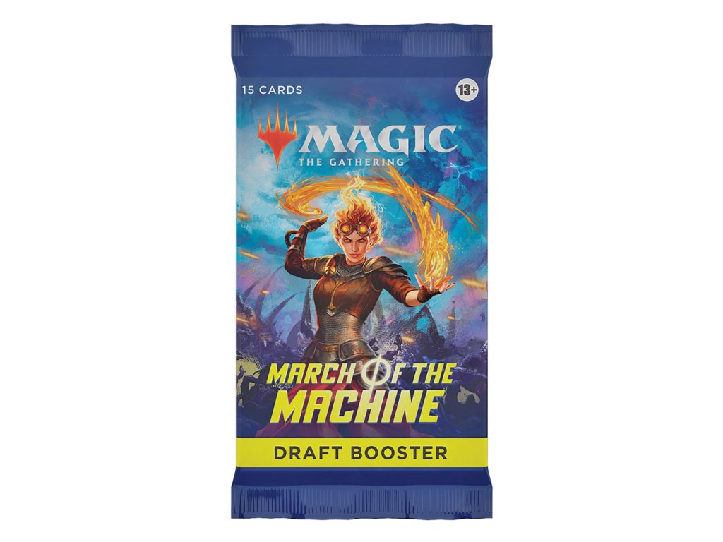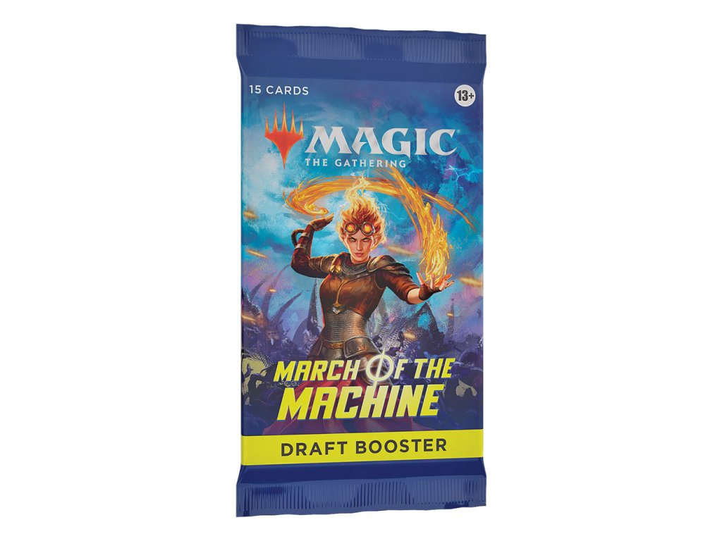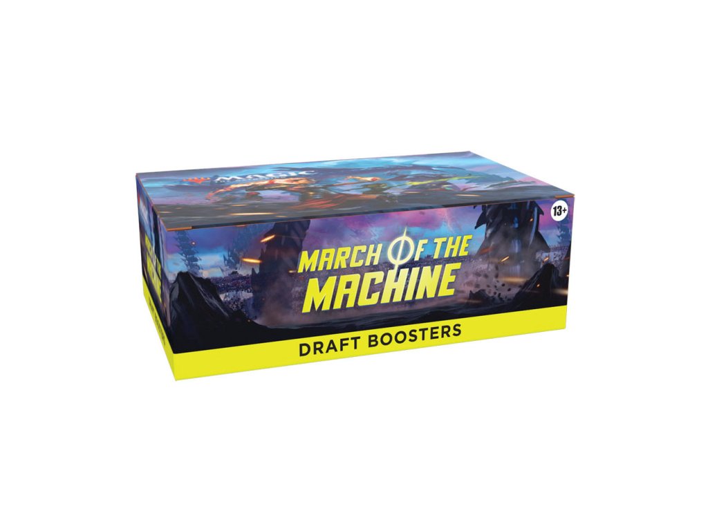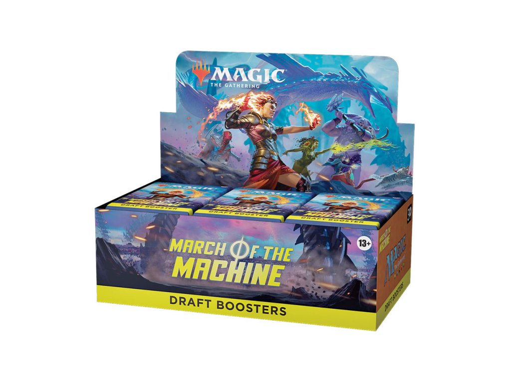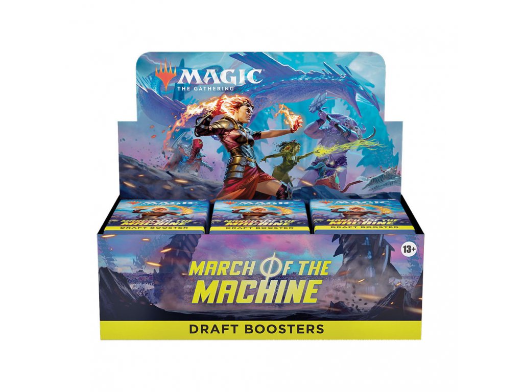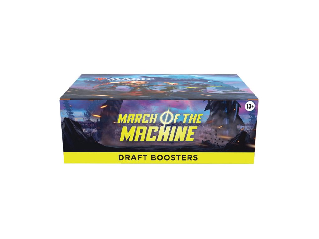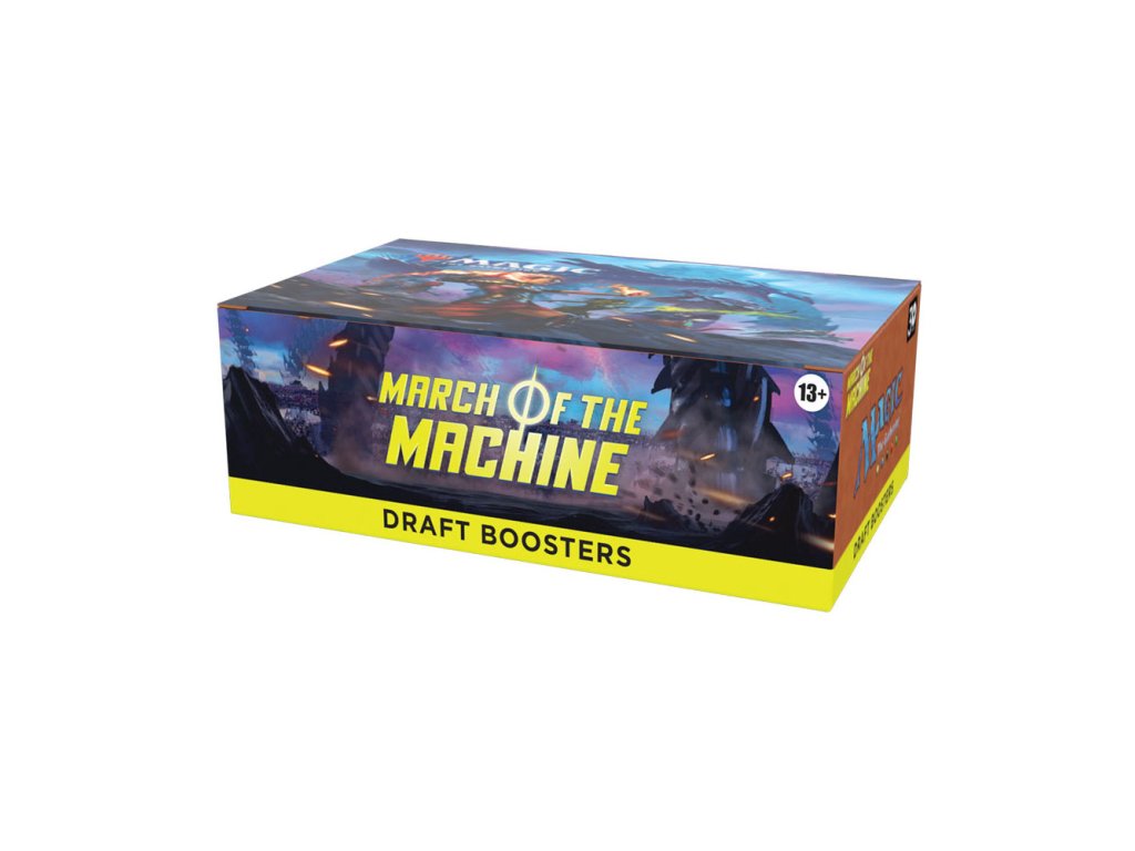 March of the Machine Draft Booster Box obsahuje 36 Draft Boosterů. Každý Draft booster obsahuje 15 karet a 1 token/reklamní kartu. Kombinace: 1 karta vzácnosti Rare nebo vyšší, 1 karta vzácnosti Uncommon nebo vyšší, 3 karty Uncommon a 10 karet Common. Karta země nahrazuje Common kartu ve 25 % boosterů. Tradiční foilová karta jakékoli vzácnosti nahrazuje Common ve 33 % boosterů.