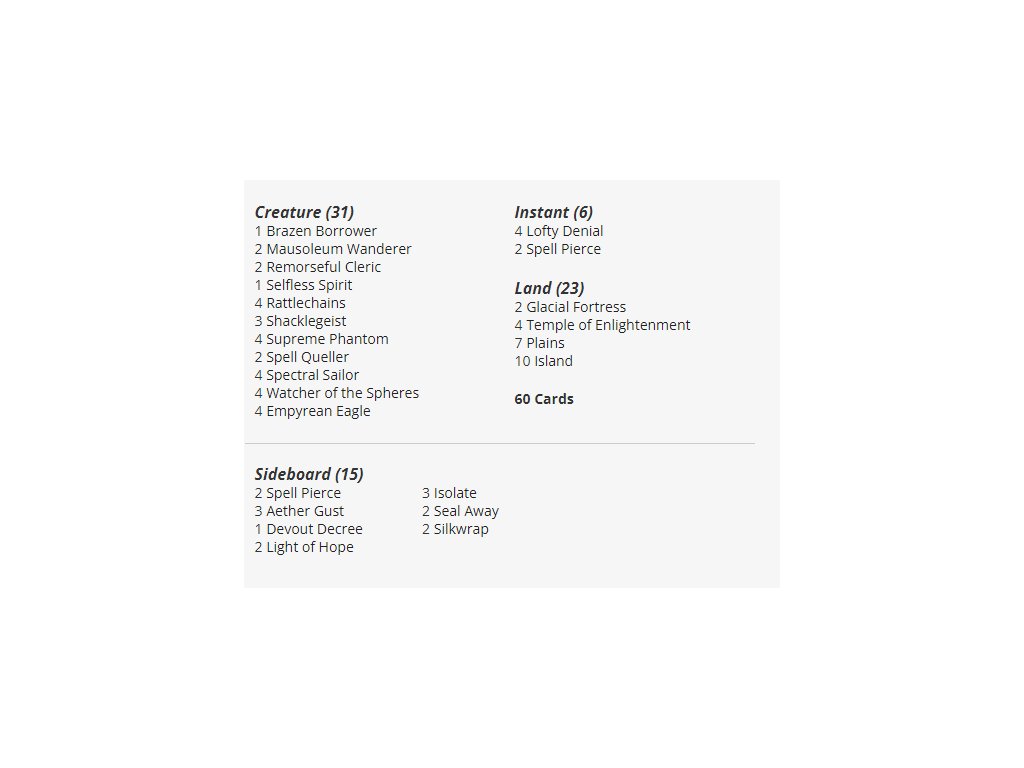 Azorius Spirits je modro-bílý deck zaměřený na Spirit tribal! Kontrolj hru a ovládni soupeře pomocí přízračné letky!