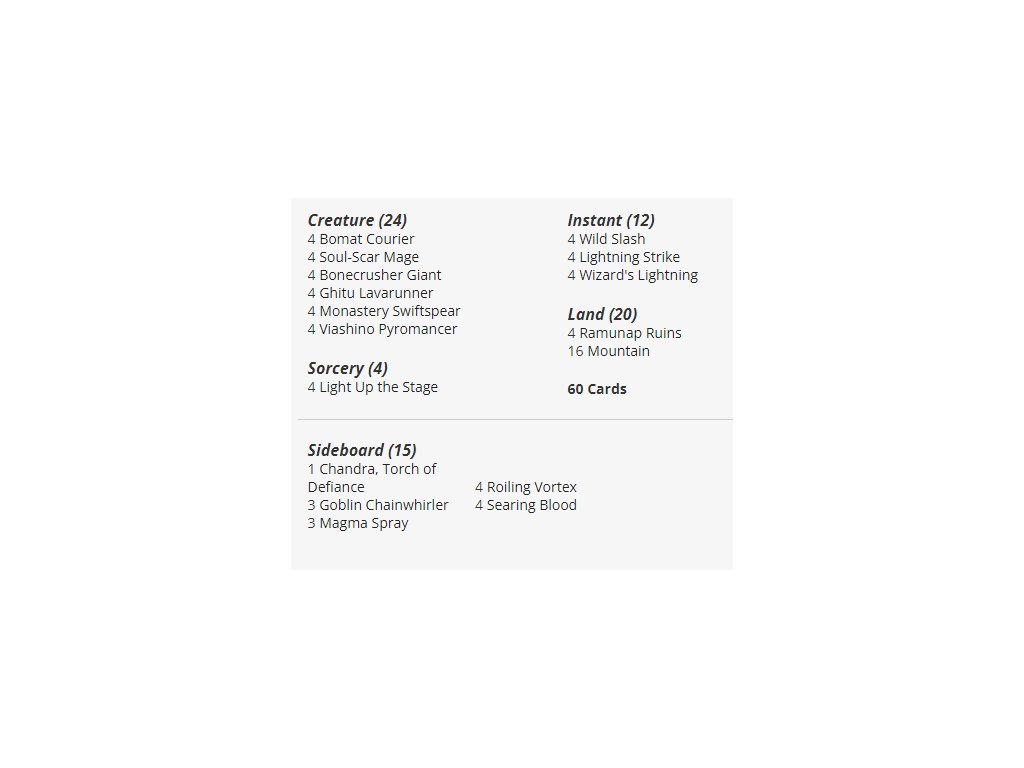 Mono Red Burn je červený balíček, který maximálně vystihuje jeho název. Upalte oponenta červenými kouzly a spoustou rychlých potvor!