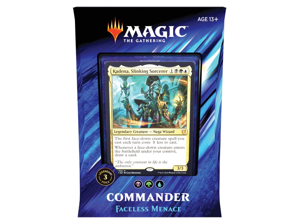 Nový set Commander 2019 s sebou přináší 4 balíky na motivy oblíbených klíčových slov (keywords) - Morph, Populate, Madness a Flashback. Morph je schopnost karty, která sahá do dávných dob, kdy Magic: the Gathering byl ještě bežnou karetní hrou. První Morph karty pamatují rok 2002 a edici Onslaught. Od té doby se vrátil Morph ve všemi oblíbené edici Khans of Tarkir a nyní ho tu máme znovu a lépe v celém Commander decku. Není tajemstvím, že "Morph" generála si přála komunita kartičkářů již dlouho a nyní se konečně dočkali. Kadena, Slinking Sorcerer je velmi univerzální kartou, která zlevňuje první Morph kartu zahranou v kole o 3 bezbarvé many, čímž ji činí hratelnou zdarma ihned po seslání. Tento Commander má v sobě zároveň zabudovanou karetní výhodu, což je vždy pro soupeře velmi nepříjemné. Morph karty jsou obecně velmi zajímavé, neboť pouze Vy víte, co na stůl sesíláte a necháváte tak soupeře tápat nad tím, co zrovna na stole máte a čím jej můžete překvapit.
