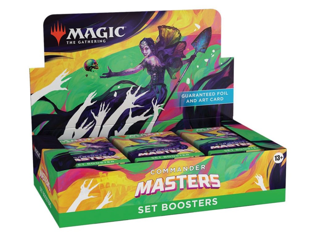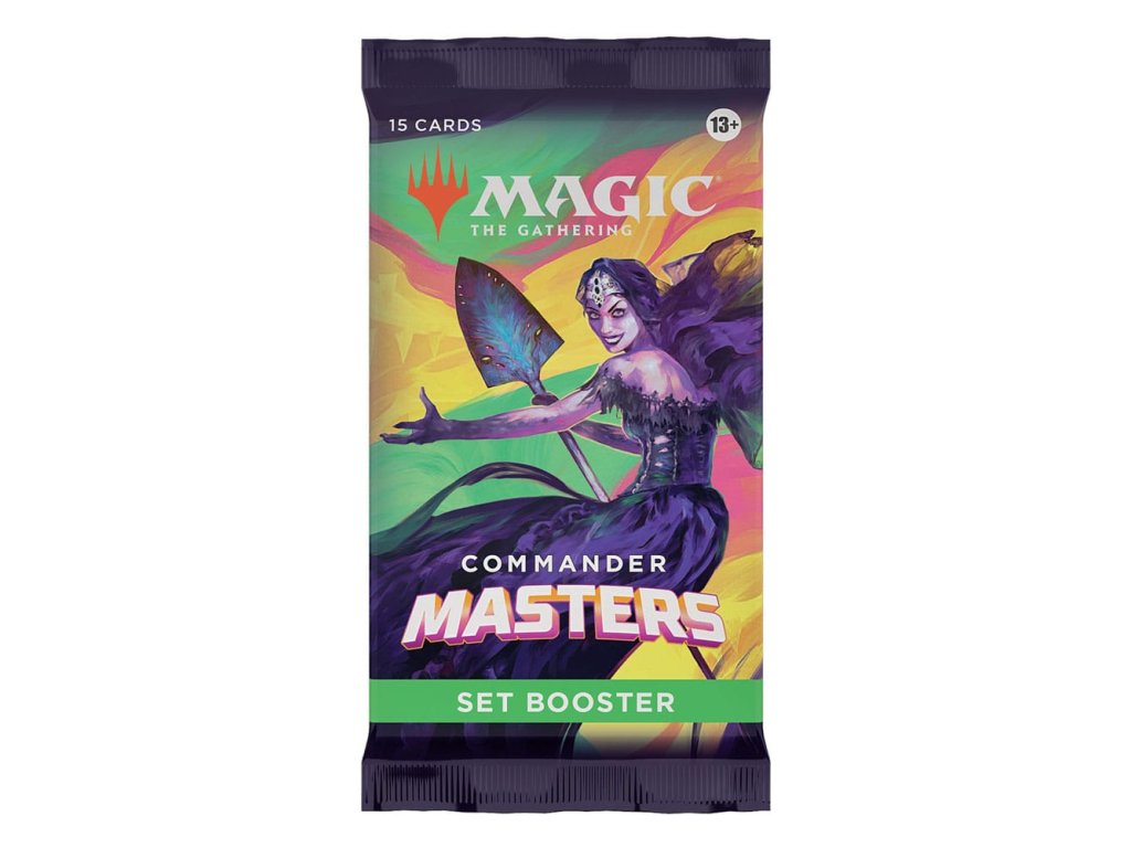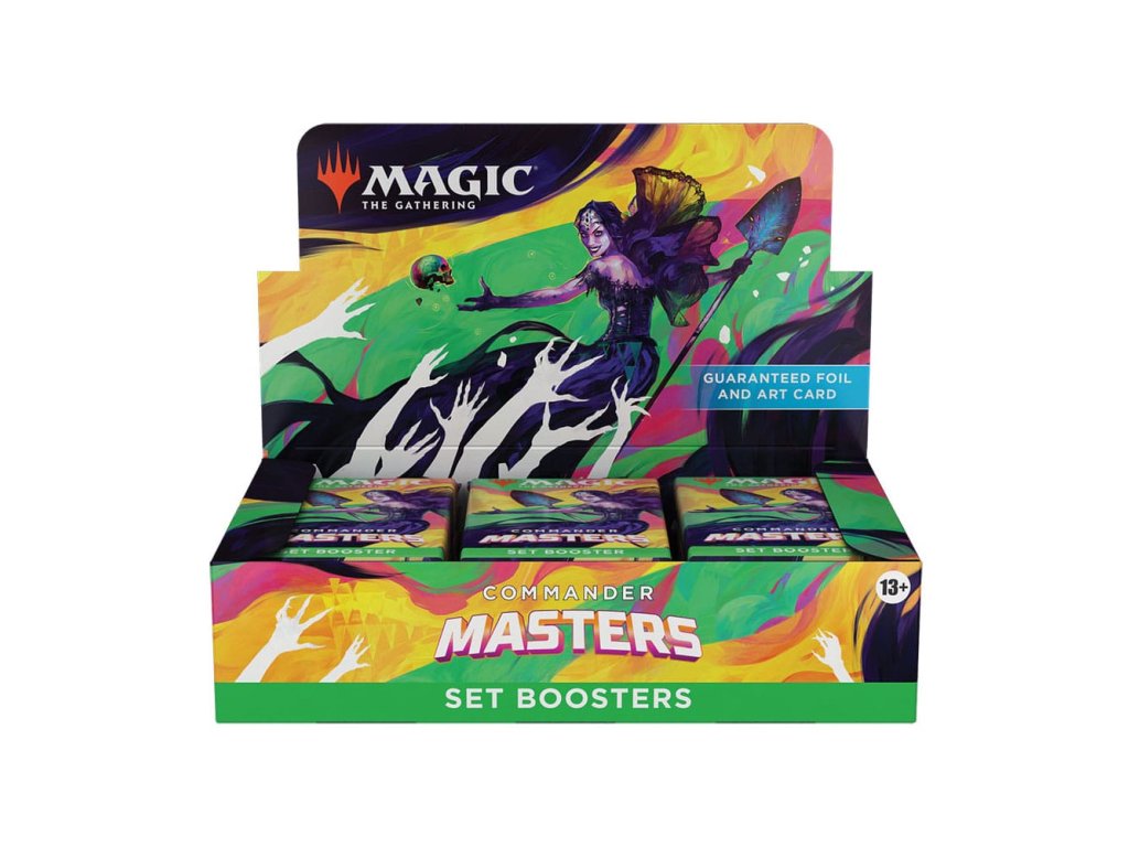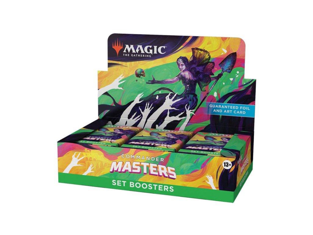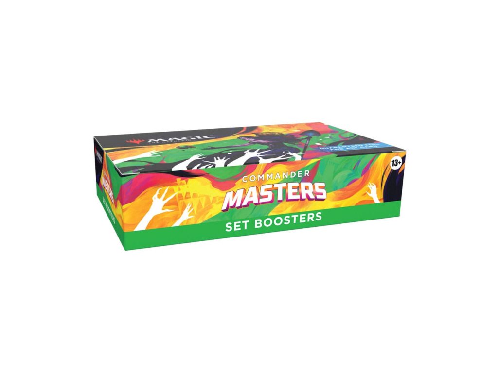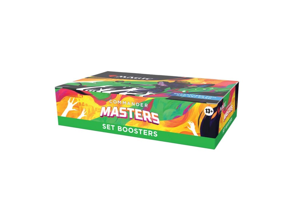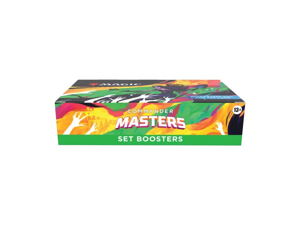 Commander Masters Set Booster Box obsahuje 24 Commander Masters Set Boosterů. Každý Set Booster obsahuje 15 karet Magicu, 1 Art kartu a 1 token/reklamní kartu nebo kartu z "The List" (speciální karta z historie Magicu - nachází se ve 25 % packů), včetně 2-6 karet vzácnosti Rare nebo vyšší (2: 34 %; 3: 48 %; 4: 15 %; 5: 2 %; 6: <1 %) a 3-8 Uncommon, 4-8 Common a 1 Land karet. Každý pack obsahuje alespoň 1 Traditional Foil kartu libovolné vzácnosti. Traditional Foil Land nahrazuje základní zemi ve 20 % Set Boosterů a Foil-Stamped Signature Art karta nahrazuje Art kartu v 10 % Set Boosterů. Traditional Foil Borderless Mythic Rare karta se nachází v 1 % boosterů.