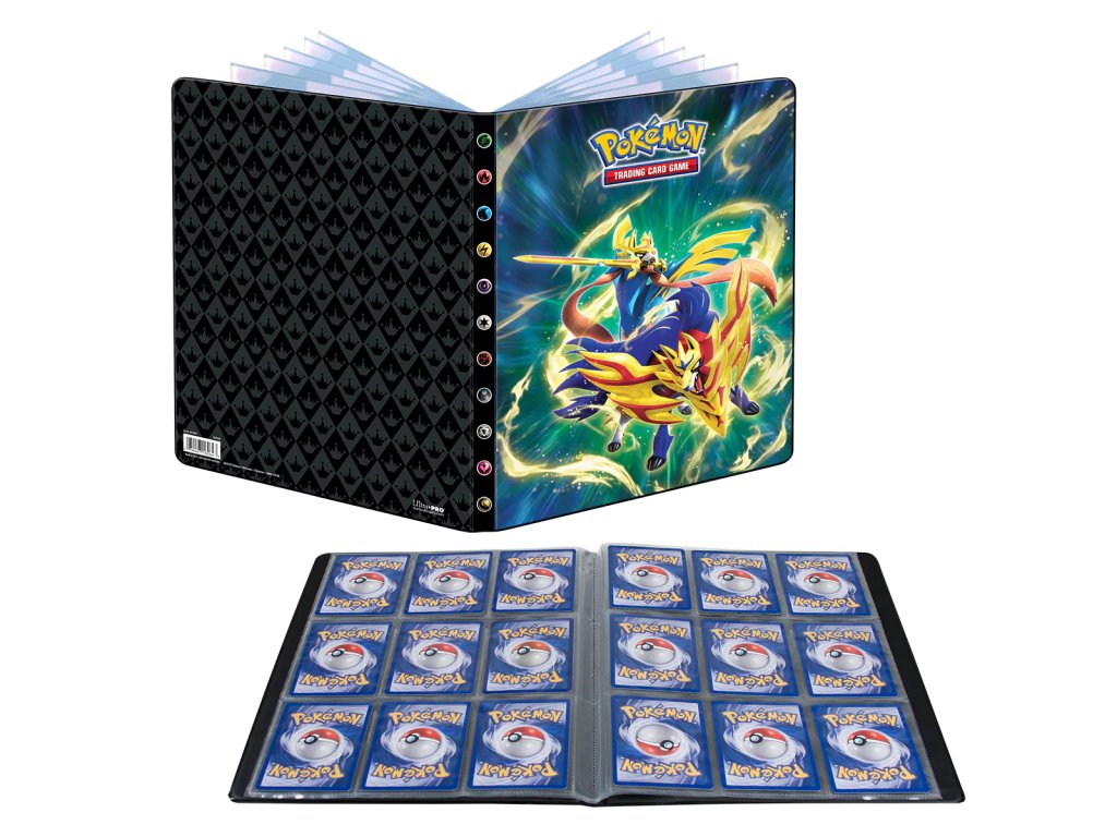 9-místné album pro Pokémony se vyznačuje zářivým, celoplošným obalem s Crowned Sword Zacian a Crowned Shield Zamazenta. Album uchovává a chrání až 126 karet standardní velikosti jednostranně vložených a 252 karet oboustranně vložených na polypropylenových archivačně bezpečných stránkách. Vyrobeno v Kalifornii, USA.