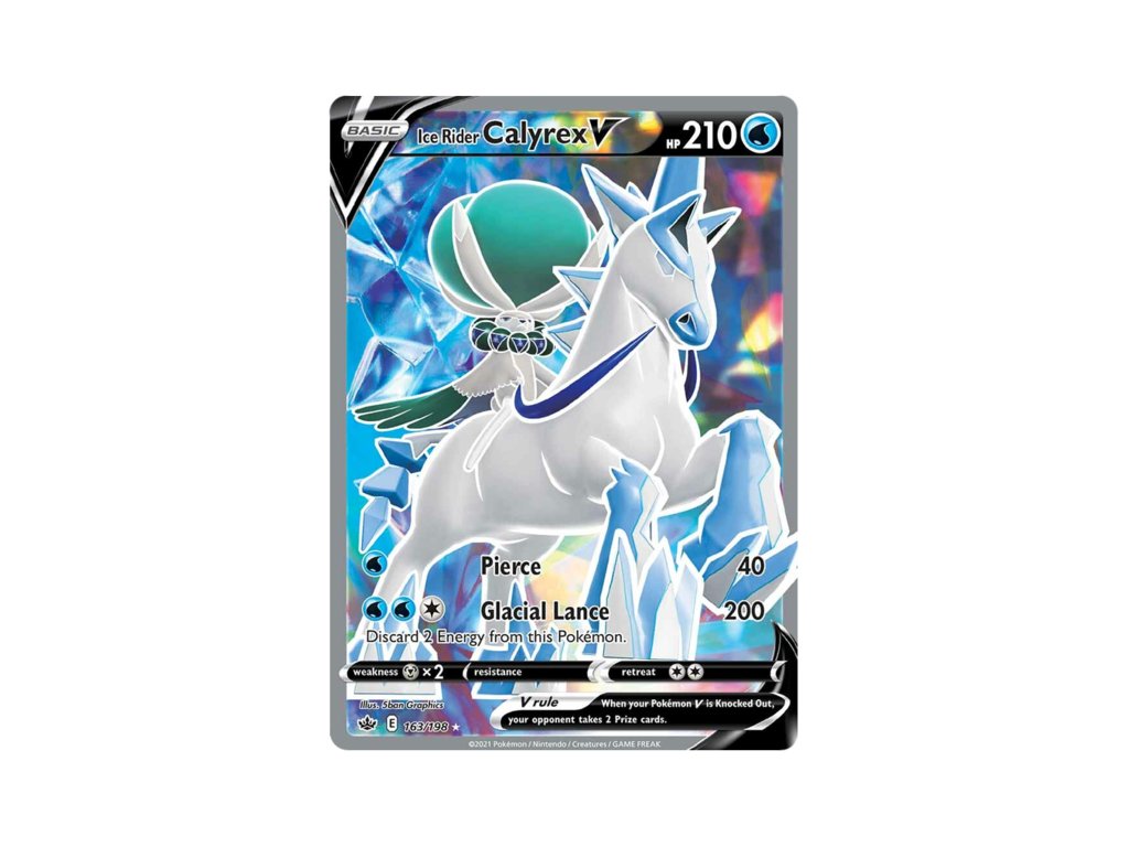 V tomto boxu jej najdete provedení Ice Rider Calyrexe "Pokémon V" a to ve dvou variantách – foilovém promo a oversized kartě. Samozřejmostí je i čtveřice Booster Packů, která rozšíří parádně každou hráčskou kolekci.
