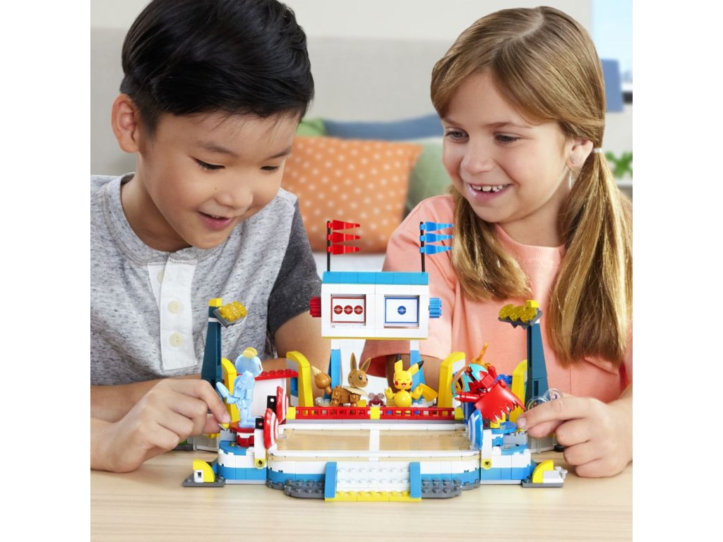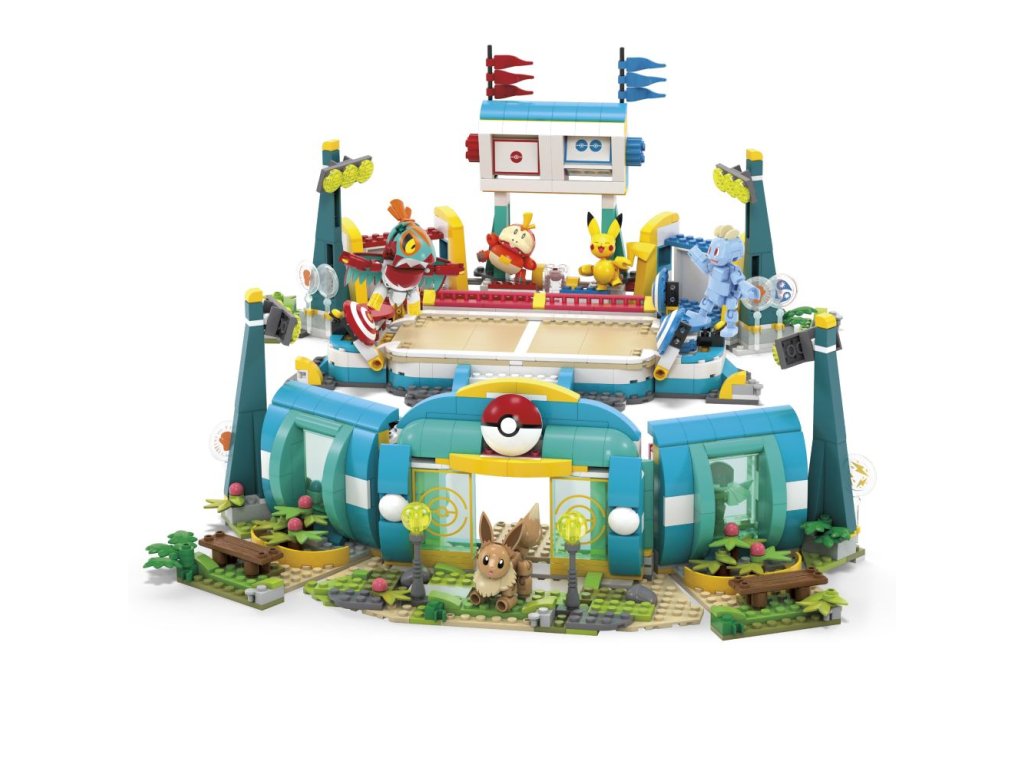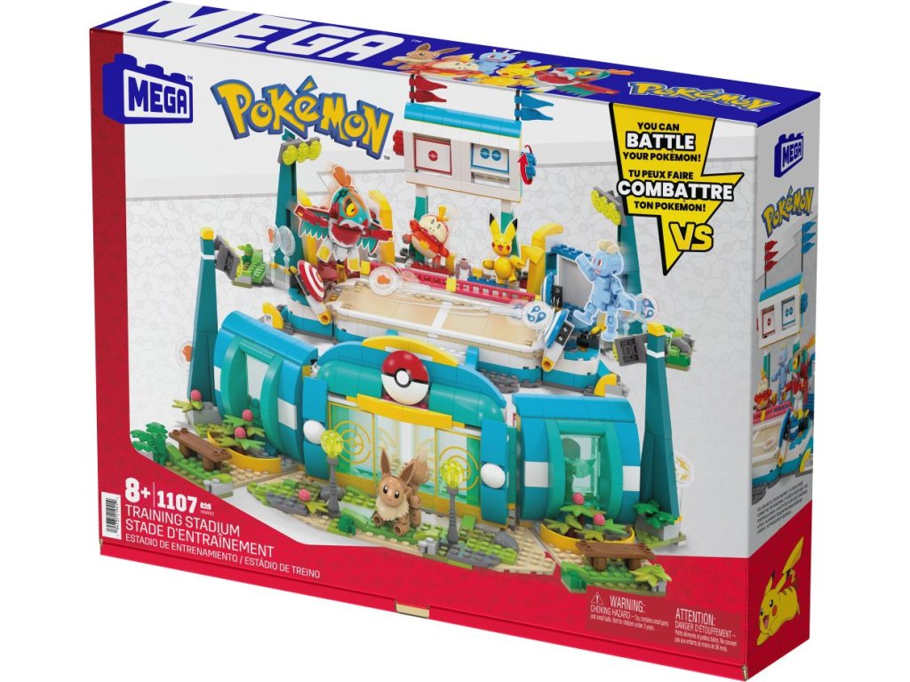 Vytvářejte pokémoní bitvy pomocí tréninkového stadionu! Trenéři si mohou postavit stadion a pak pomocí vestavěných odpalovacích zařízení bojovat se svými pokémony v aréně. Poté mohou otočit klikou a sledovat, jak diváci jásají. Součástí tohoto setu je dokonce i tabule na zapisování skóre, stanice pro Poké Ball a funkční dveře!