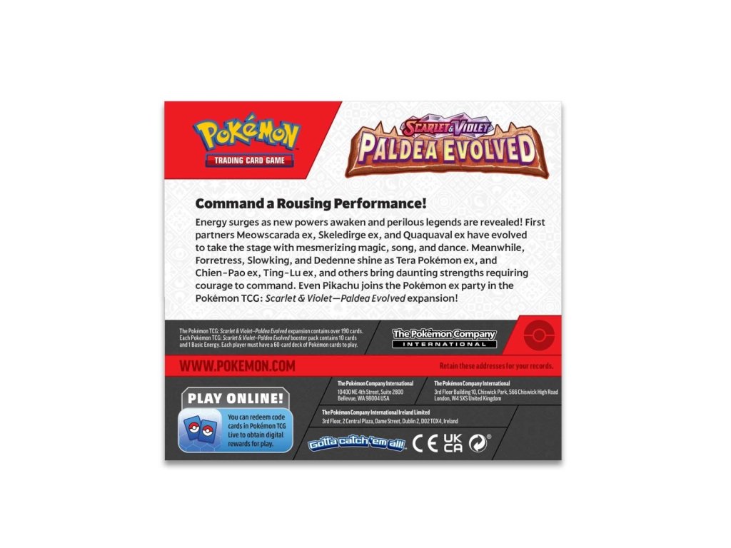 Energie stoupá, probouzejí se nové síly a odhalují se hrozivé legendy! První parťáci Meowscarada ex, Skeledirge ex a Quaquaval ex se vyvinuli, aby vystoupili na scénu s fascinující magií, zpěvem a tancem. Mezitím Forretress, Slowking a Dedenne zazáří jako Tera Pokémon ex a Chien-Pao ex, Ting-Lu ex a další přinesou děsivé síly a budou vyžadovat kuráž při jejich vedení. V rozšíření Pokémon TCG: Scarlet & Violet Paldea Evolved se do party Pokémon ex přidá dokonce i Pikachu!