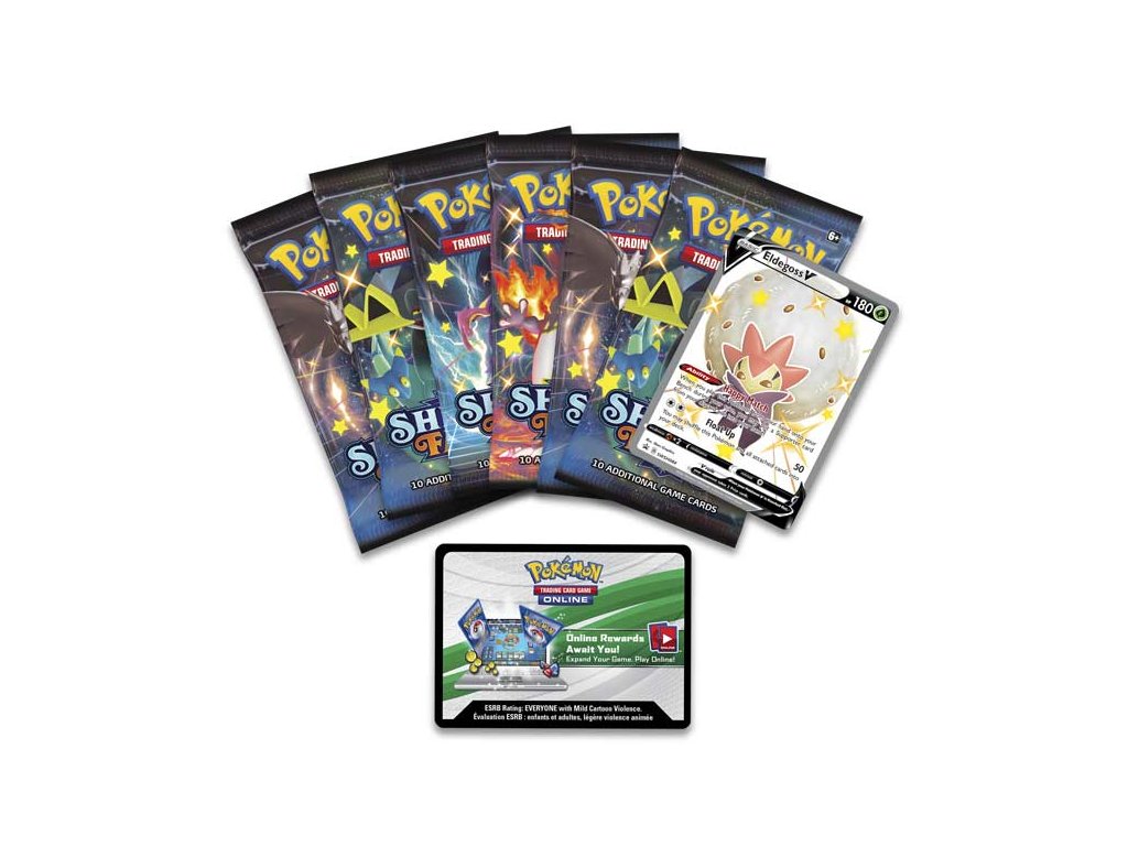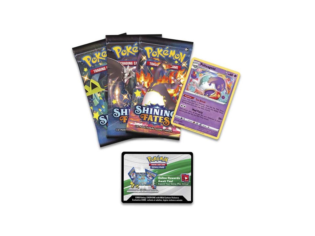 - 3 Pokémon TCG: Shining Fates Booster packů, každý obsahuje 10 karet a kartu základní energie