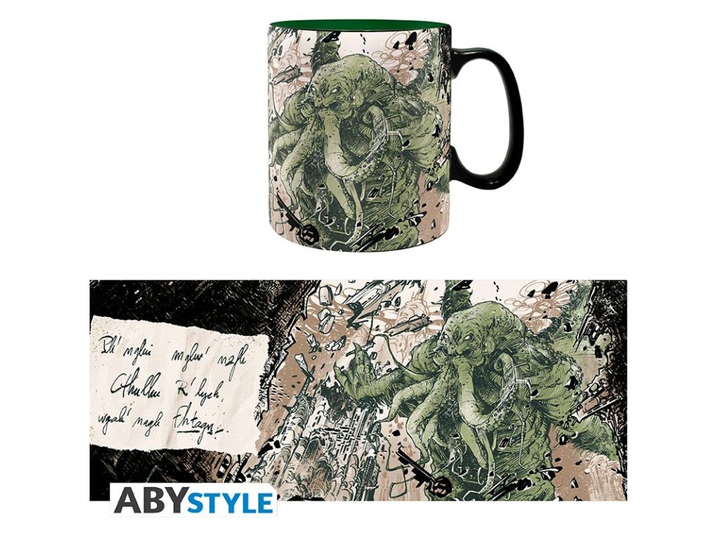 Vypijte hrnek až do dna a dopřejte si šílených vizí prastarého Cthulhu! Stačí jen pohlédnout na dno... Krásný hrnek pro milovníky hororů od H. P. Lovecrafta.
